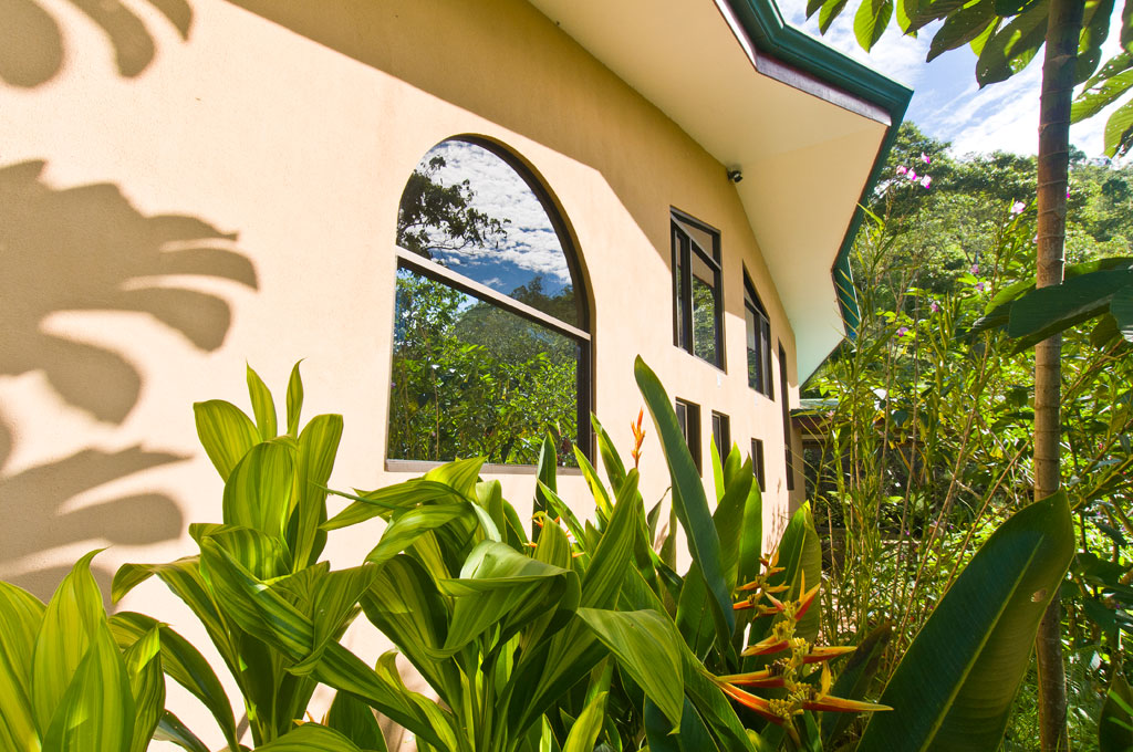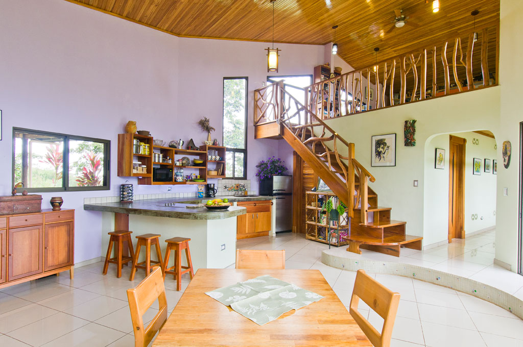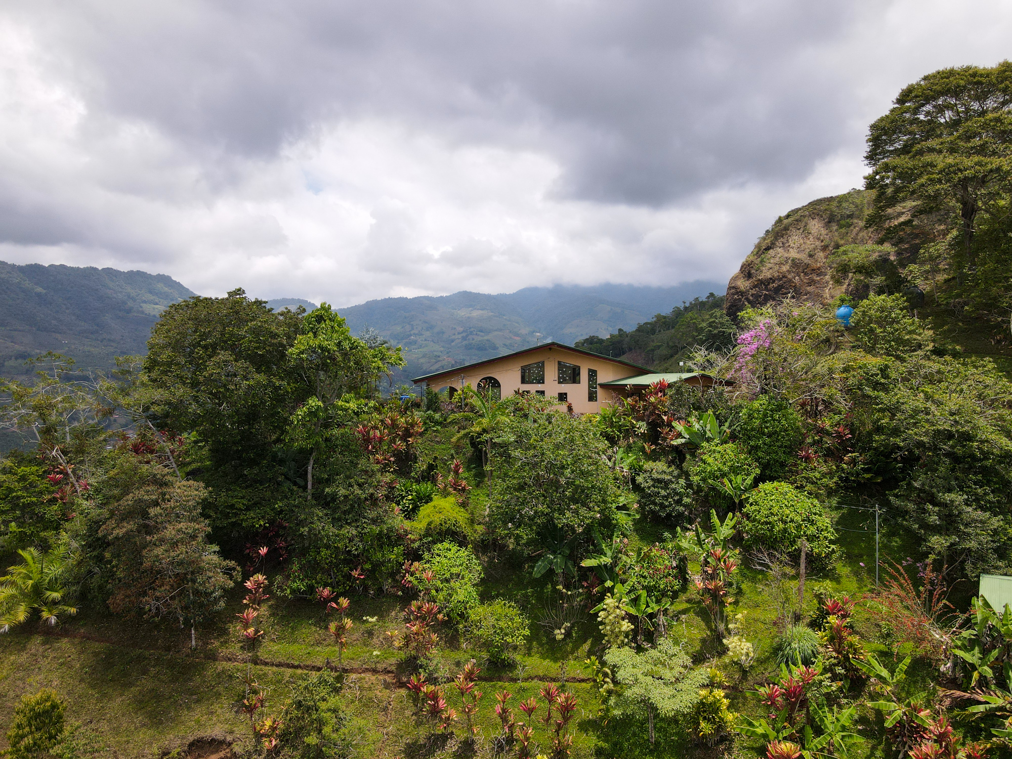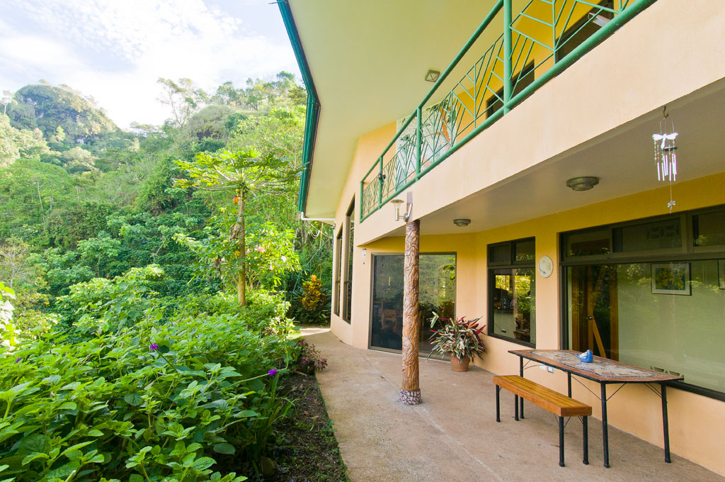 About half the land is unspoiled secondary forest. The home is surrounded by terraced landscaping including an abundance of fruit trees, organic coffee, and bananas.