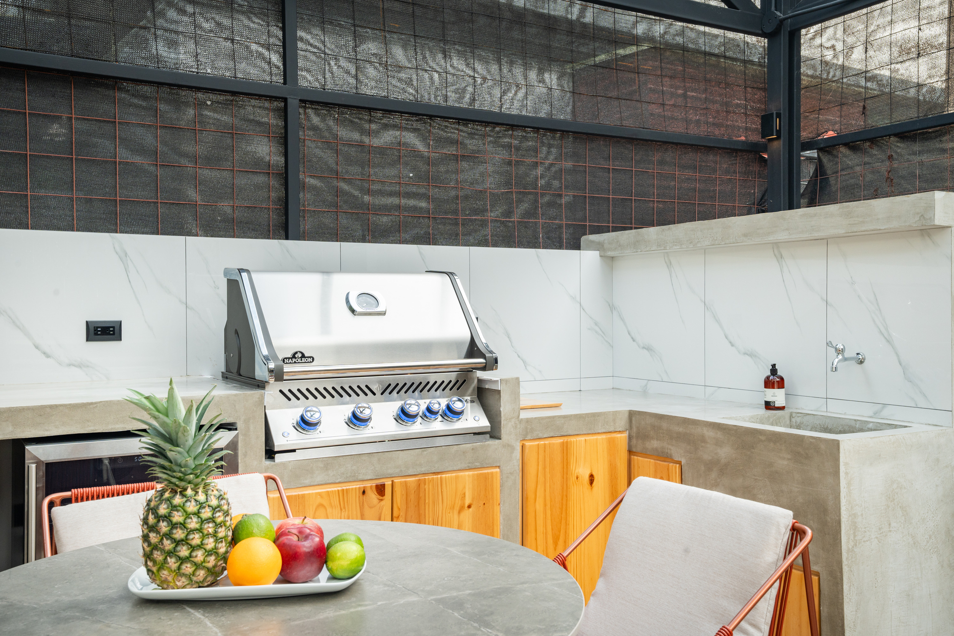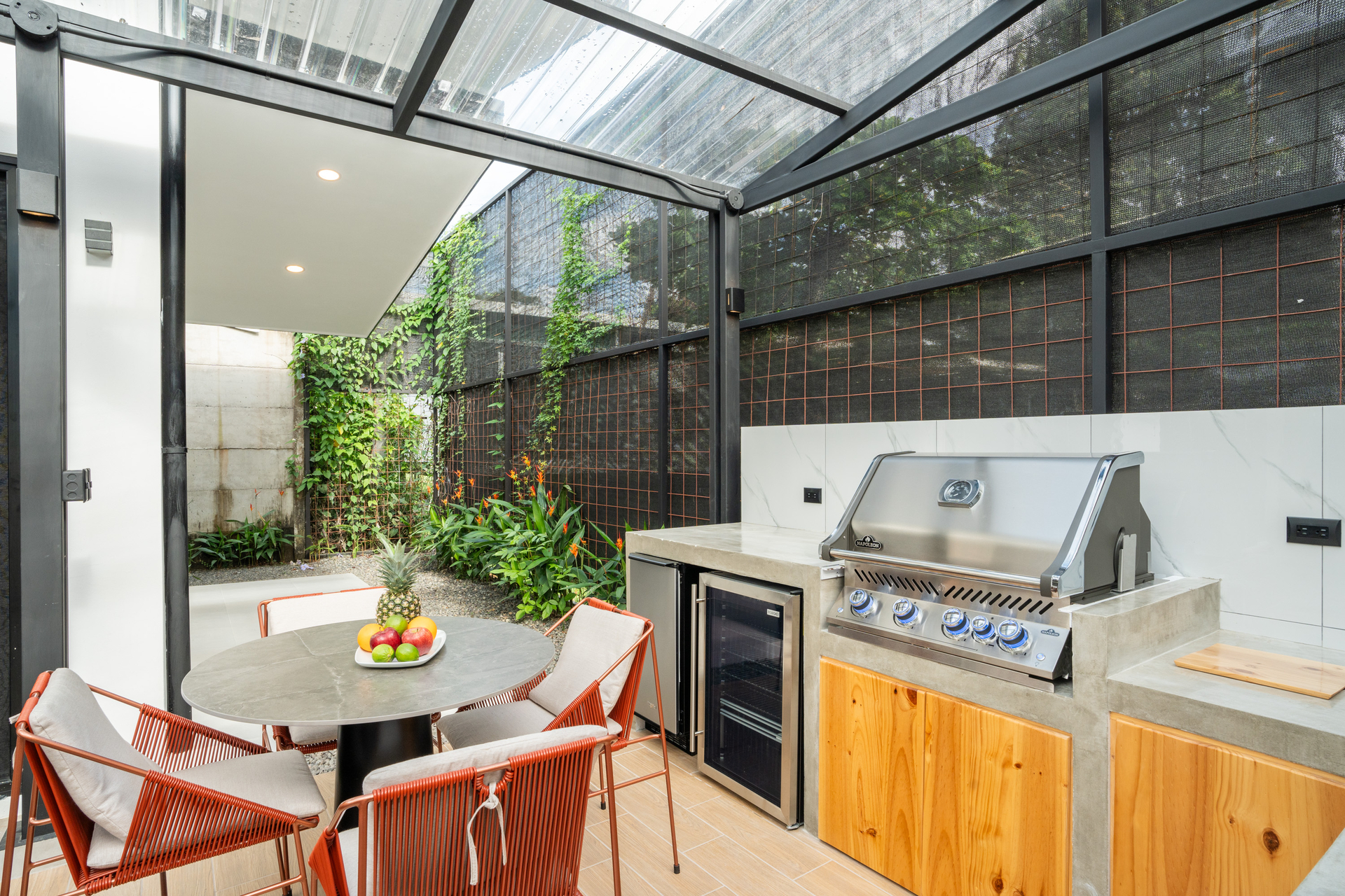 Step outside to a beautifully landscaped backyard with a private pool and a covered outdoor dining area. The built-in Napoleon 700 Series BBQ grill makes entertaining effortless.