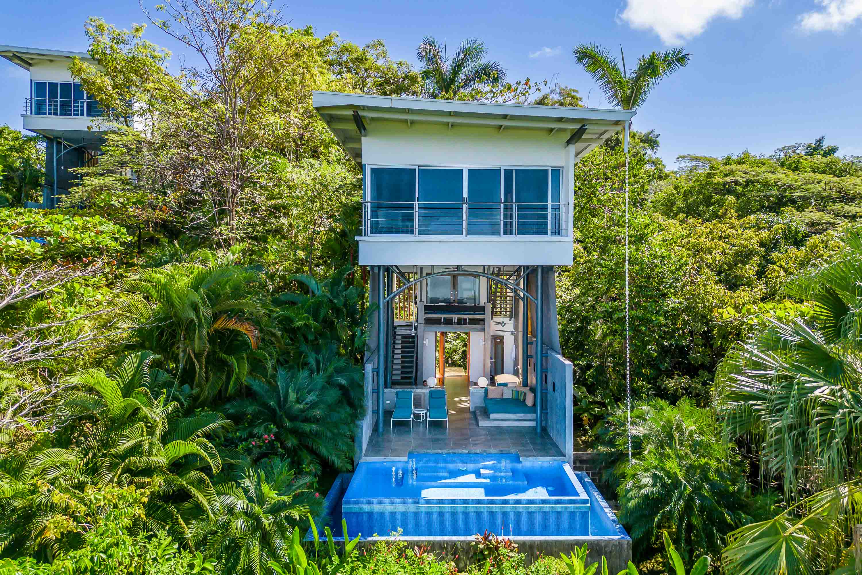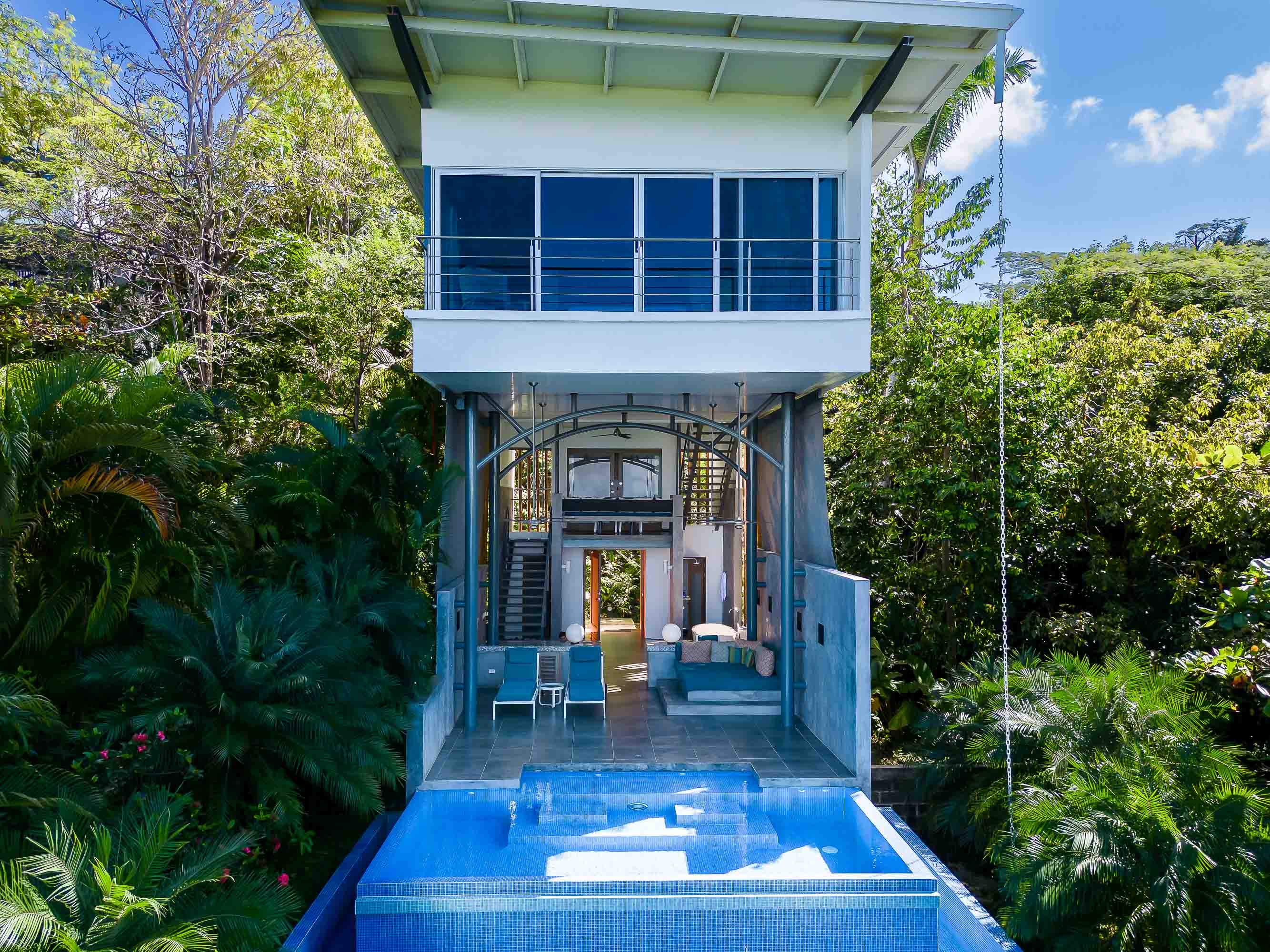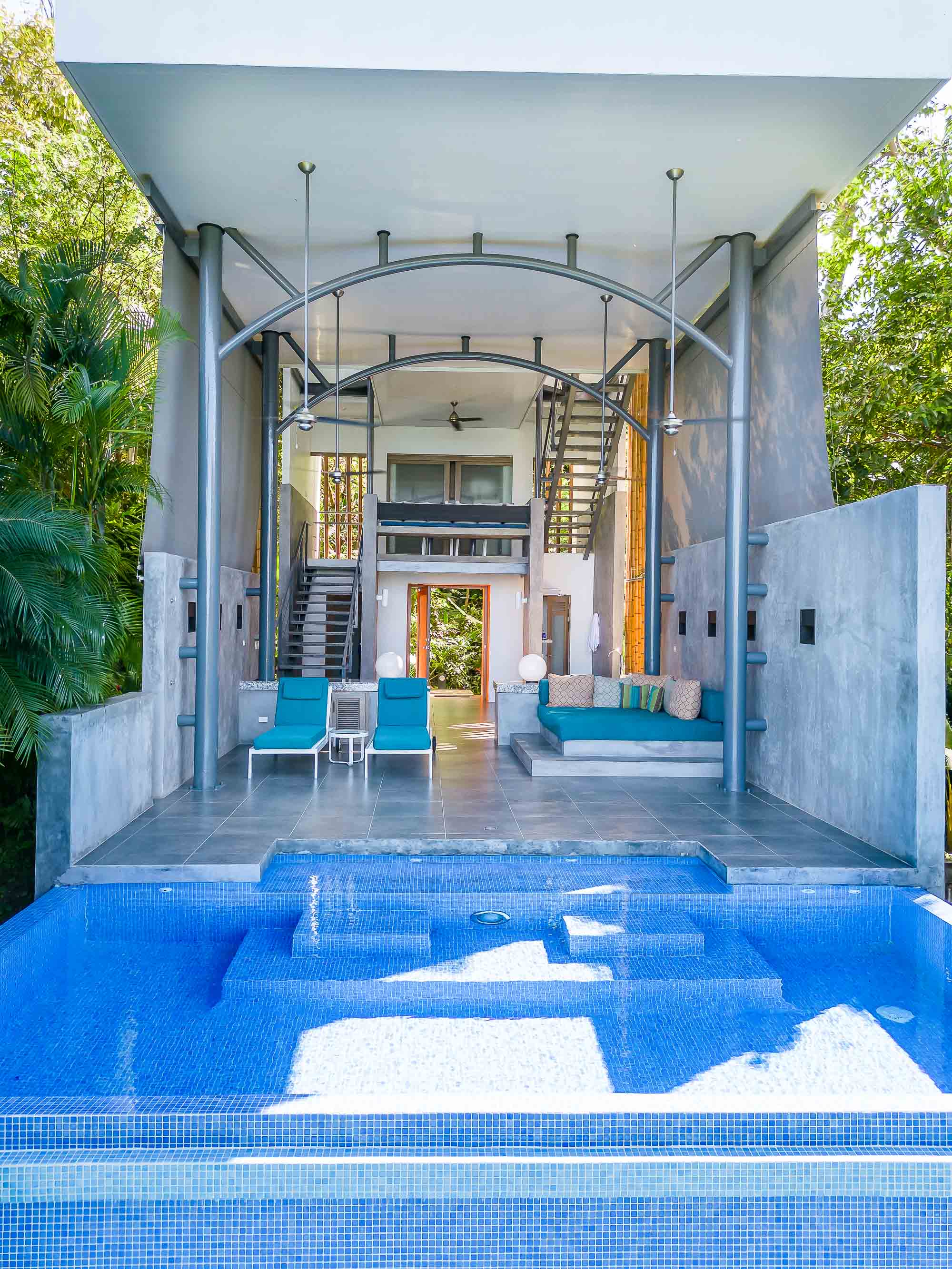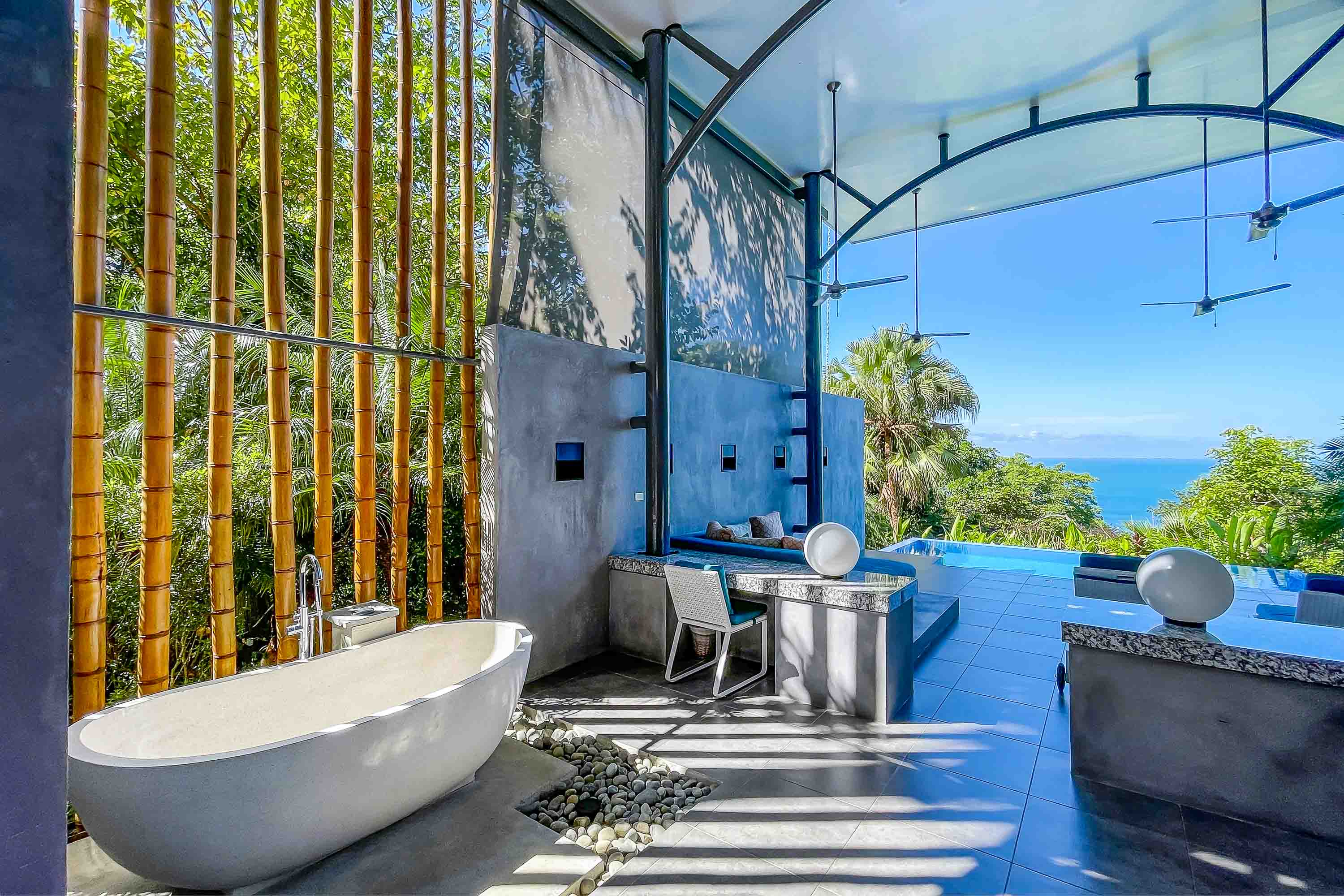 Upon arrival at the Bamboo Villas you enter a unique private estate within Tulemar. There is an open air pavilion which serves as the private reception for owners and guests. Each couple arriving is received by the private staff who are on call as 24 hour personal concierges. The three villas all offer the same layout and design, but each has a unique location, view and potential for additional development. You approach each villa through the tropical landscaped gardens into an open air living space which takes your breath away. There is a private plunge pool, lounging beds, open air shower and stone bath tub that is both hidden for privacy but exposed to create a sensual space where guests get to live immersed in the natural settings. The second level hosts lofted kitchenette, dining and office space which overlooks the ocean and common area below. This space is ideal for anything from a light morning coffee to custom chef service for a private dining experience that is second to none . The top floor of each villa is a magical oasis which provides panoramic, sunset ocean views as well as of the vibrant rainforest canopy. Each Villa is equipped with a luxurious king size bed and a master bathroom fit for a king and queen. Everything has been crafted with couples and rental potential in mind, and staying true to this market has proven an incredibly successful model. The design highlights the amazing views, tropical surroundings, cooling tropical breezes and and the sensuality of the magical natural beauty of Manuel Antonio.