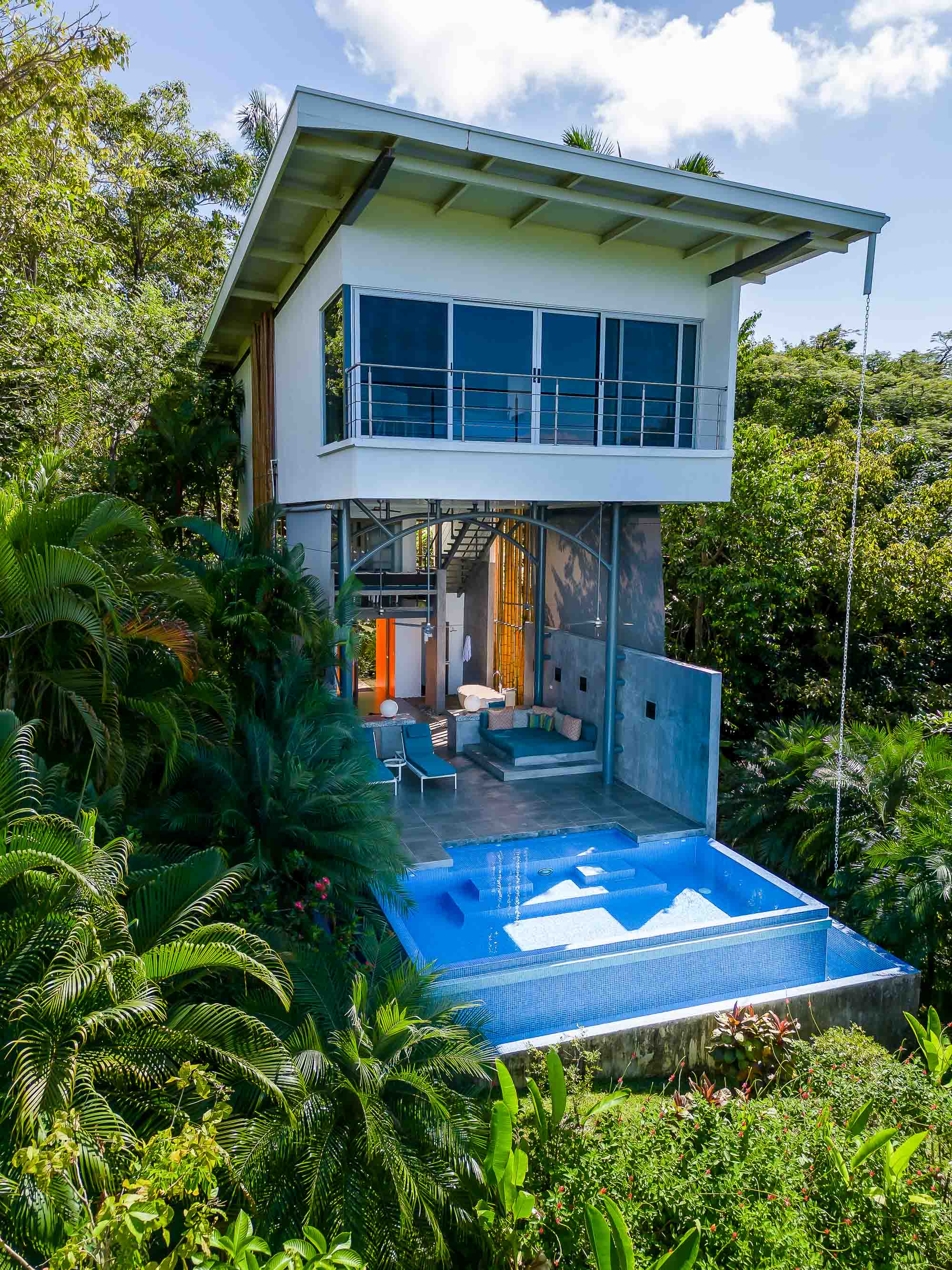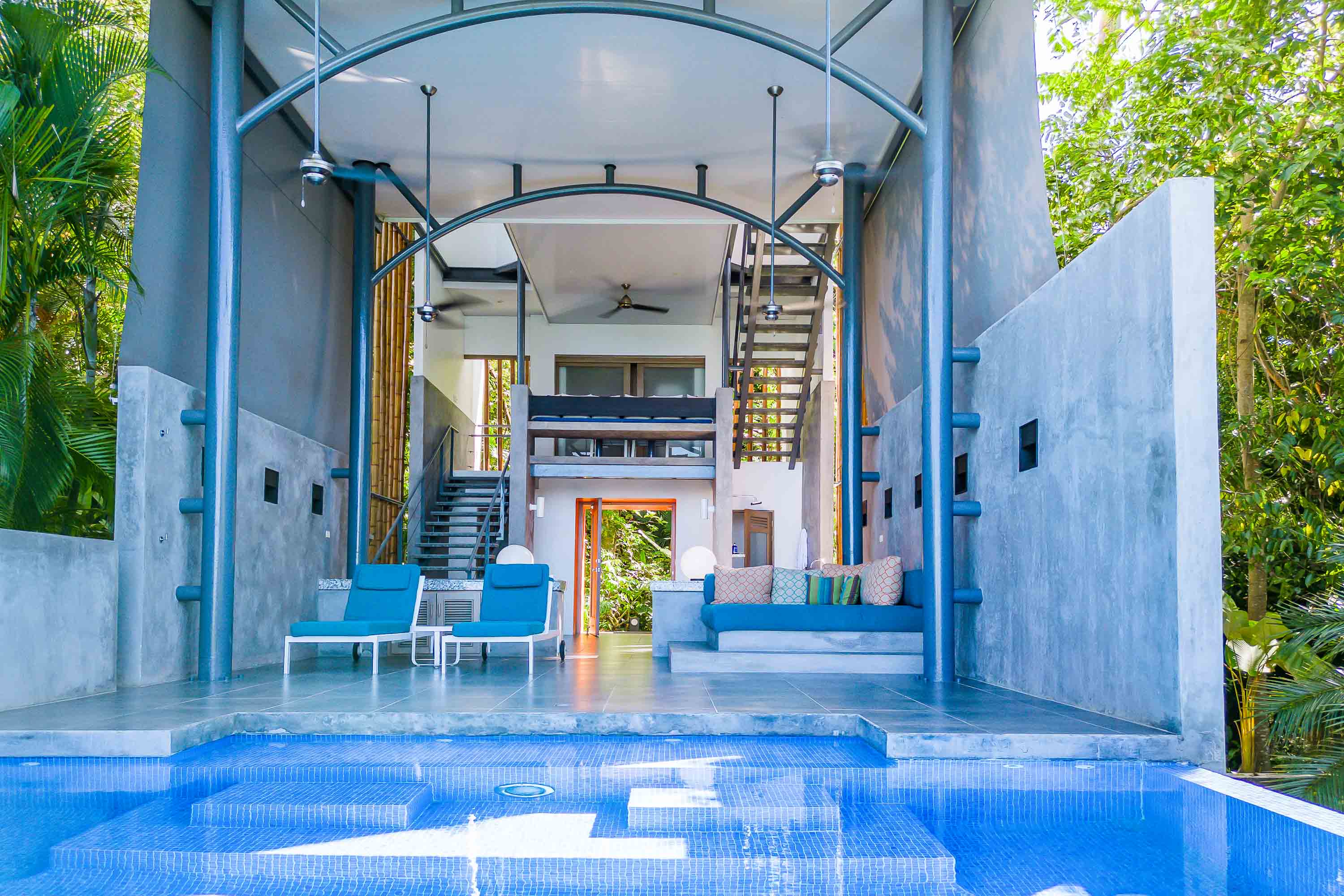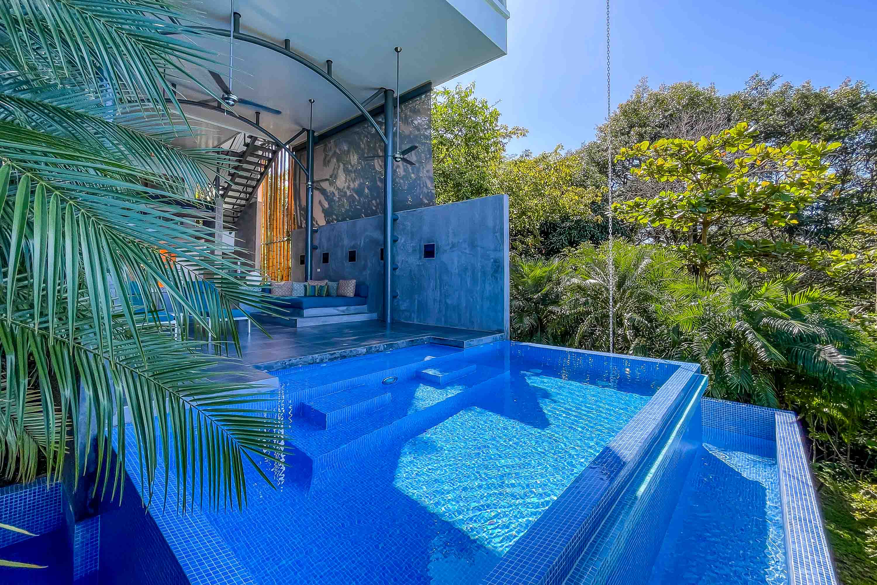 Upon arrival at the Bamboo Villas you enter a unique private estate within Tulemar. There is an open air pavilion which serves as the private reception for owners and guests. Each couple arriving is received by the private staff who are on call as 24 hour personal concierges. The three villas all offer the same layout and design, but each has a unique location, view and potential for additional development. You approach each villa through the tropical landscaped gardens into an open air living space which takes your breath away. There is a private plunge pool, lounging beds, open air shower and stone bath tub that is both hidden for privacy but exposed to create a sensual space where guests get to live immersed in the natural settings. The second level hosts lofted kitchenette, dining and office space which overlooks the ocean and common area below. This space is ideal for anything from a light morning coffee to custom chef service for a private dining experience that is second to none . The top floor of each villa is a magical oasis which provides panoramic, sunset ocean views as well as of the vibrant rainforest canopy. Each Villa is equipped with a luxurious king size bed and a master bathroom fit for a king and queen. Everything has been crafted with couples and rental potential in mind, and staying true to this market has proven an incredibly successful model. The design highlights the amazing views, tropical surroundings, cooling tropical breezes and and the sensuality of the magical natural beauty of Manuel Antonio.