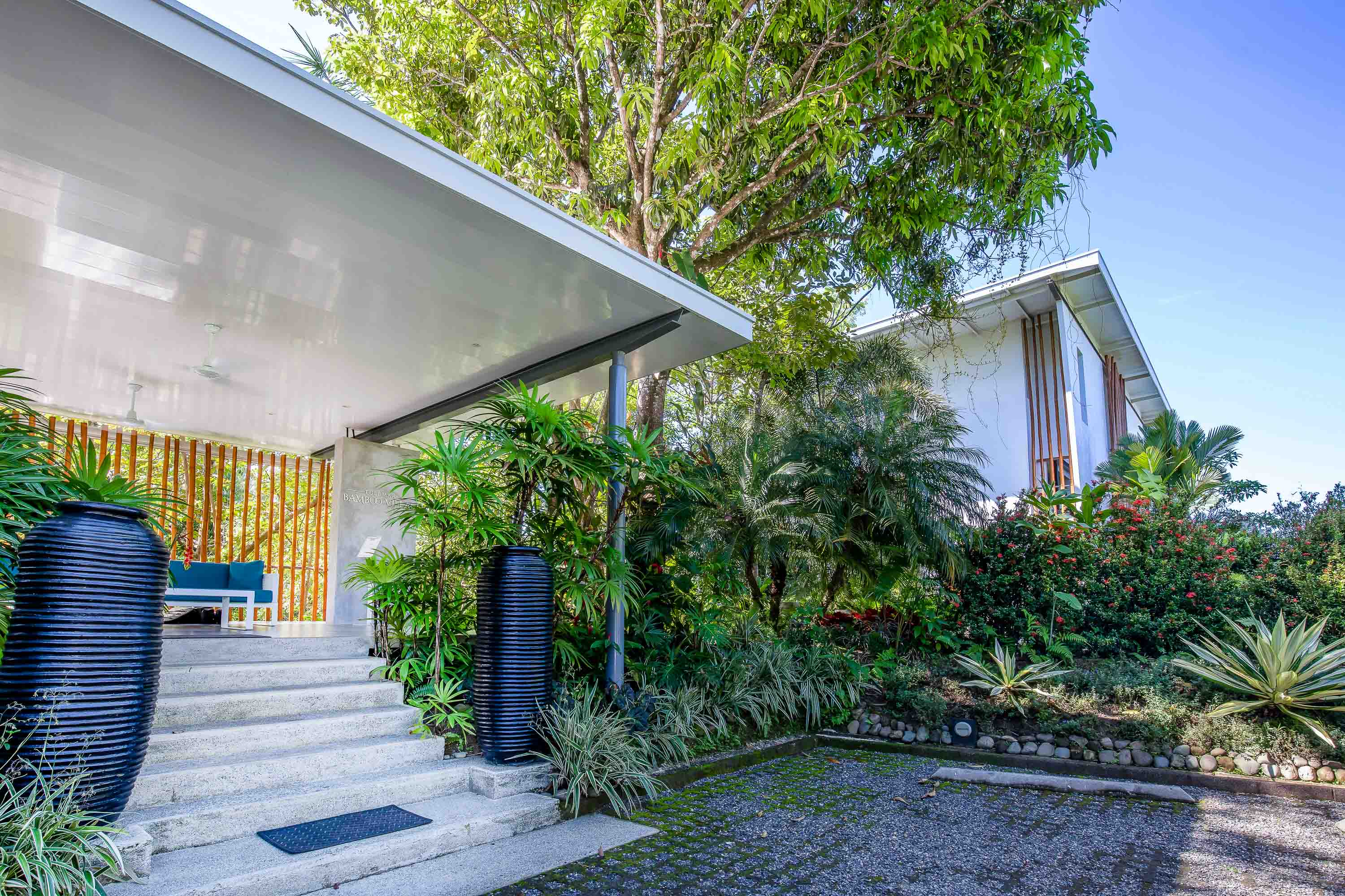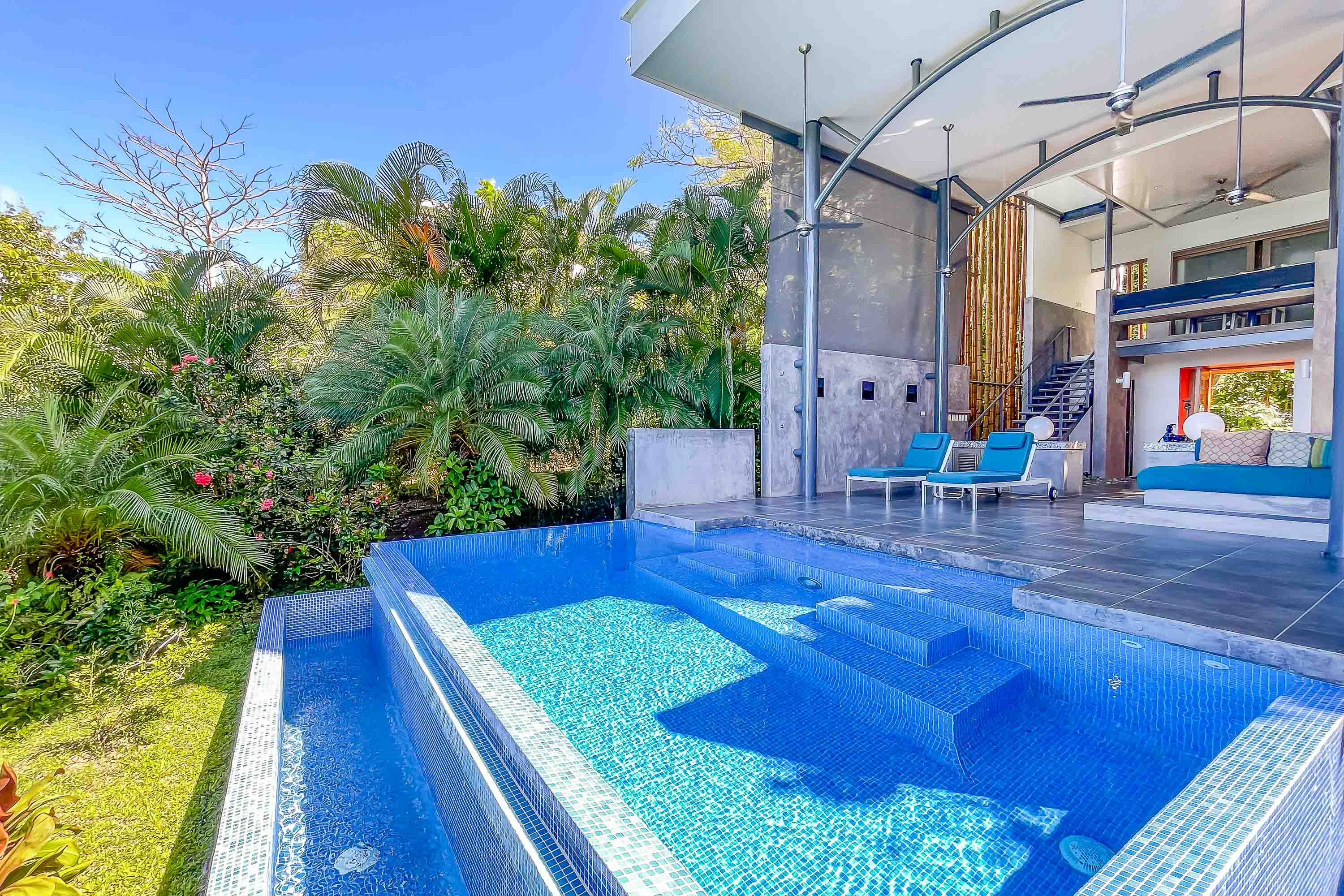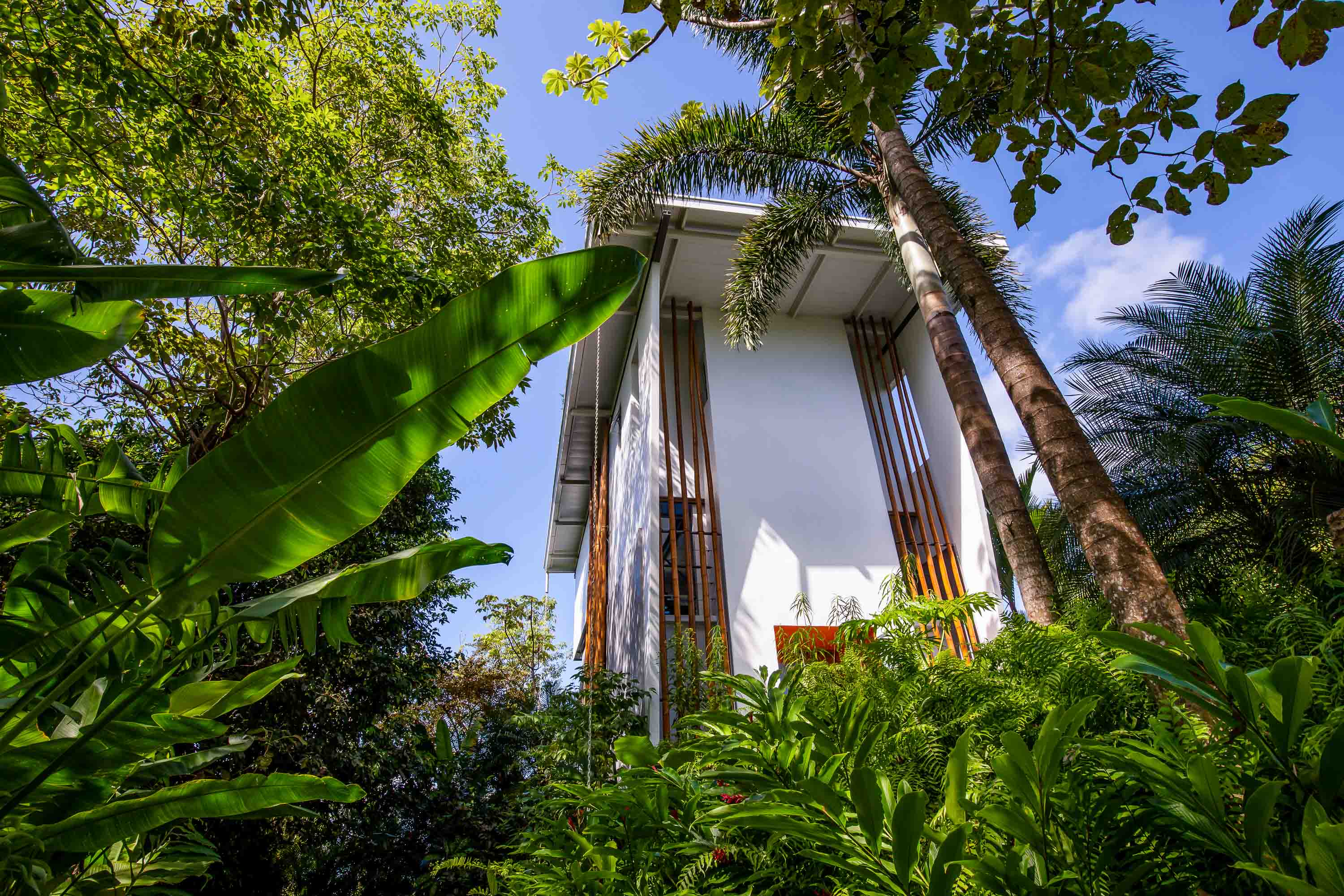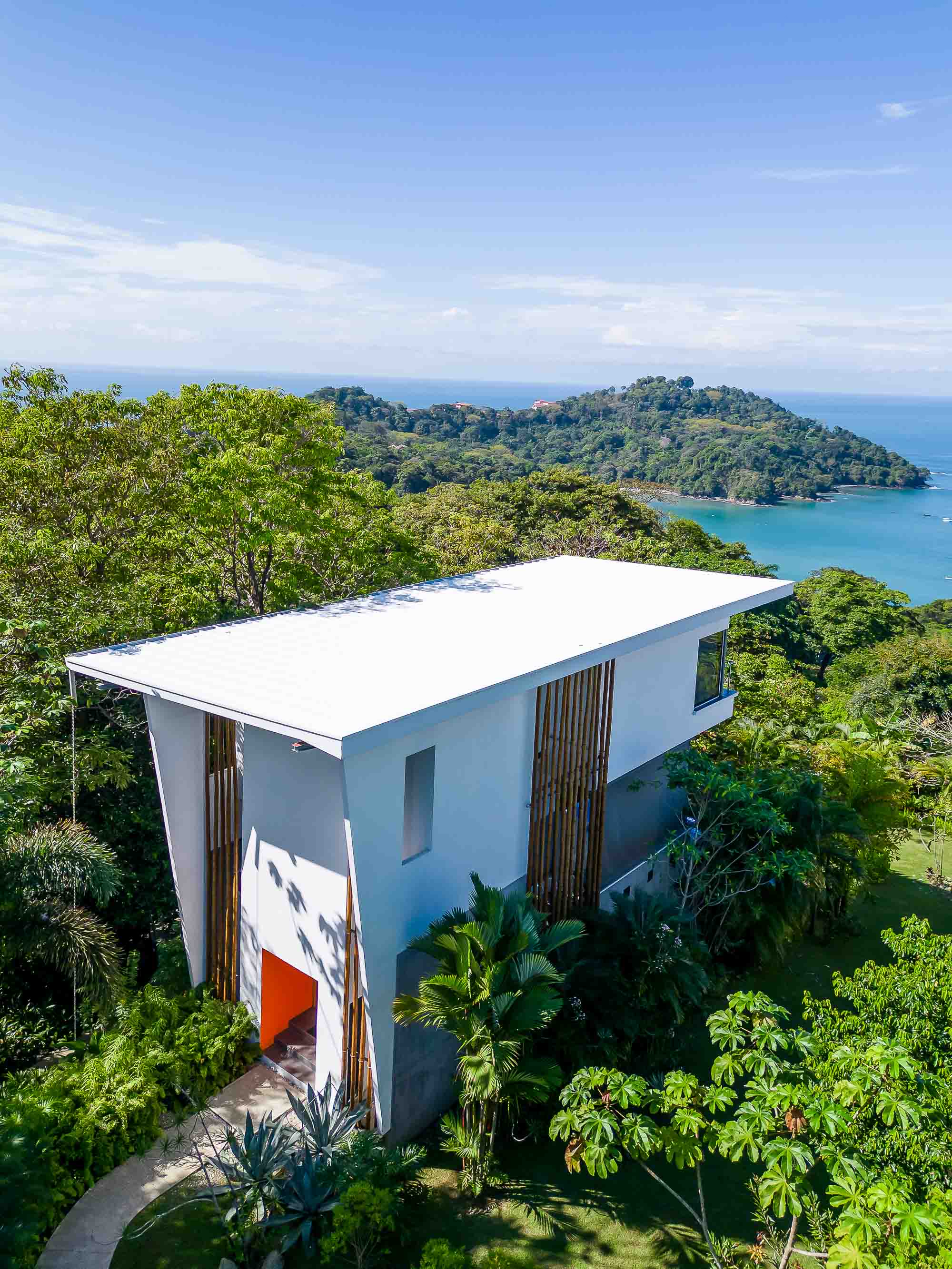 Upon arrival at the Bamboo Villas you enter a unique private estate within Tulemar. There is an open air pavilion which serves as the private reception for owners and guests. Each couple arriving is received by the private staff who are on call as 24 hour personal concierges. The three villas all offer the same layout and design, but each has a unique location, view and potential for additional development. You approach each villa through the tropical landscaped gardens into an open air living space which takes your breath away. There is a private plunge pool, lounging beds, open air shower and stone bath tub that is both hidden for privacy but exposed to create a sensual space where guests get to live immersed in the natural settings. The second level hosts lofted kitchenette, dining and office space which overlooks the ocean and common area below. This space is ideal for anything from a light morning coffee to custom chef service for a private dining experience that is second to none . The top floor of each villa is a magical oasis which provides panoramic, sunset ocean views as well as of the vibrant rainforest canopy. Each Villa is equipped with a luxurious king size bed and a master bathroom fit for a king and queen. Everything has been crafted with couples and rental potential in mind, and staying true to this market has proven an incredibly successful model. The design highlights the amazing views, tropical surroundings, cooling tropical breezes and and the sensuality of the magical natural beauty of Manuel Antonio.