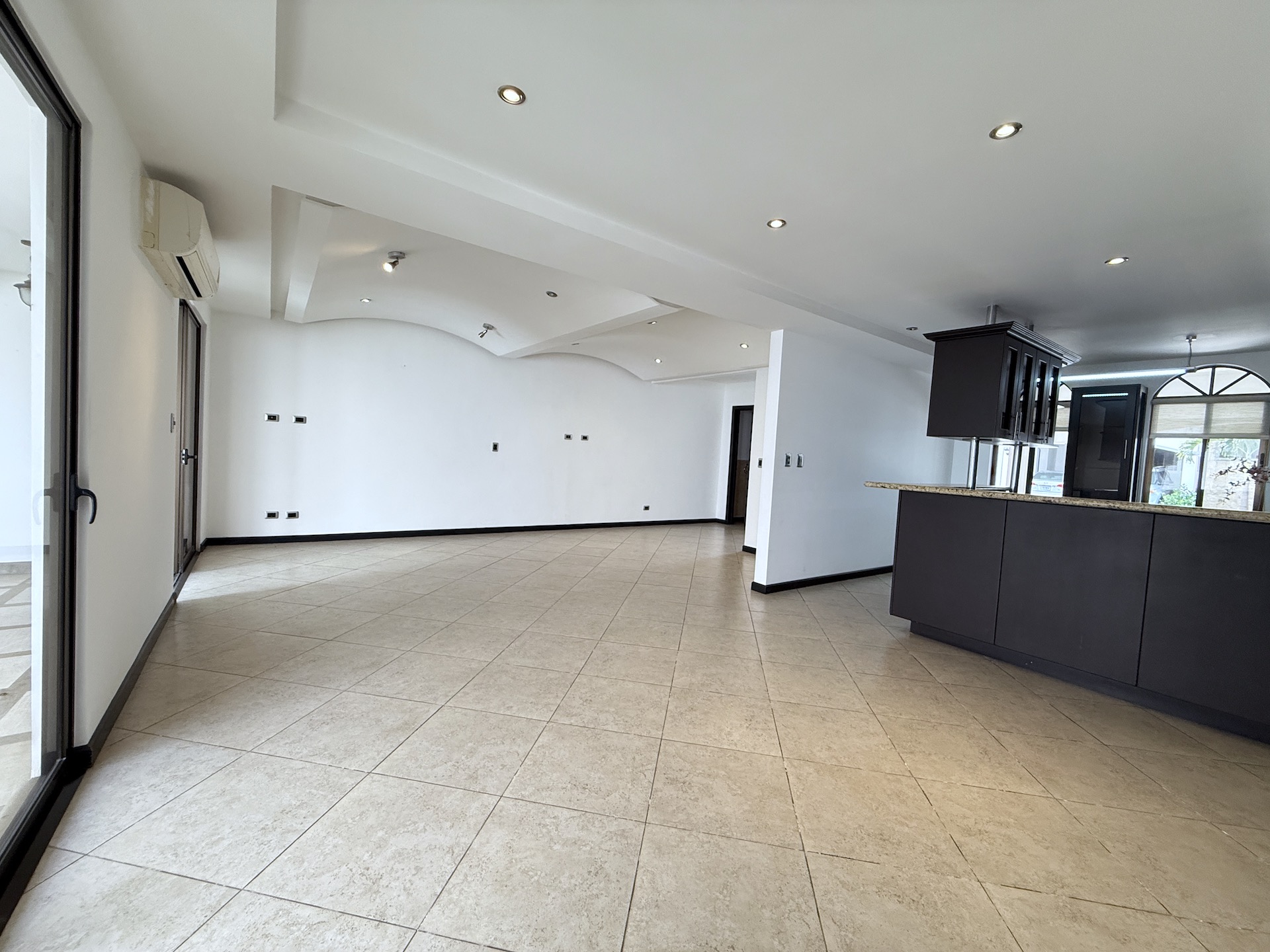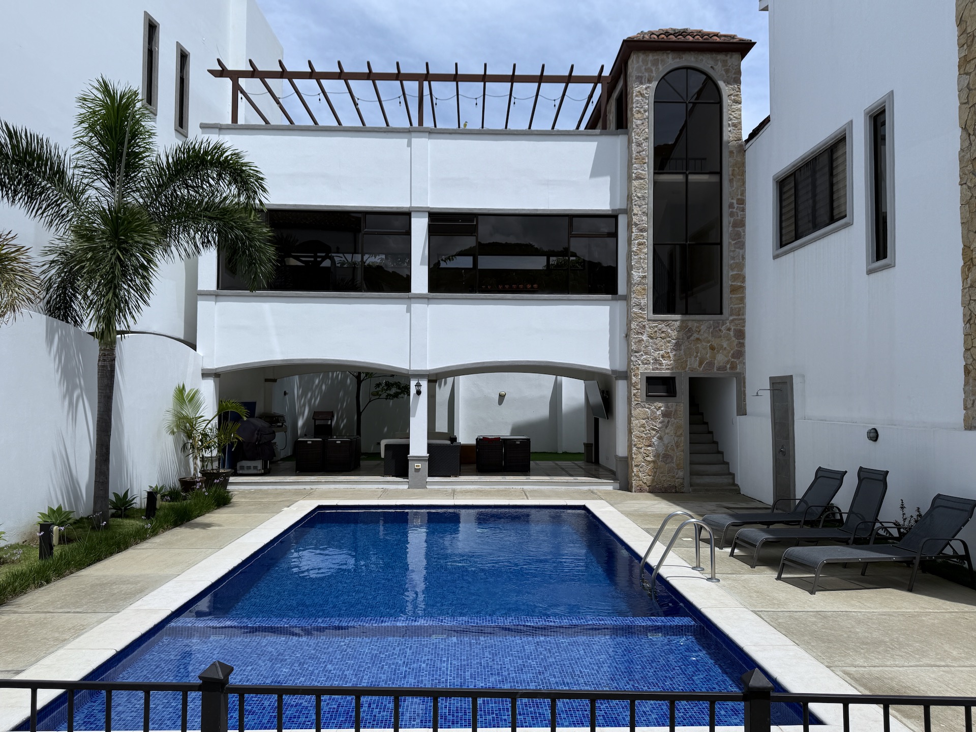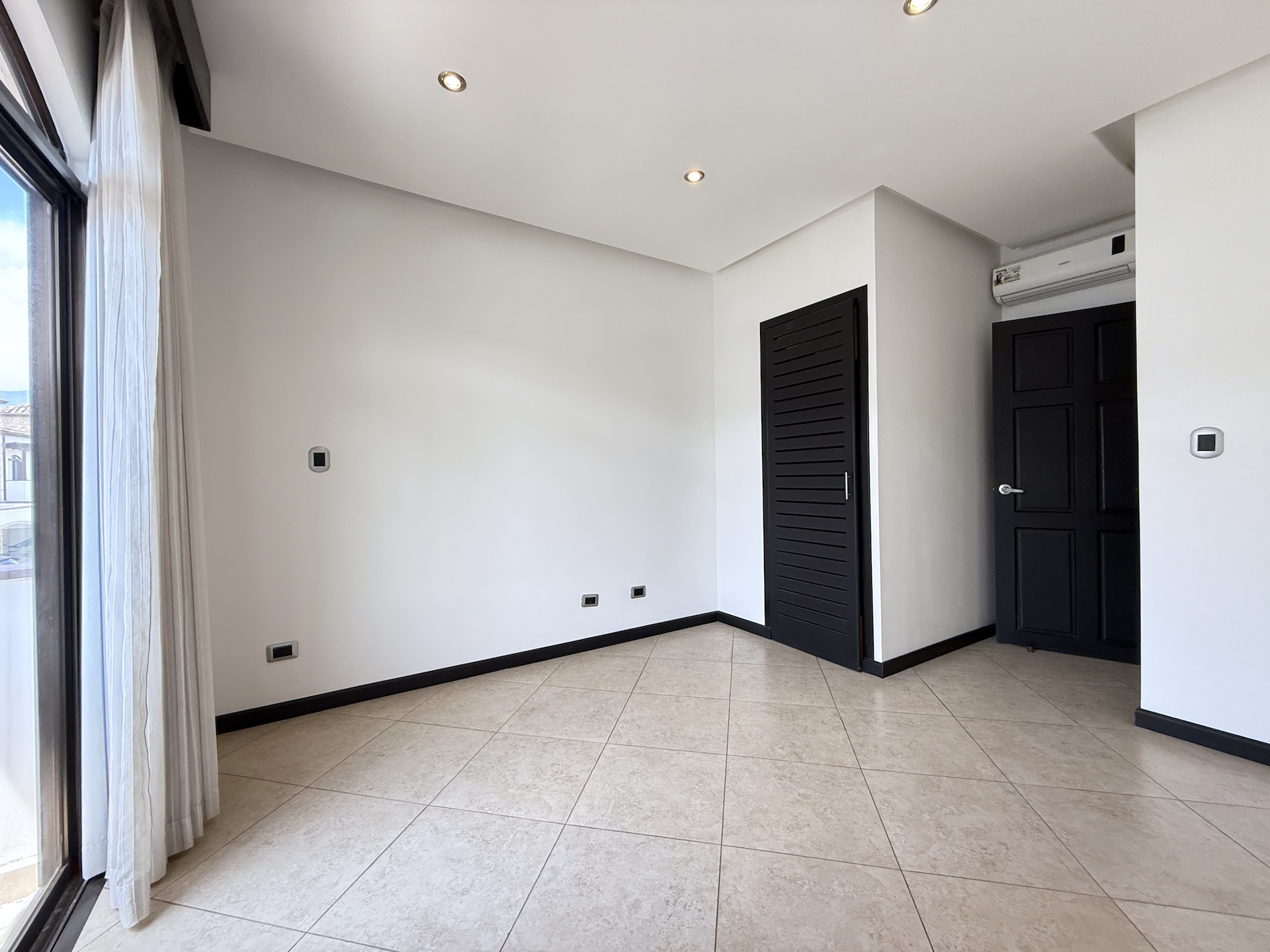 En la planta alta se encuentra una sala de televisión con techos altos, rodeada por tres habitaciones con aire condicionada. El dormitorio principal cuenta con walk-in closet, jacuzzi y balcón privado. Las otras dos habitaciones también tienen walk-in closets y comparten un baño completo. Un mezanine con vista a la sala de televisión es ideal para oficina o área de juegos. Ubicada en un condominio seguro con excelentes amenidades: casa club, piscina, gimnasio y área de juegos infantiles. A pocos minutos de comercios, Lindora, el Hospital Metropolitano y parques empresariales.