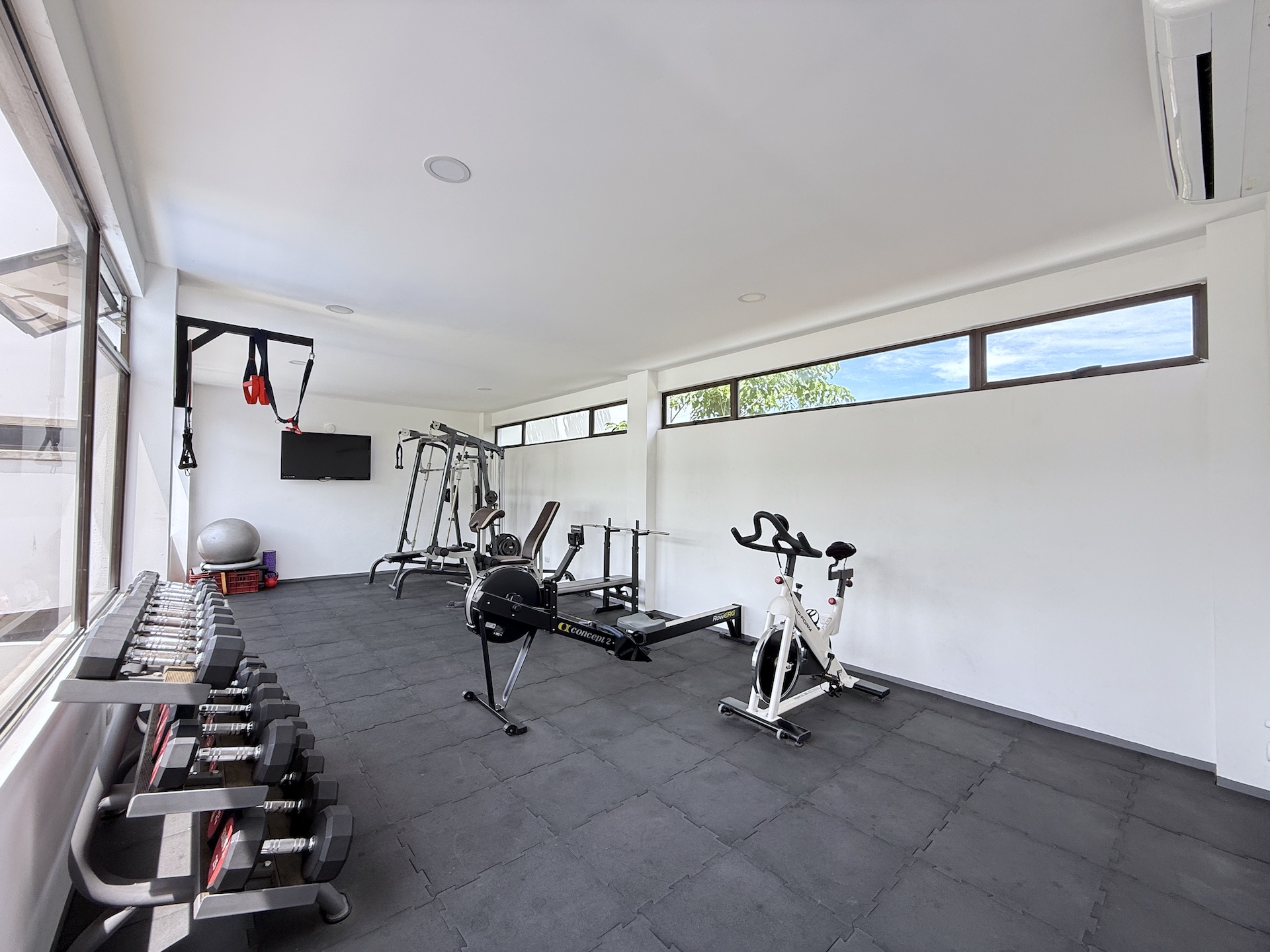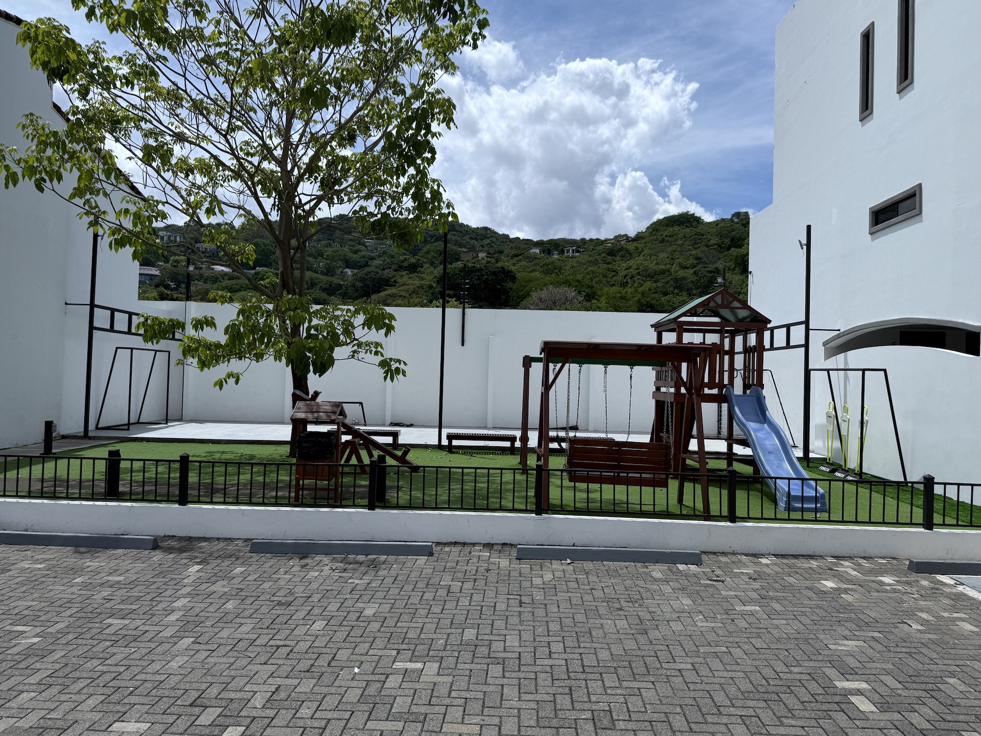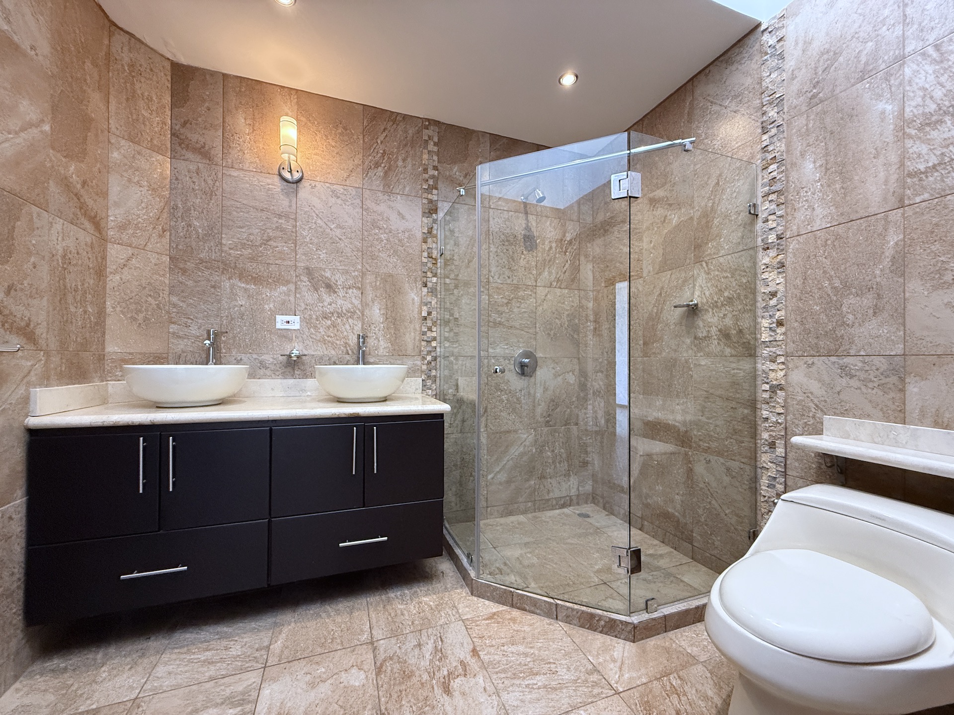 En la planta alta se encuentra una sala de televisión con techos altos, rodeada por tres habitaciones con aire condicionada. El dormitorio principal cuenta con walk-in closet, jacuzzi y balcón privado. Las otras dos habitaciones también tienen walk-in closets y comparten un baño completo. Un mezanine con vista a la sala de televisión es ideal para oficina o área de juegos. Ubicada en un condominio seguro con excelentes amenidades: casa club, piscina, gimnasio y área de juegos infantiles. A pocos minutos de comercios, Lindora, el Hospital Metropolitano y parques empresariales.