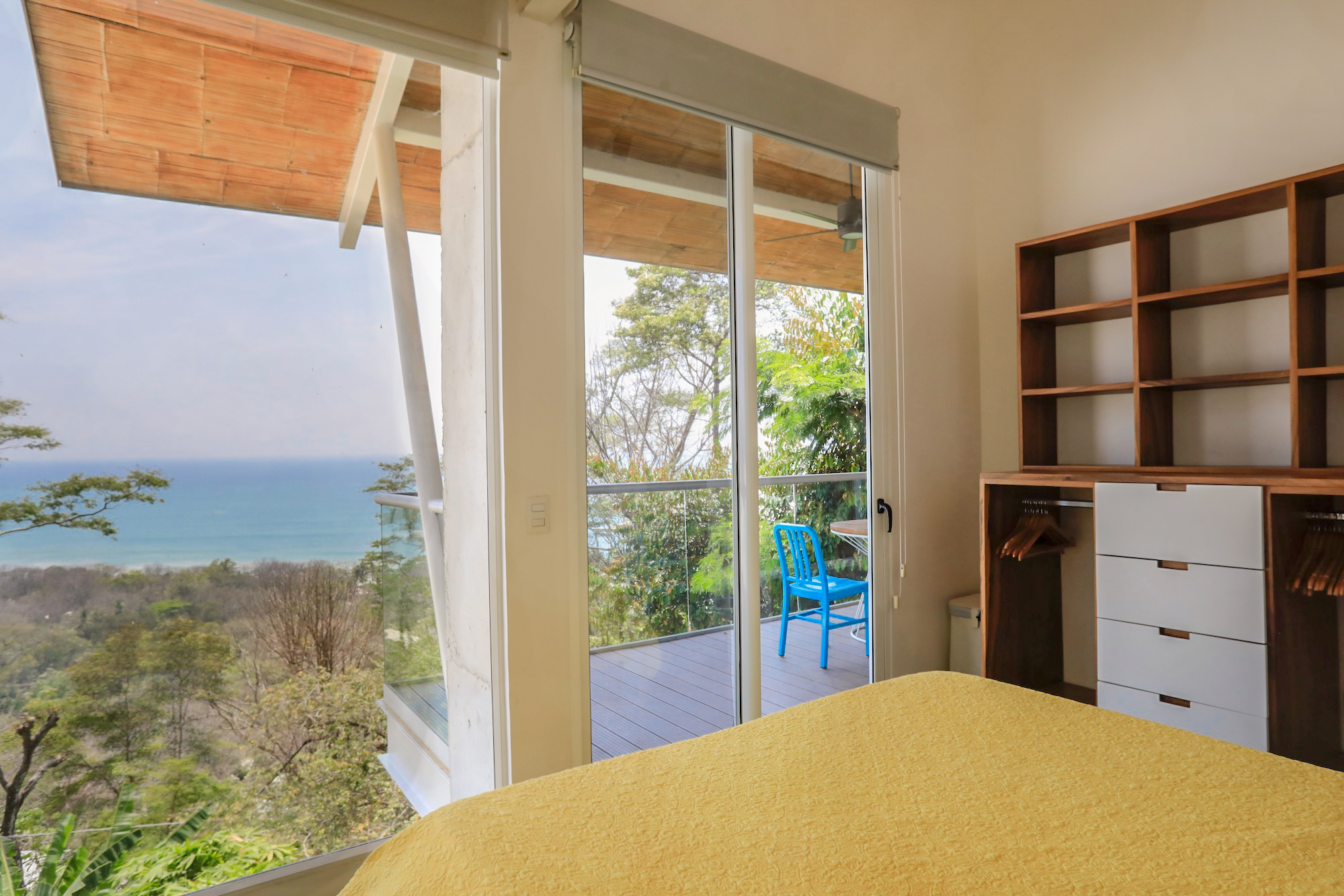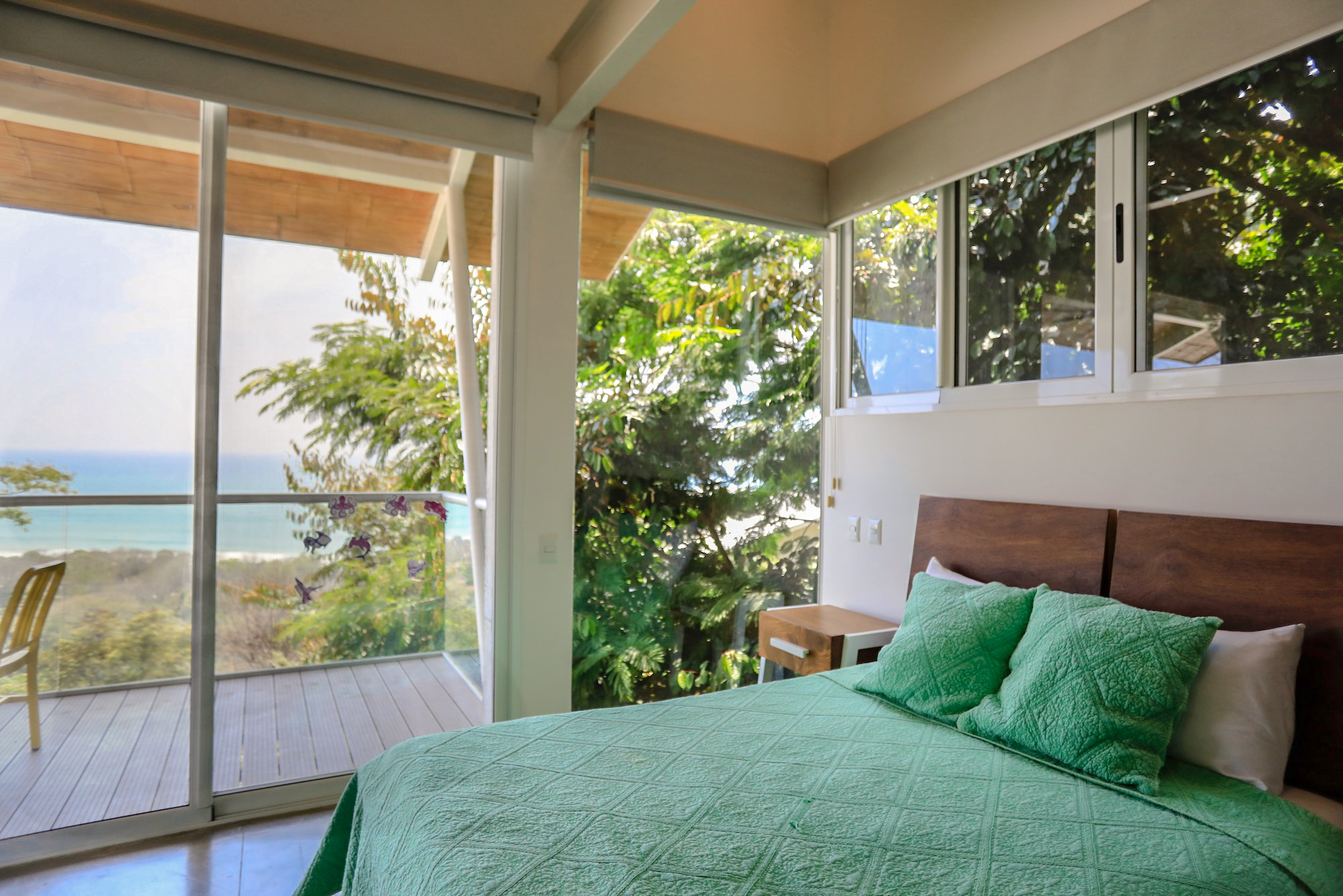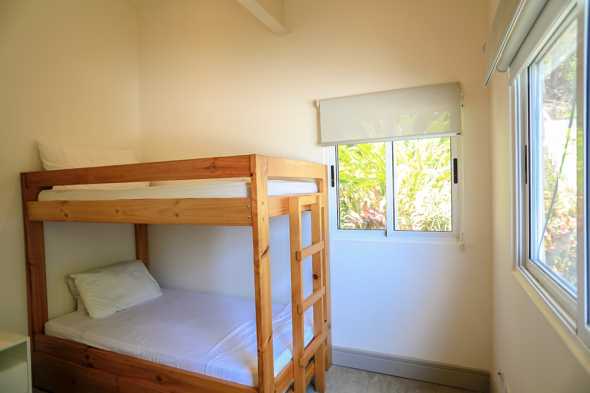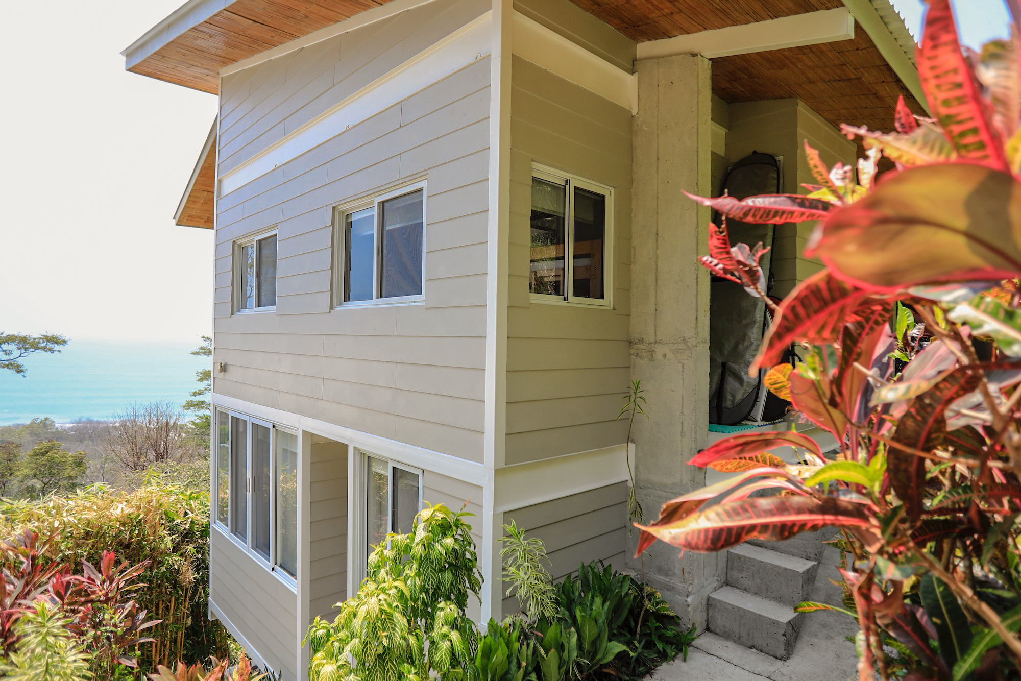 On the second level, you’ll find all three bedrooms. The spacious primary bedroom boasts a private ensuite bathroom, an ocean view, and access to a balcony where you can enjoy the stunning vistas. The second bedroom also offers ocean views and balcony access, while the third bedroom faces the lush garden area. The second and third bedrooms share a well-appointed bathroom.