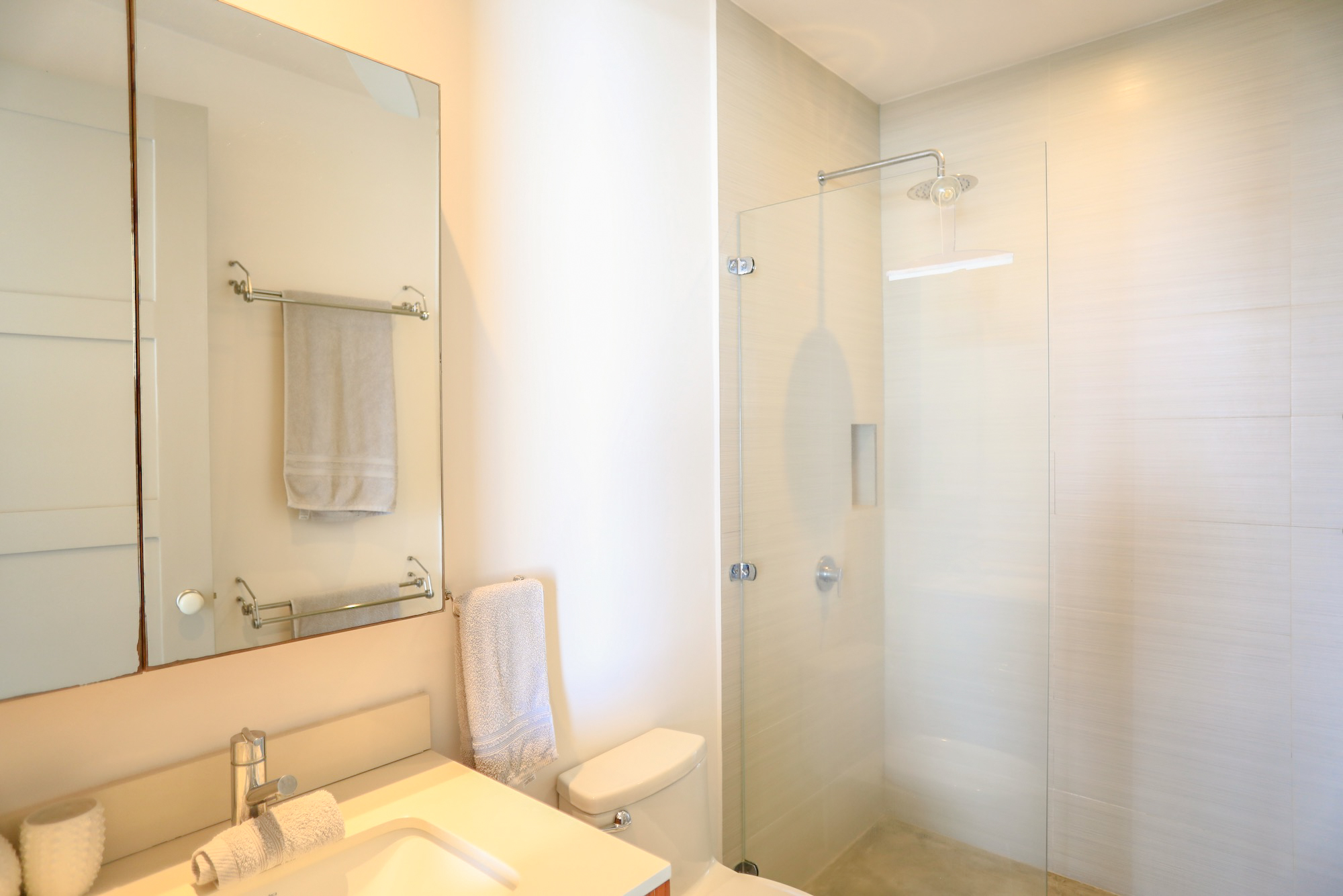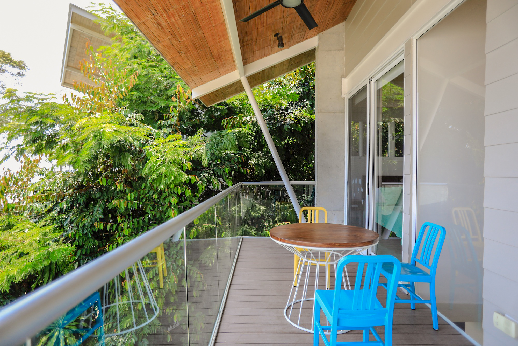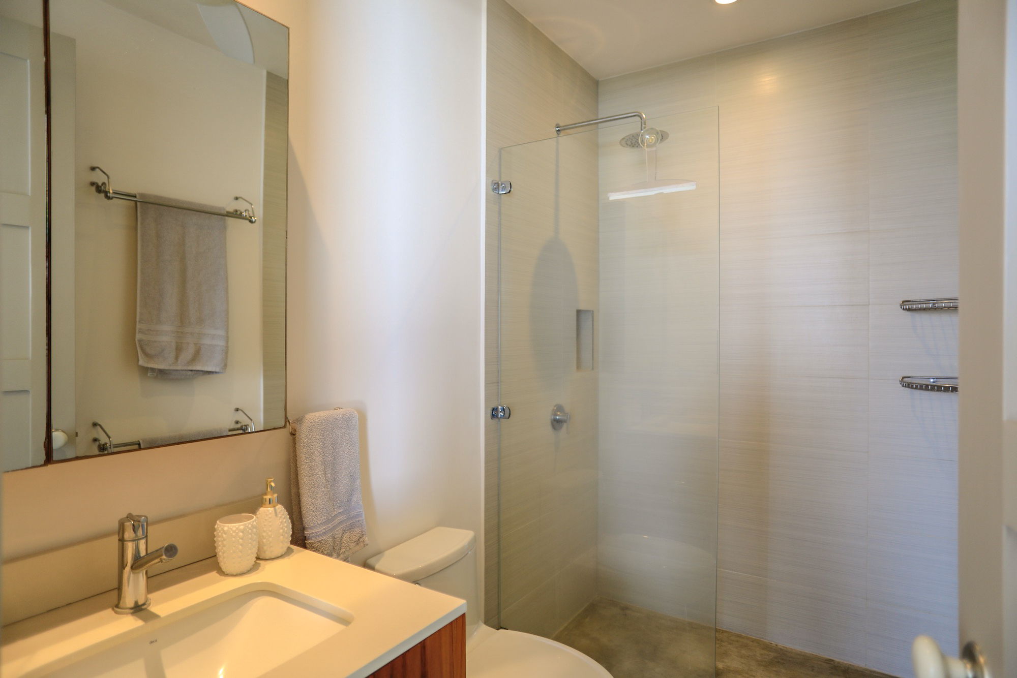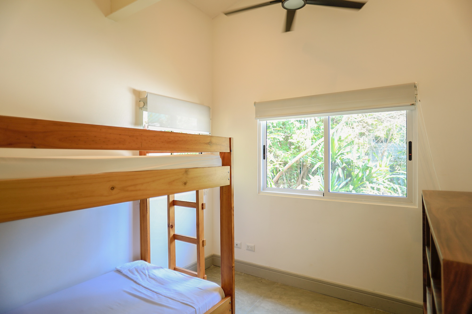 On the second level, you’ll find all three bedrooms. The spacious primary bedroom boasts a private ensuite bathroom, an ocean view, and access to a balcony where you can enjoy the stunning vistas. The second bedroom also offers ocean views and balcony access, while the third bedroom faces the lush garden area. The second and third bedrooms share a well-appointed bathroom.