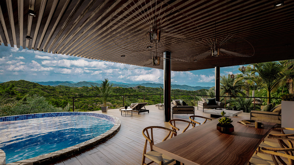 As you walk into this home you are greeted by a feeling of being at one with nature, looking out of the floor to ceiling glass windows into the canopy of the tropical dry forest. Expect to see and hear the local fauna including monkeys, tropical birds and many lizards. There is a half bath on this floor just off the main entrance. As you continue into the main room, you will be drawn to take a seat on the patio chairs to take in all the view!