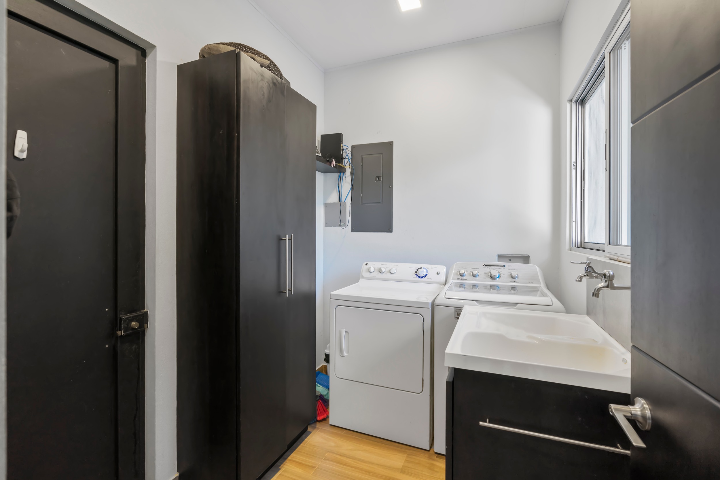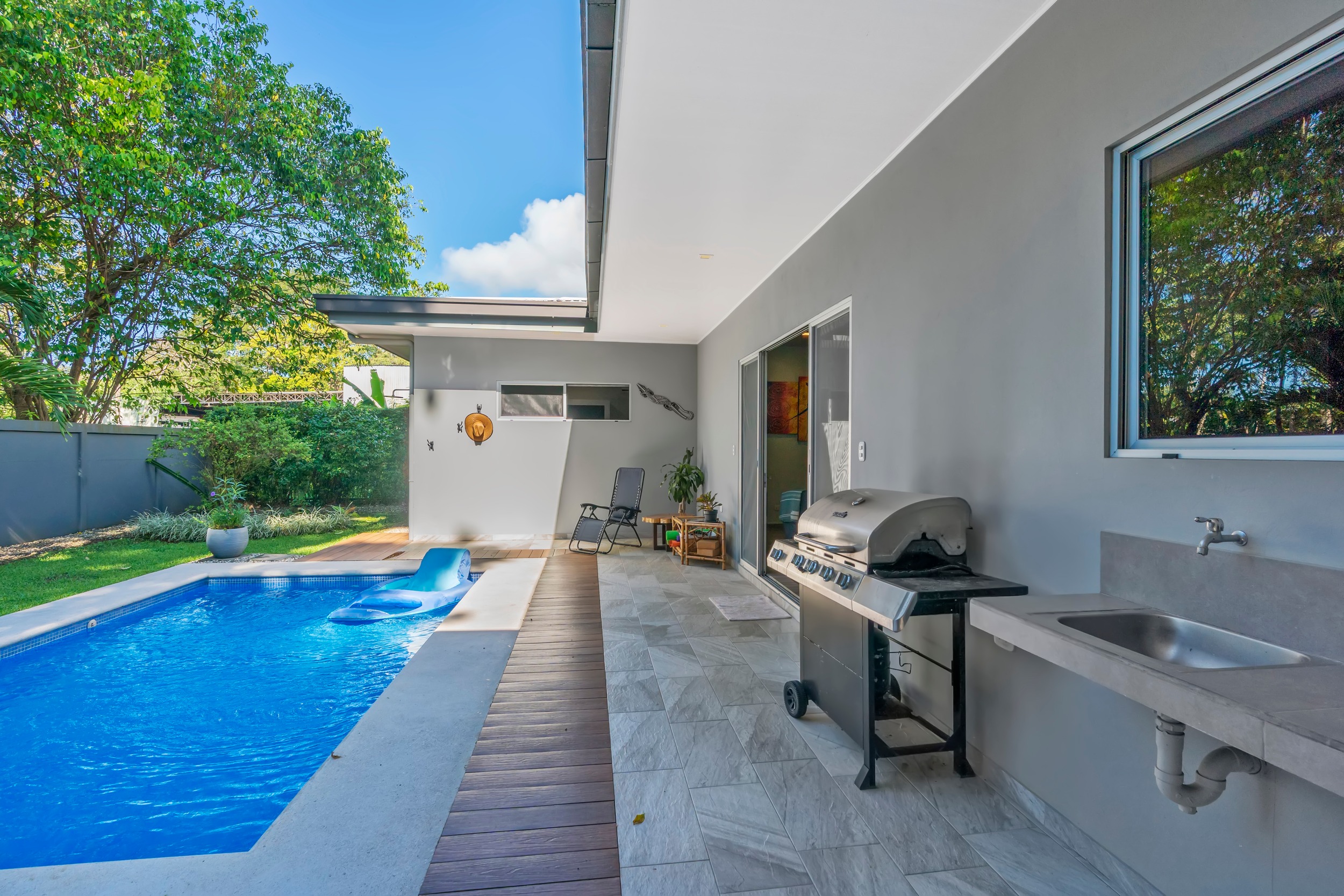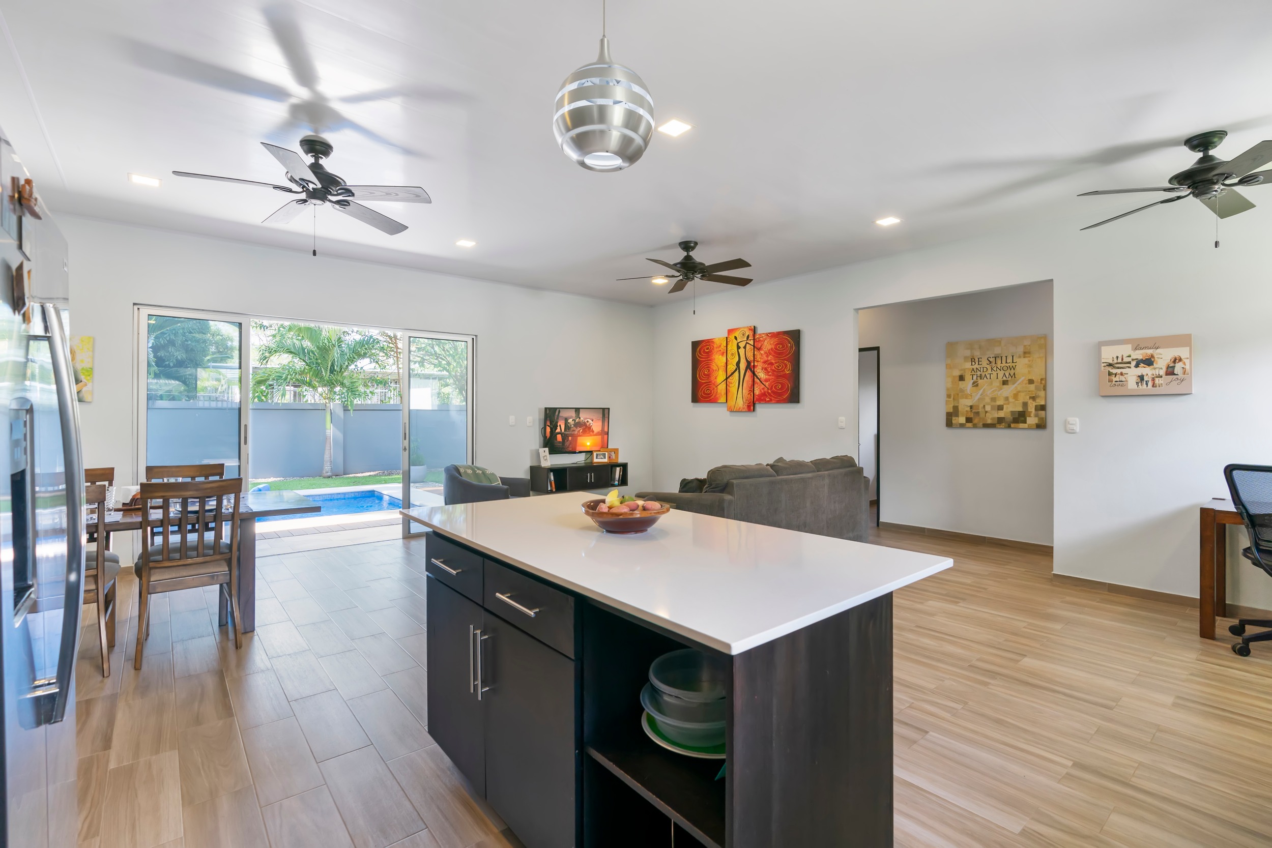 Straight out the sliding glass doors is the pool area with a nice sized pool and covered rancho for outdoor dining and BBQ/entertaining. To the right is the 3 bedrooms and 2 bathrooms. Two of the guest rooms share a full bath in the hallway and the master bedroom has its own spacious on - suite bathroom. All 3 bedrooms have split unit A/C units. To the left is a full - size laundry room and direct access to the 2 car carport. Also off the garage is a HUGE storage bodega for tools and beach chairs, surf boards and toys. Great location for a short term Airbnb or long - term monthly rental. Also the perfect full - time residence for easy day to day living only minutes to all your activities and shopping, yet on a nice residential street with other nice homes as neighboring properties.