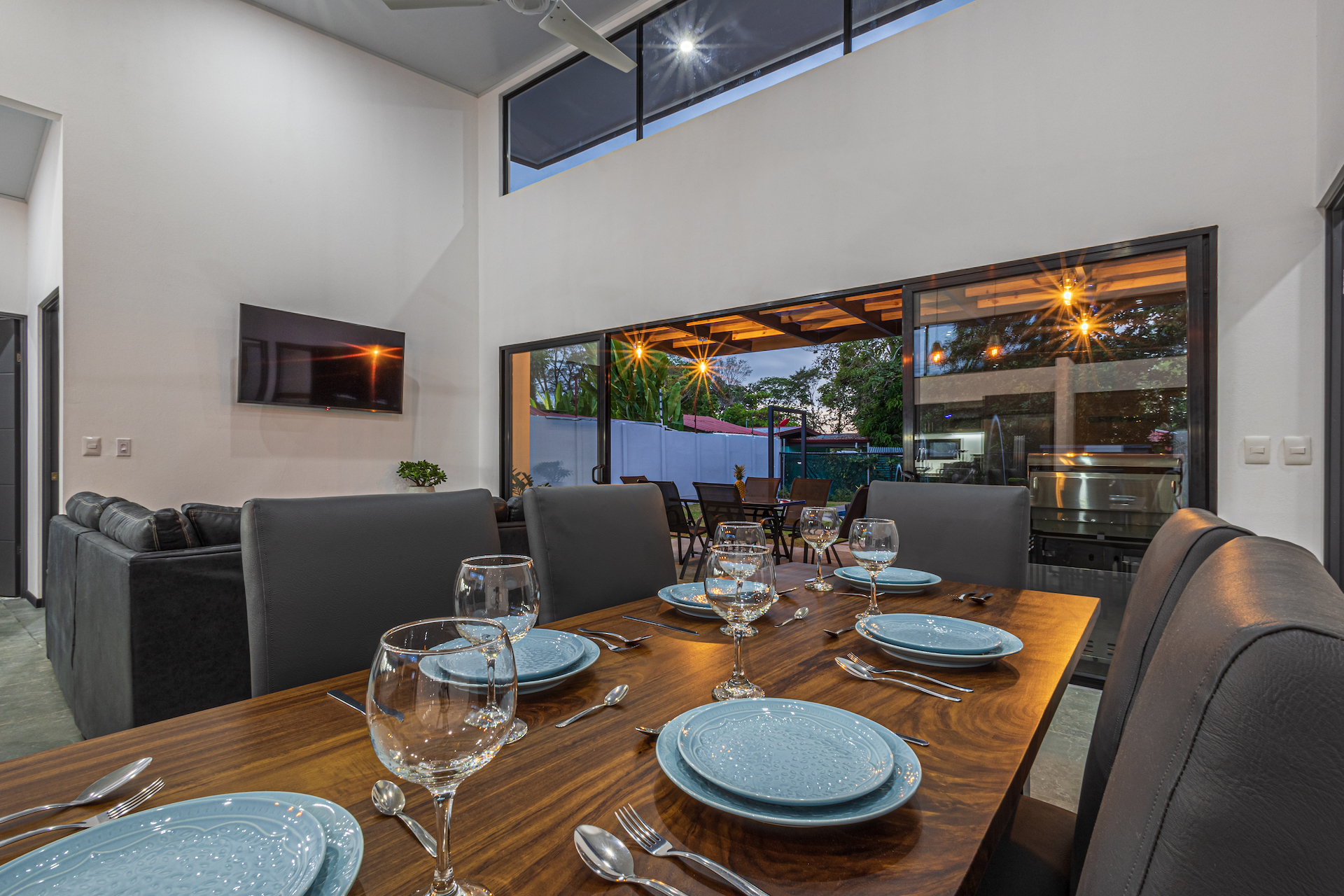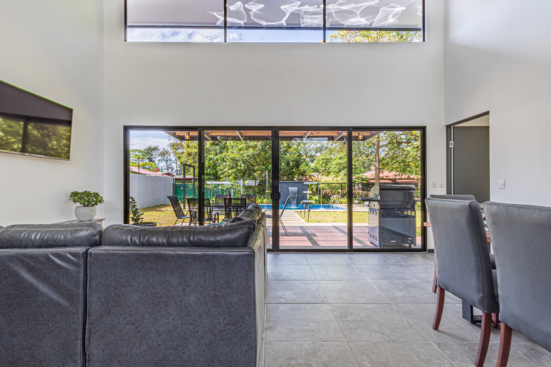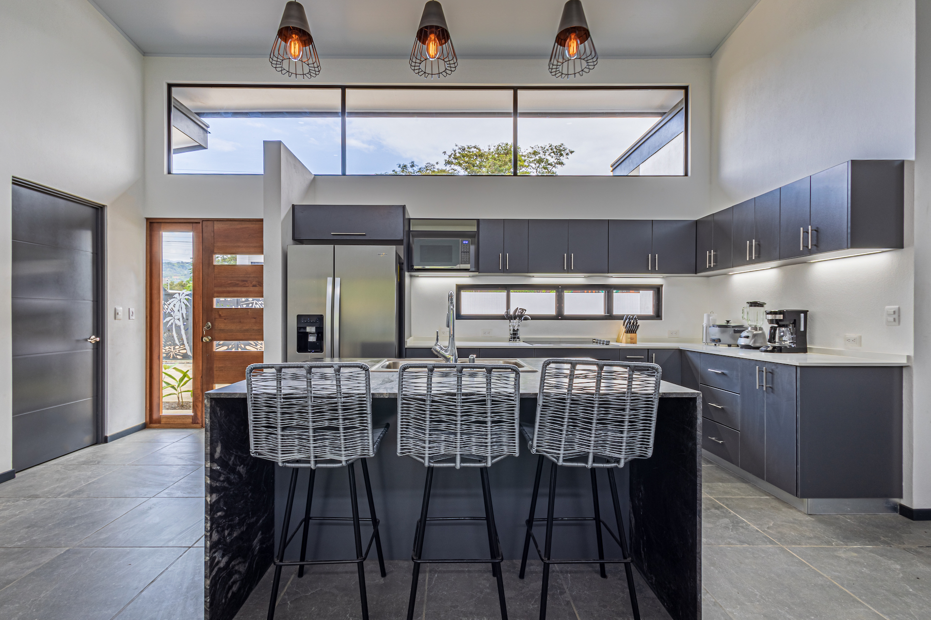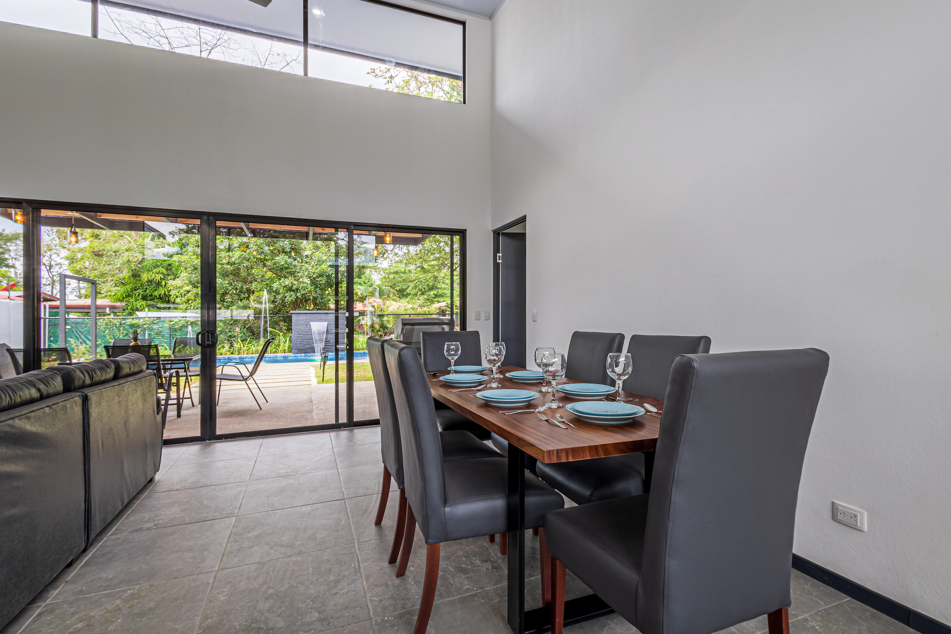 A electric remote control gate opens to the property. A 2-carport garage space with a walk way to the main front door. This tropical open floor plan with ceramic tile floors, very tall ceiling, glass door that opens to the pool and outdoor area. The great spacious kitchen design with white quartz counter tops, costume kitchen cabinets, a lot of storage space, big island and 4 wood bar stools. An L-shaped sofa, coffee table, 55" inch TV and dining table for 6 people in the living room/dining area.