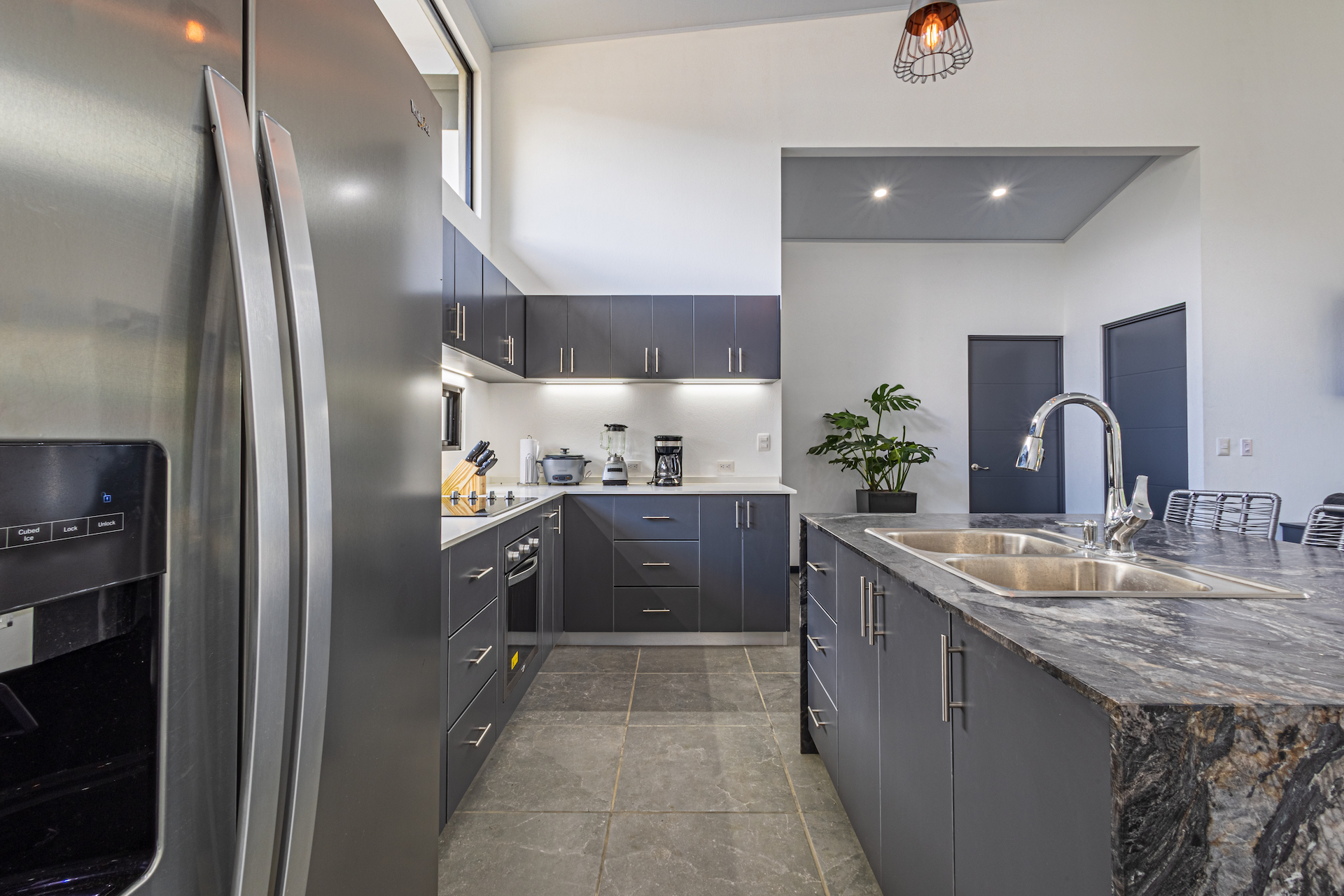 Two guest bedrooms with double beds, night tables and closets. On the other side of the house is the large master bedroom with a king size bed, 2 bedside tables and a very spacious ensuite bathroom, quartz counter tops, soluble vanity sinks and a custom closet.