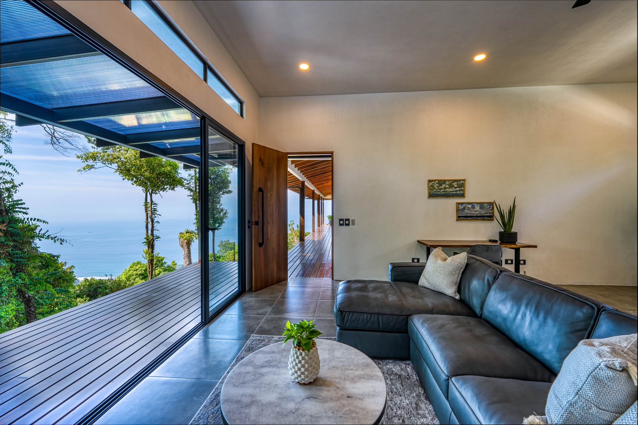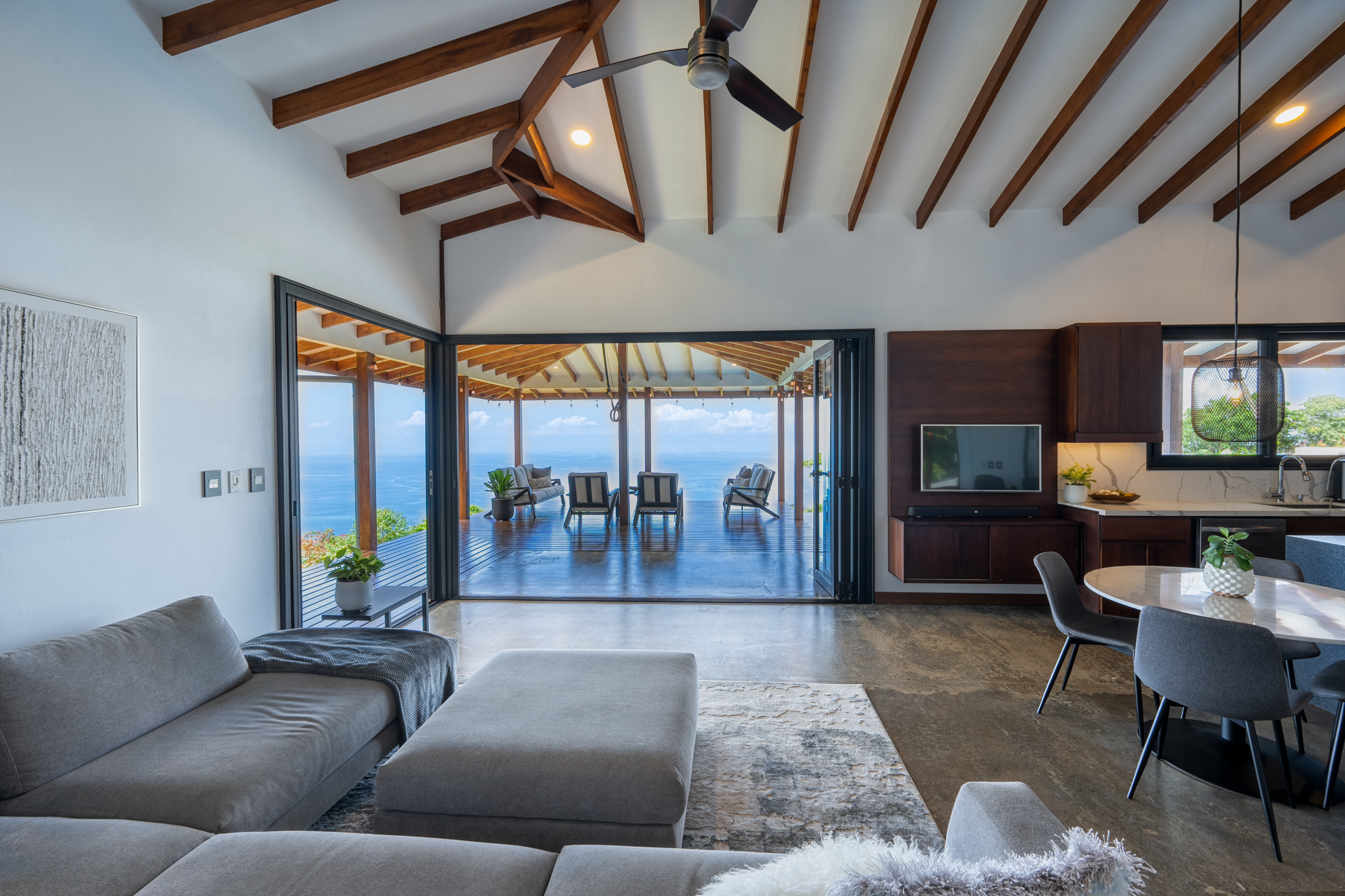 Inside, the turnkey home boasts an open-concept living area and kitchen that flows seamlessly to the outdoor covered patio and infinity pool. The large outdoor terrace offers breathtaking and ever-changing views of the Pacific Ocean, perfect for year-round indoor/outdoor living.