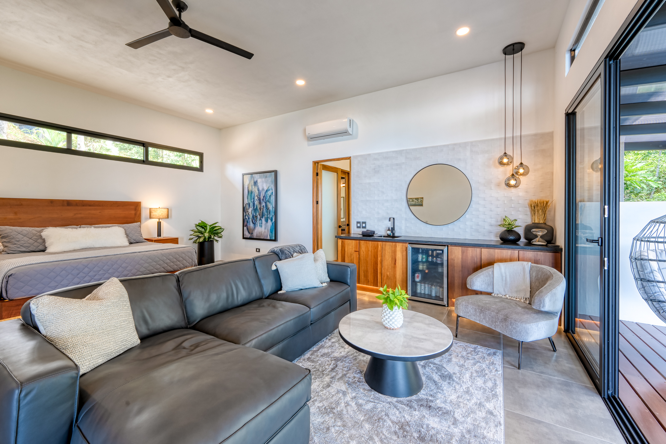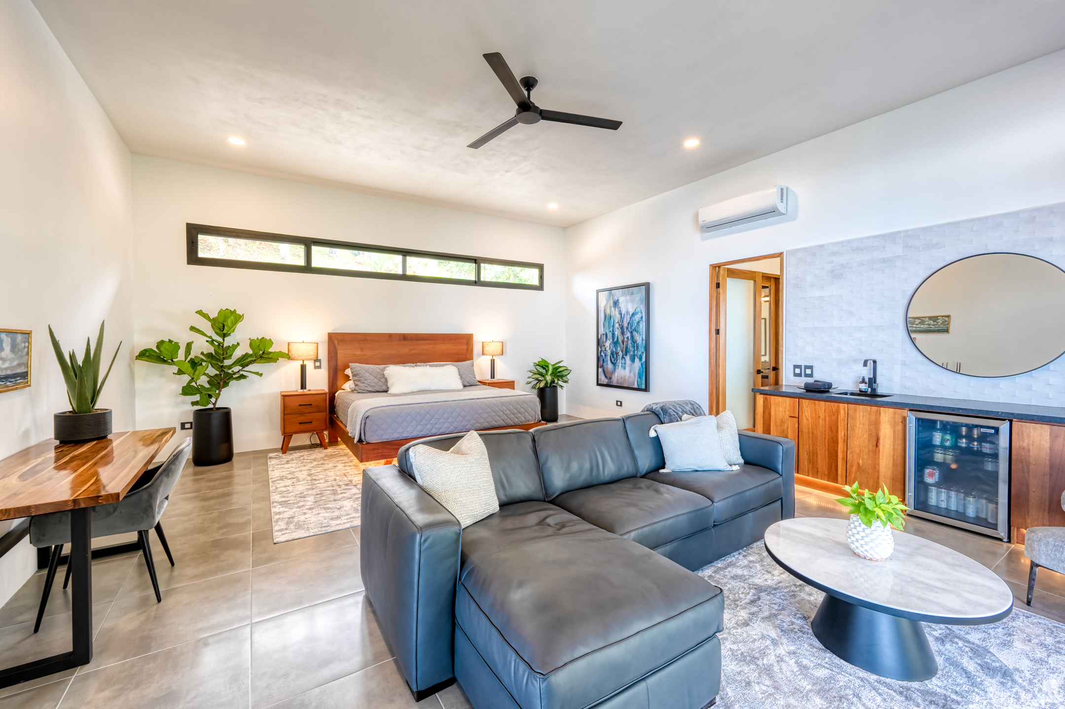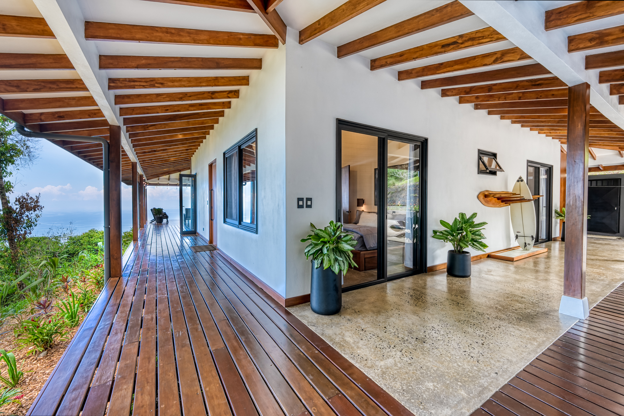 The property features polished concrete and ceramic tile floors, quartz and leathered granite counters with water fall edges, under cabinet lights, and new Europa windows and doors throughout. The private master suite features a spacious siting area, wet bar with beverage station, large walk-in closet, dual vessel sinks with a make-up vanity, and a covered outdoor shower with stunning Costa Ballena views.