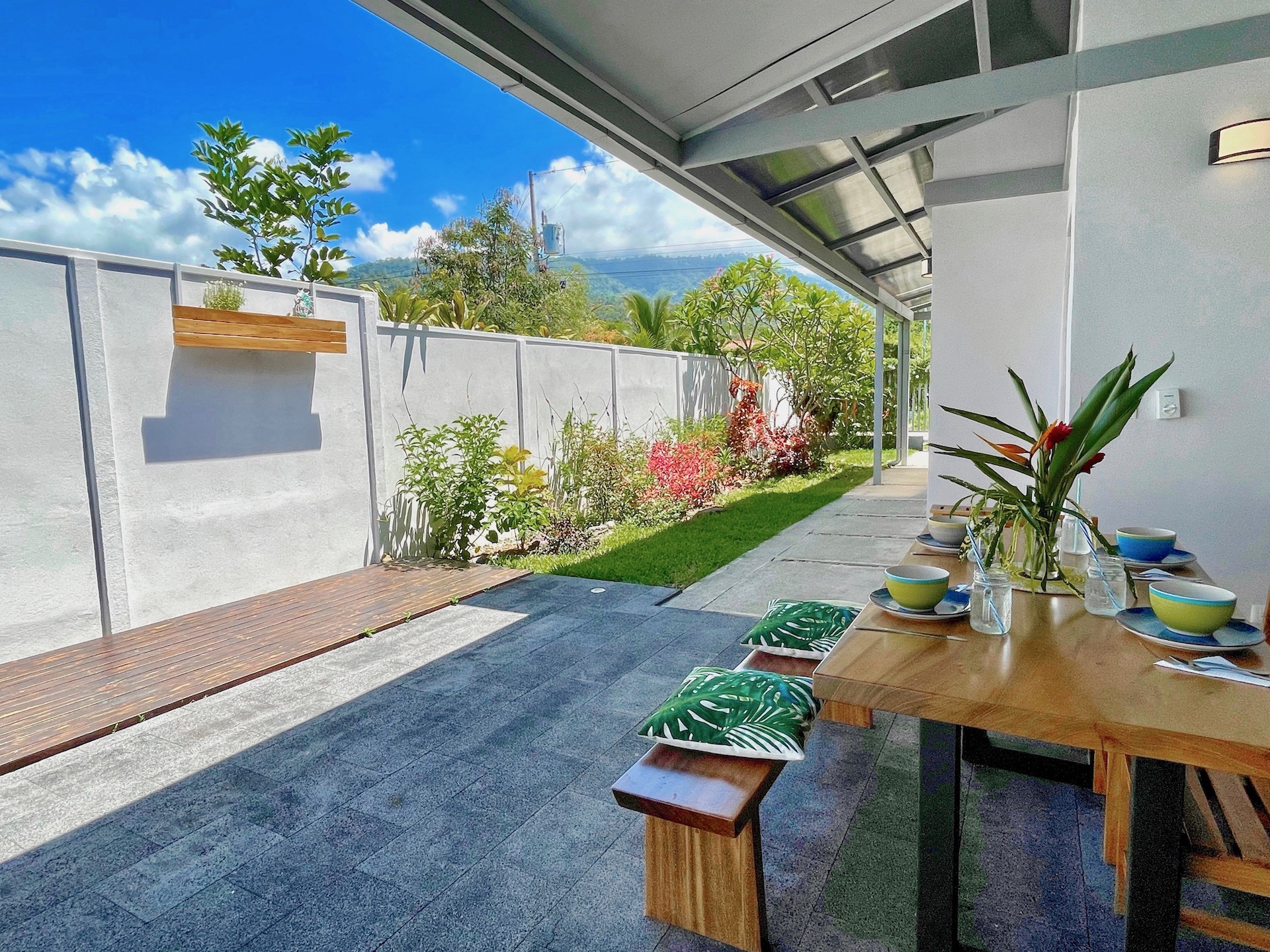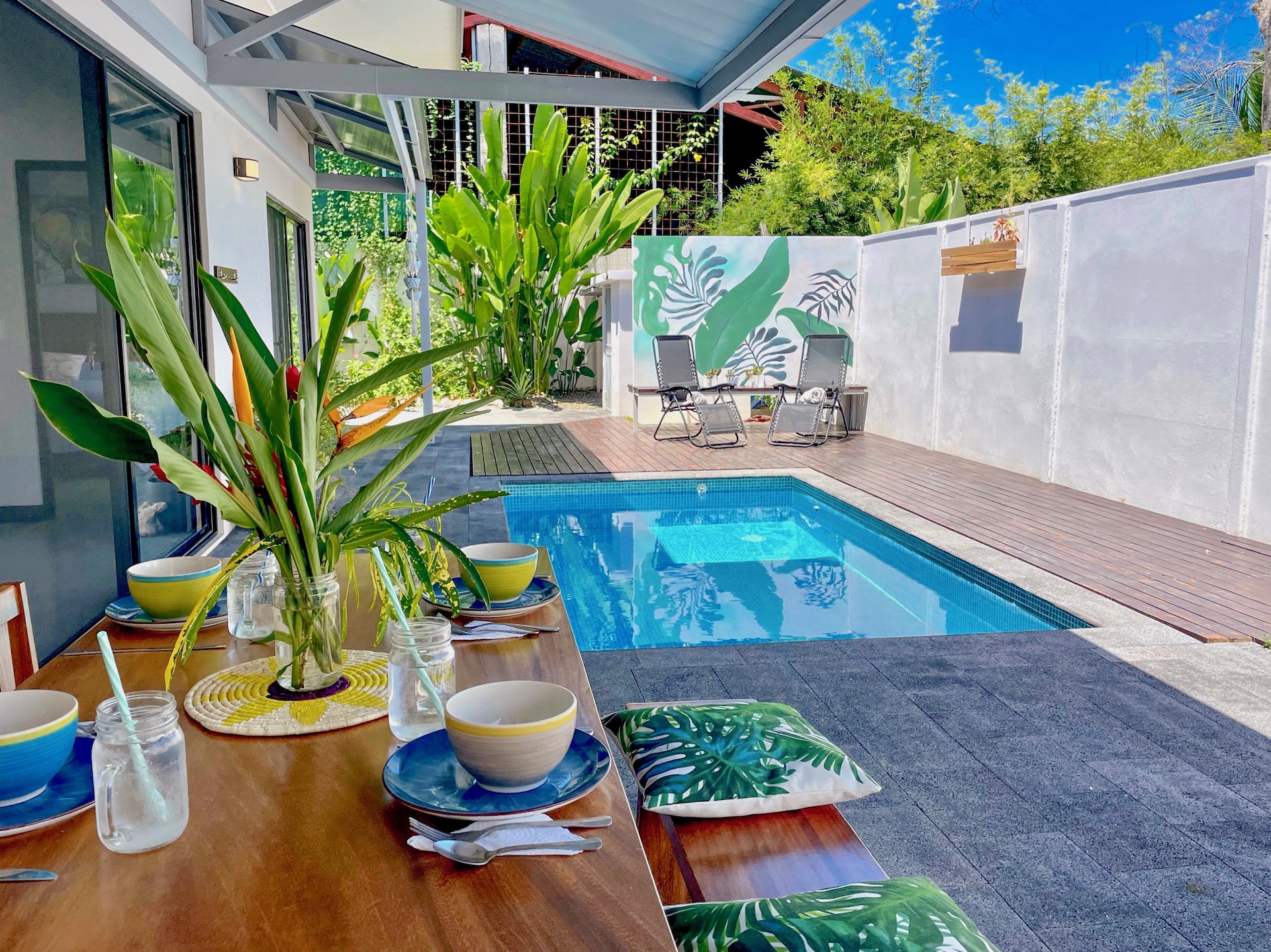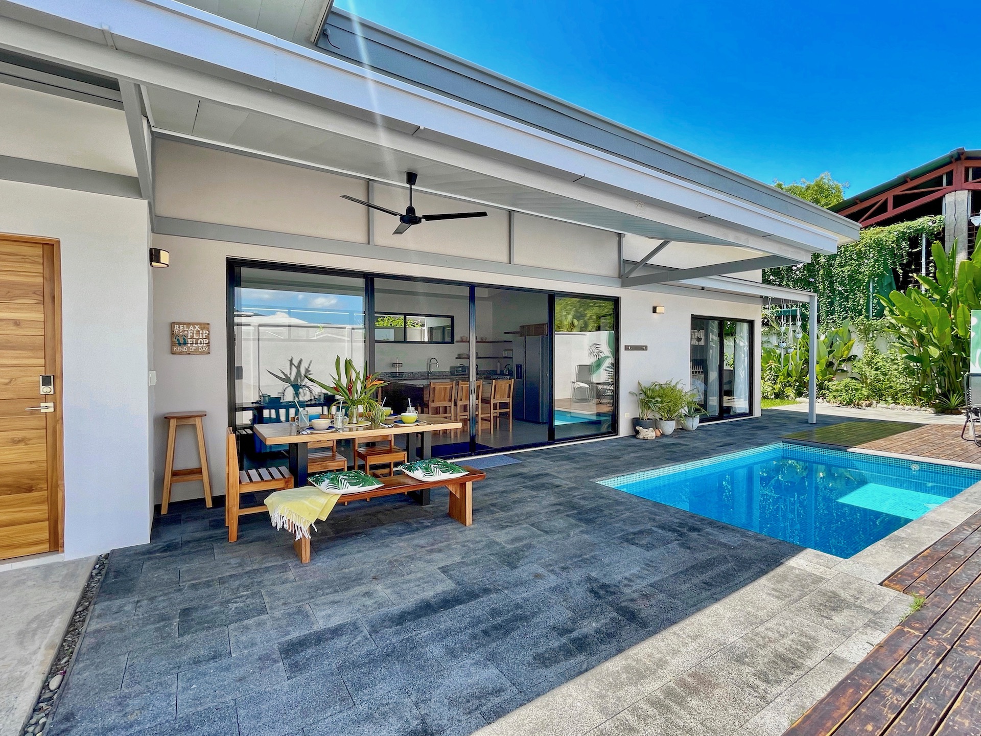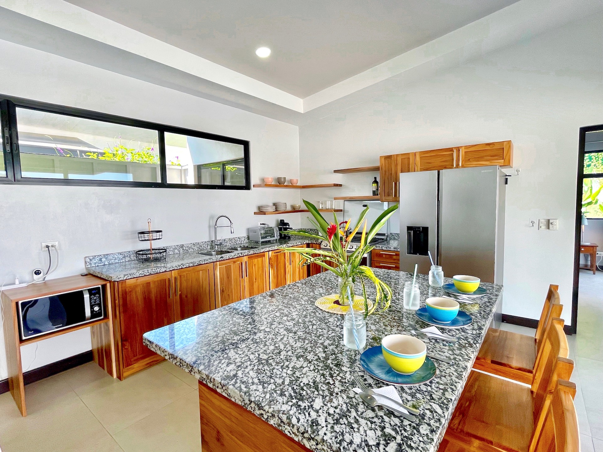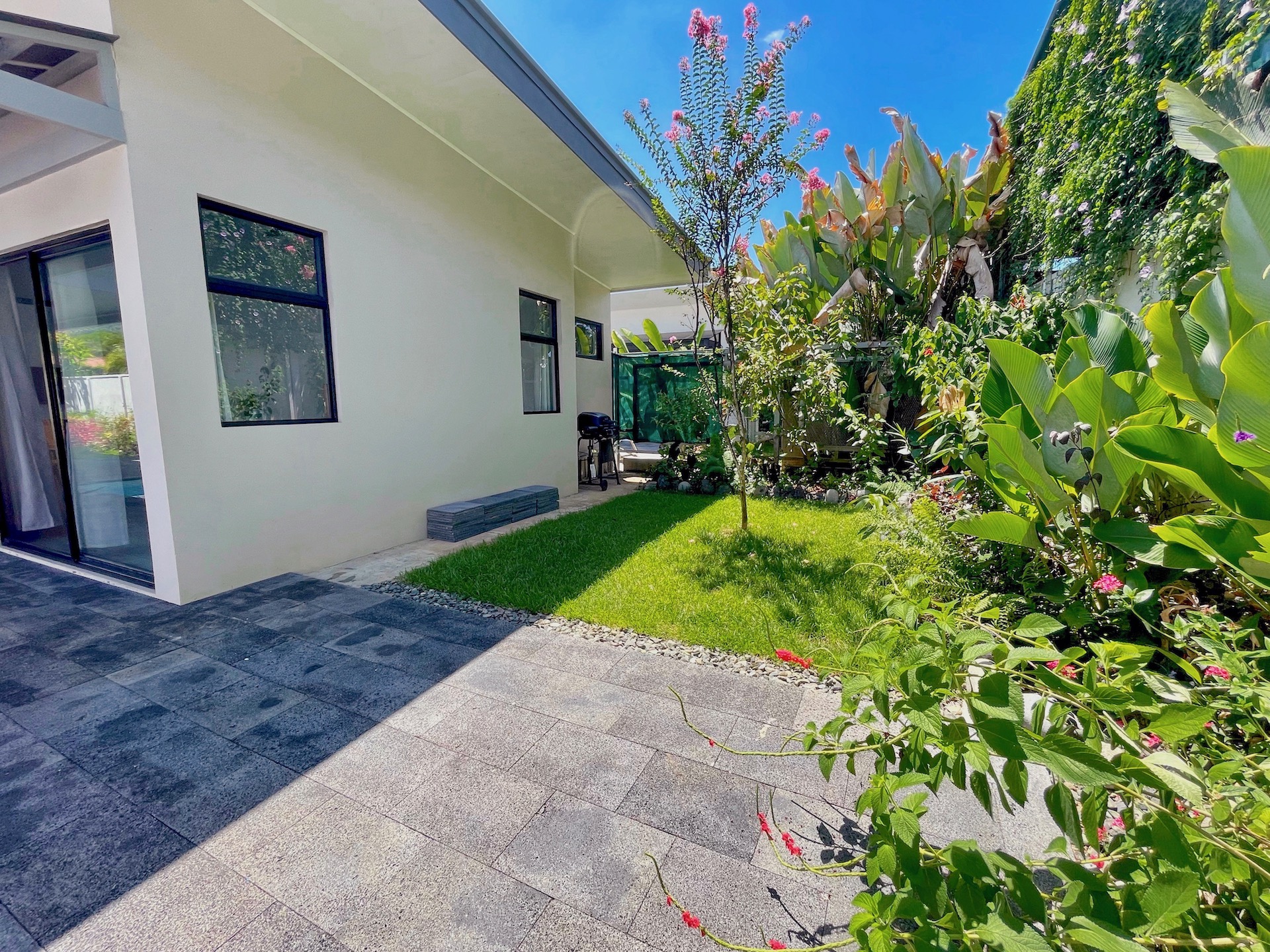 This family-friendly home features an inviting and open contemporary design with high-end finishes including a gourmet kitchen with an island, granite countertops, new stainless steel appliances with a washer and dryer, custom handmade teak furniture, A/C in all bedrooms, a large master bedroom with en-suite bath, motorized security gate, private covered parking and additional storage building, keyless entry, and an inviting private pool with covered outdoor terrace.