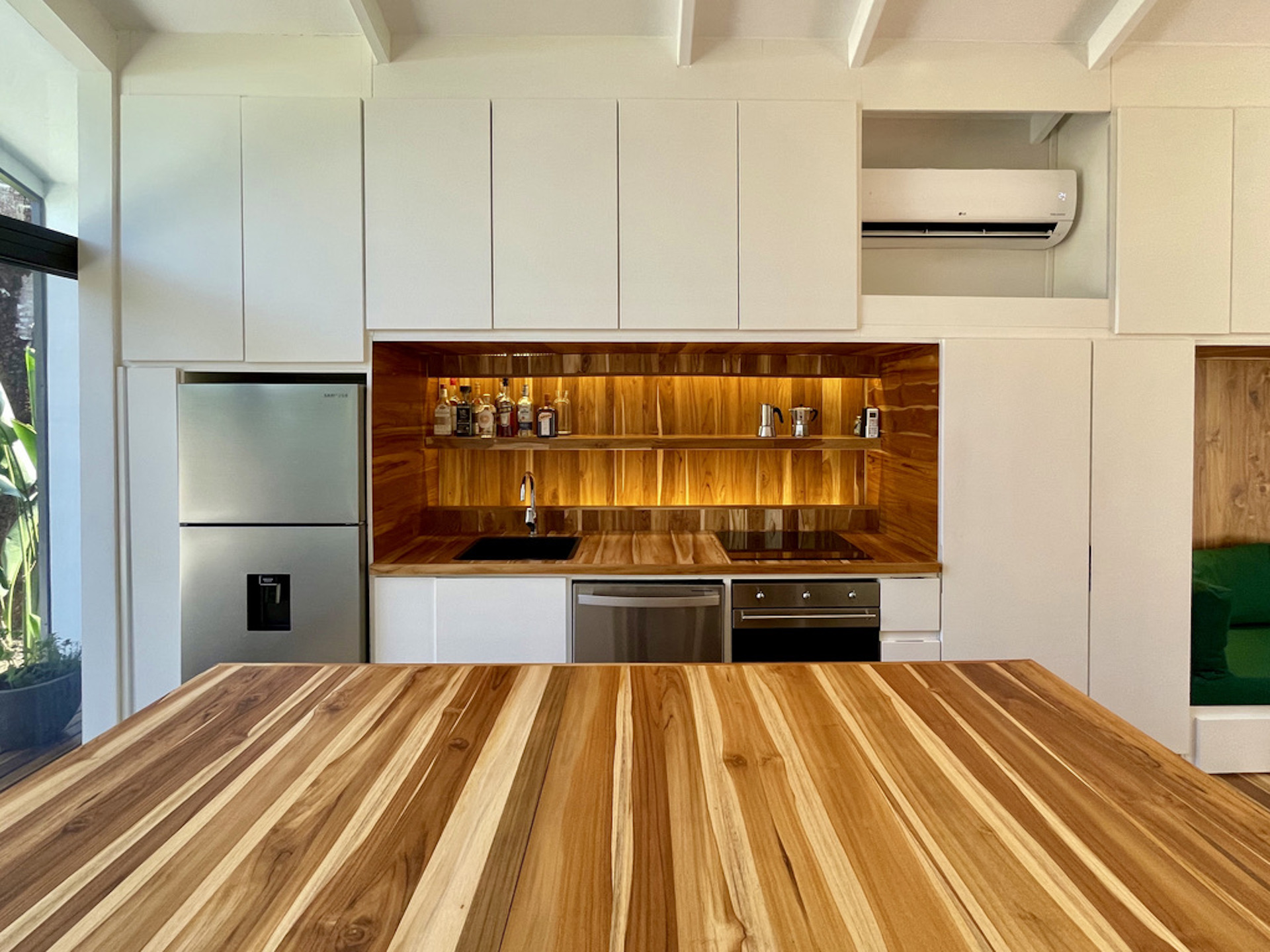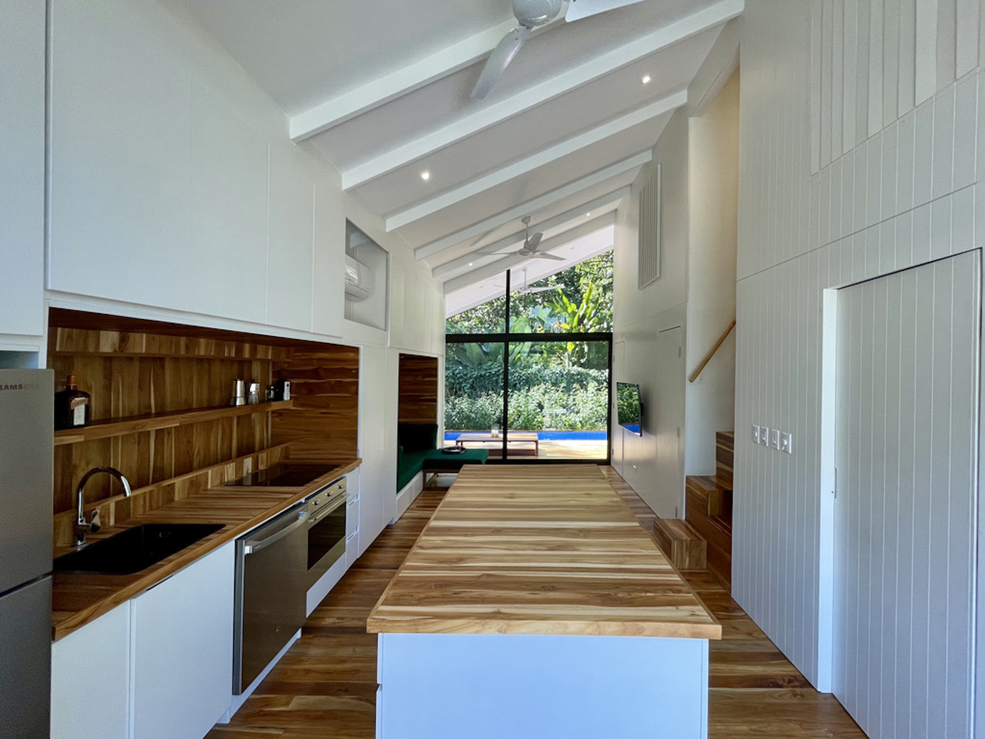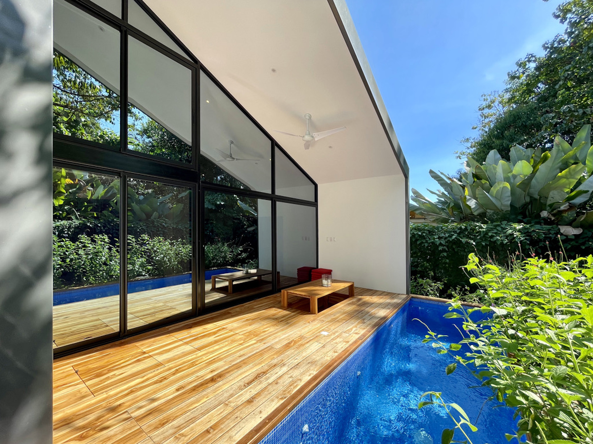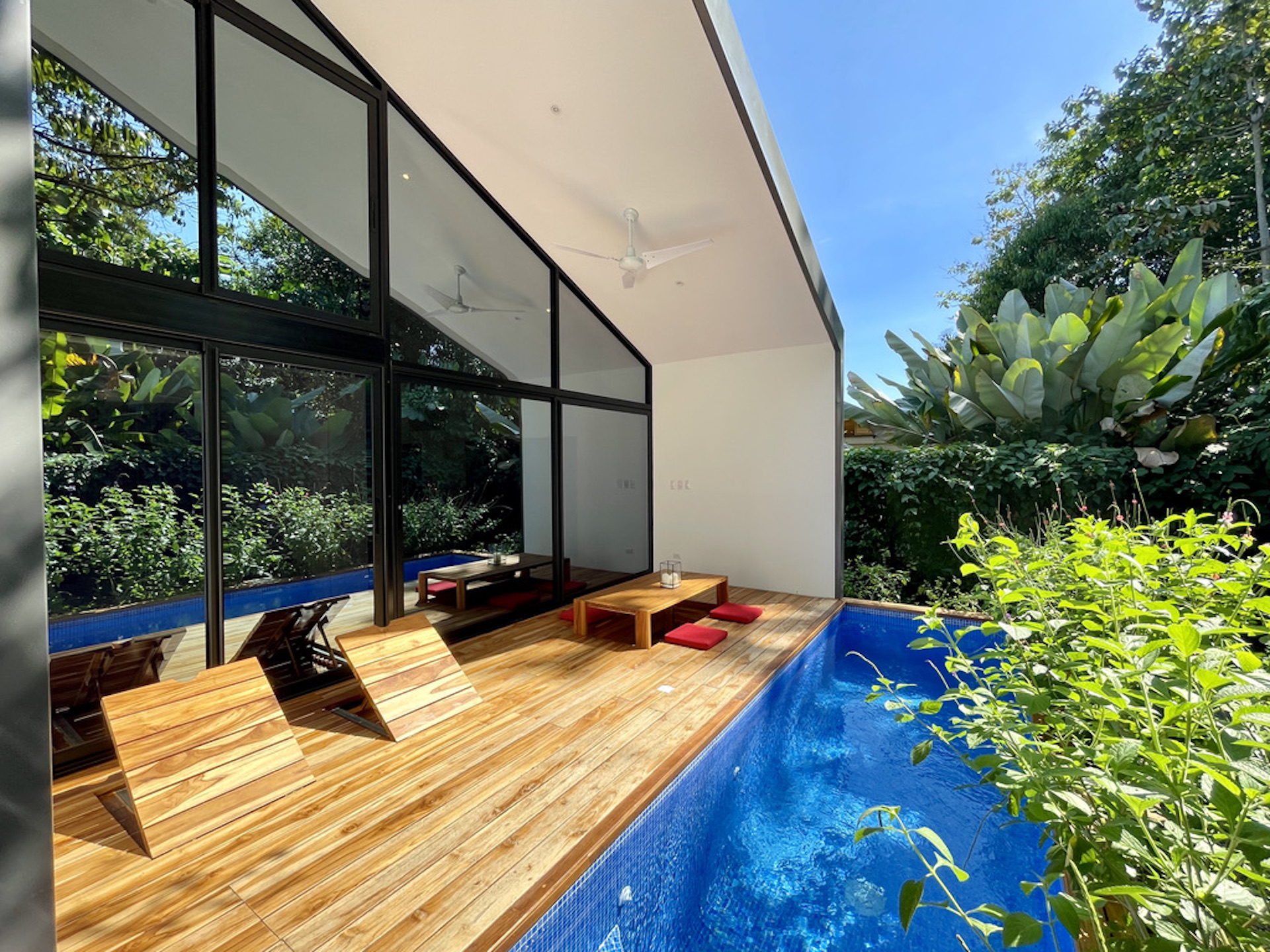 The open plan kitchen and living room blend seamlessly into the terrace, with the continuous teak flooring blurring the line between indoors and outdoors. A sunken dining table easily seats six on the sundeck, and two hidden lounge chairs fold up into the deck when needed. The pool offers a pleasant swimming corridor (1.8 x 6m). The fully landscaped garden is easy to maintain. Trees and plants form a natural carport shading your vehicle. On the other side, you will find an outside storage ideal for surfboards and bikes.