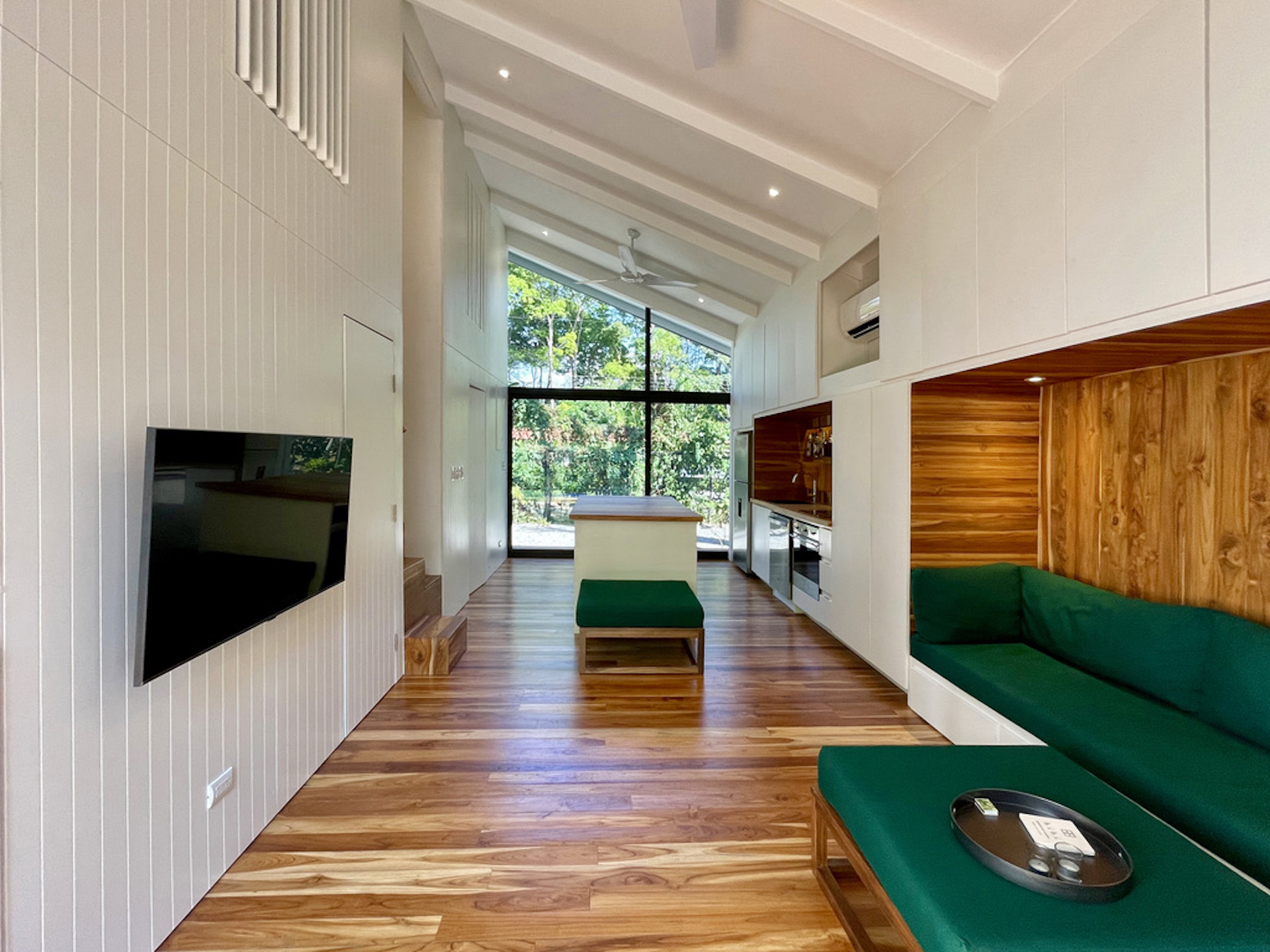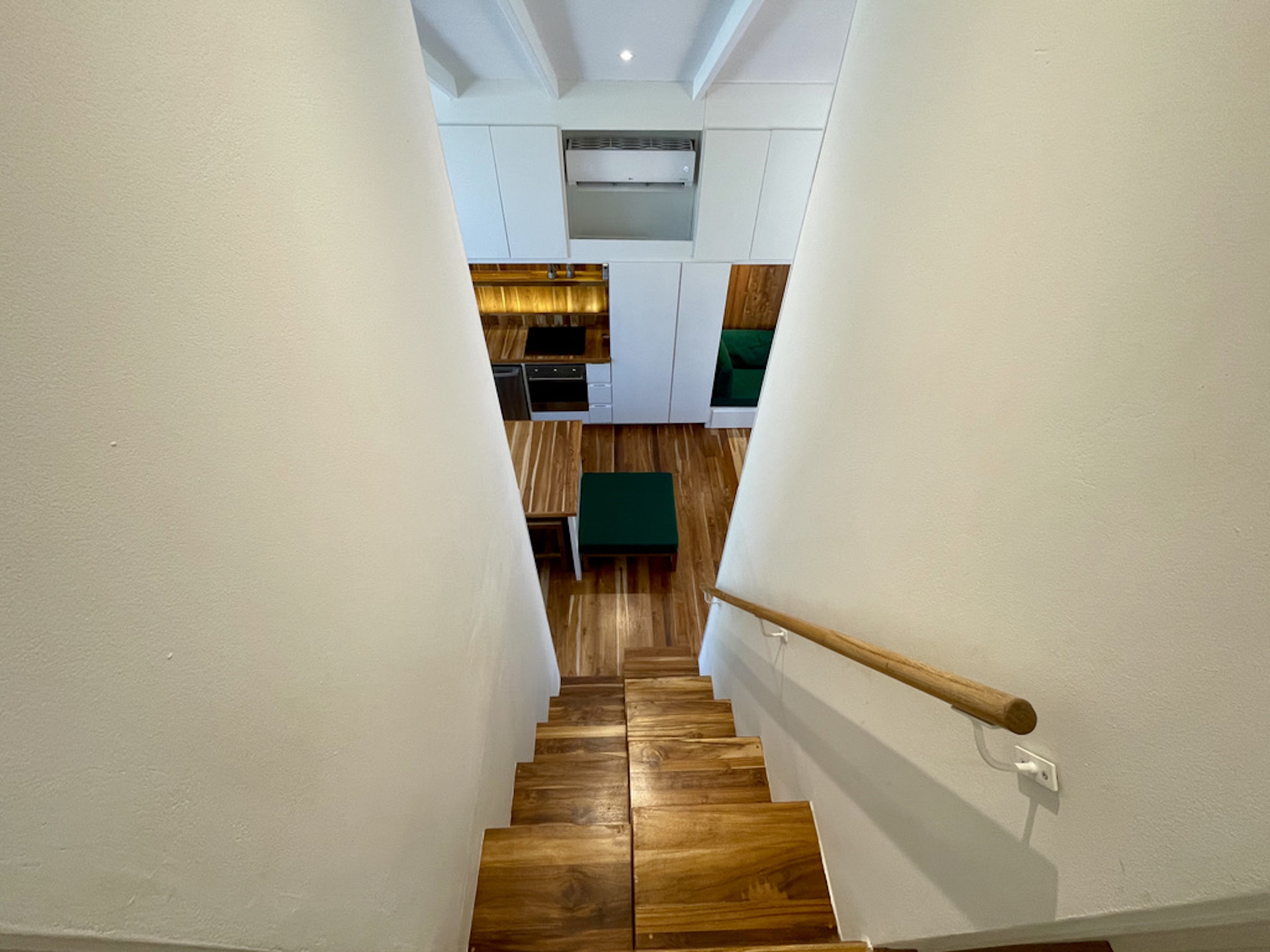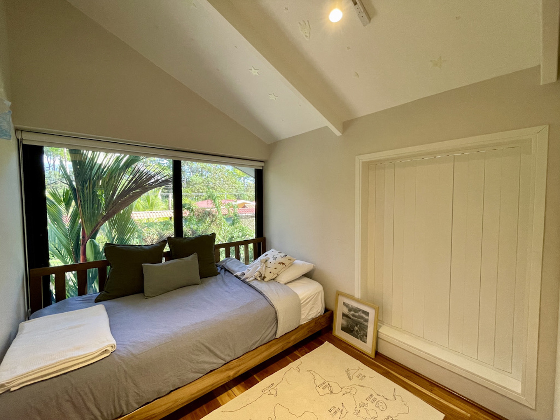 The house hosts 3 little bedroom. One is on the ground floor, it has a queen-size bed and direct access to the terrace. An alternated staircase takes you to the second floor where lie two small single bedrooms, with a wall of glass overlooking the leafy exterior. The bathroom, downstairs is immaculate with a large sliding mirror hiding a laundry closet and a shower.