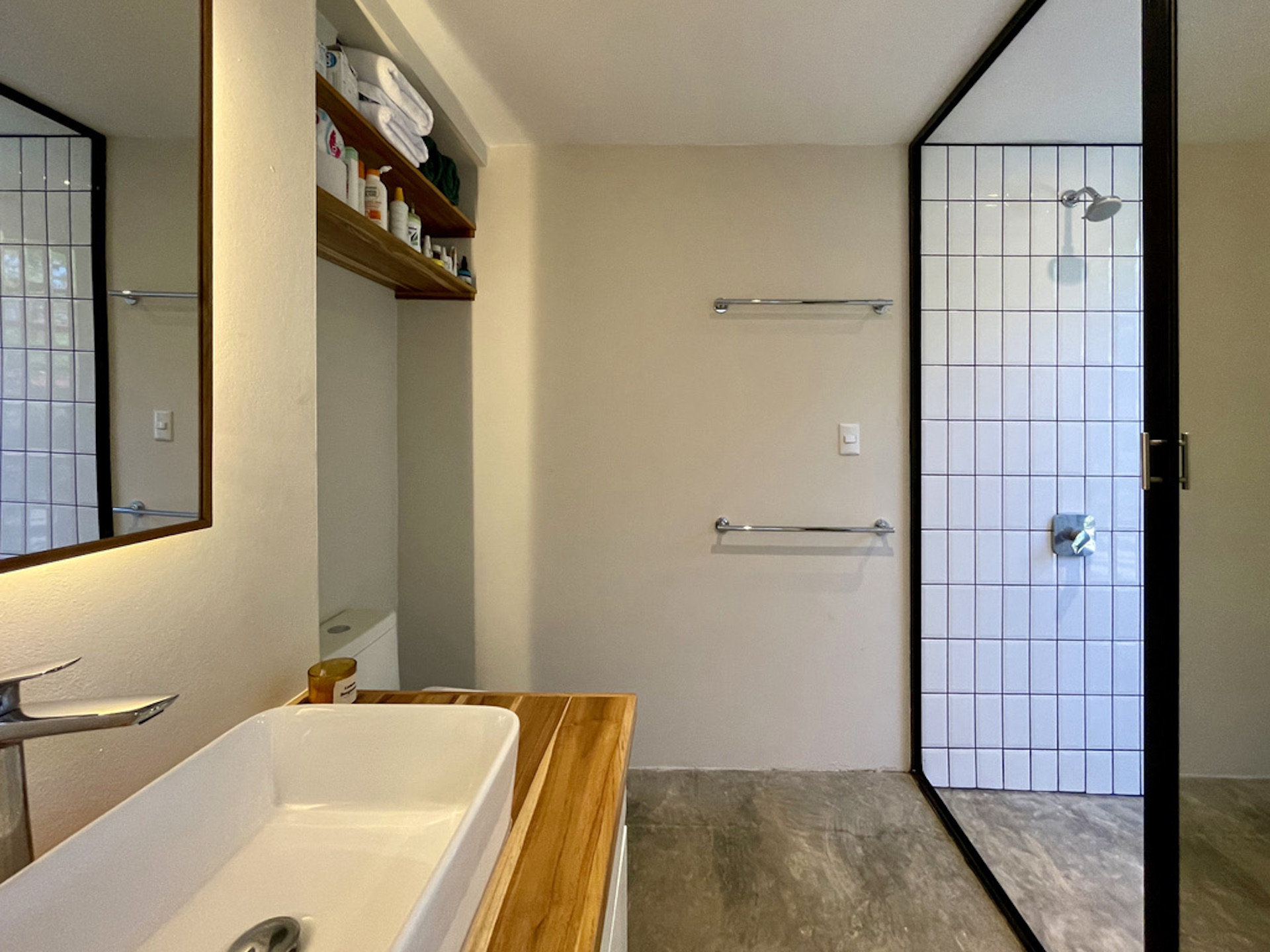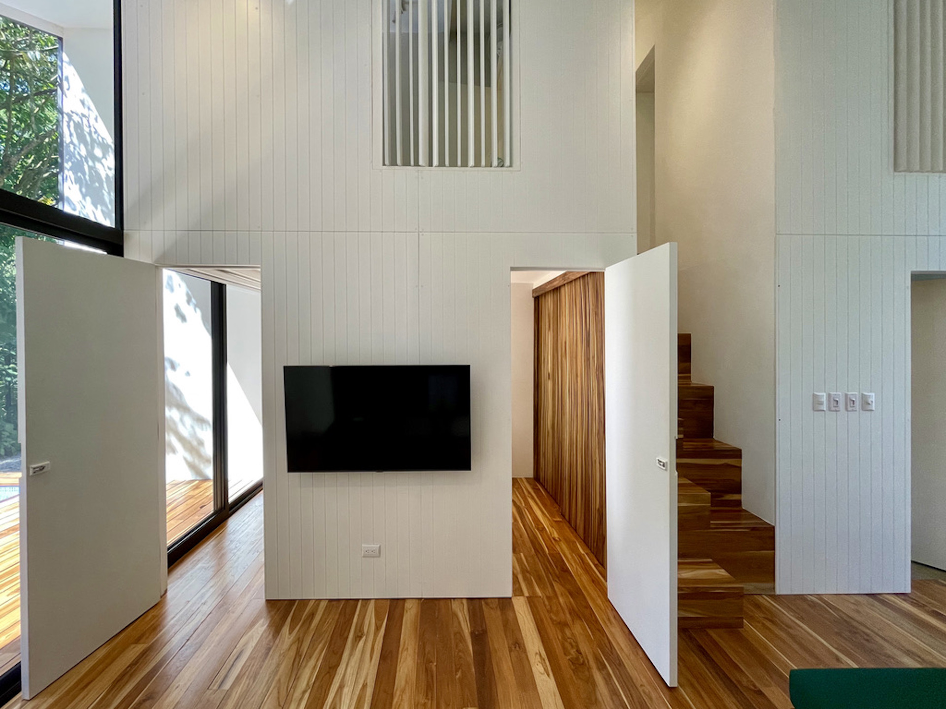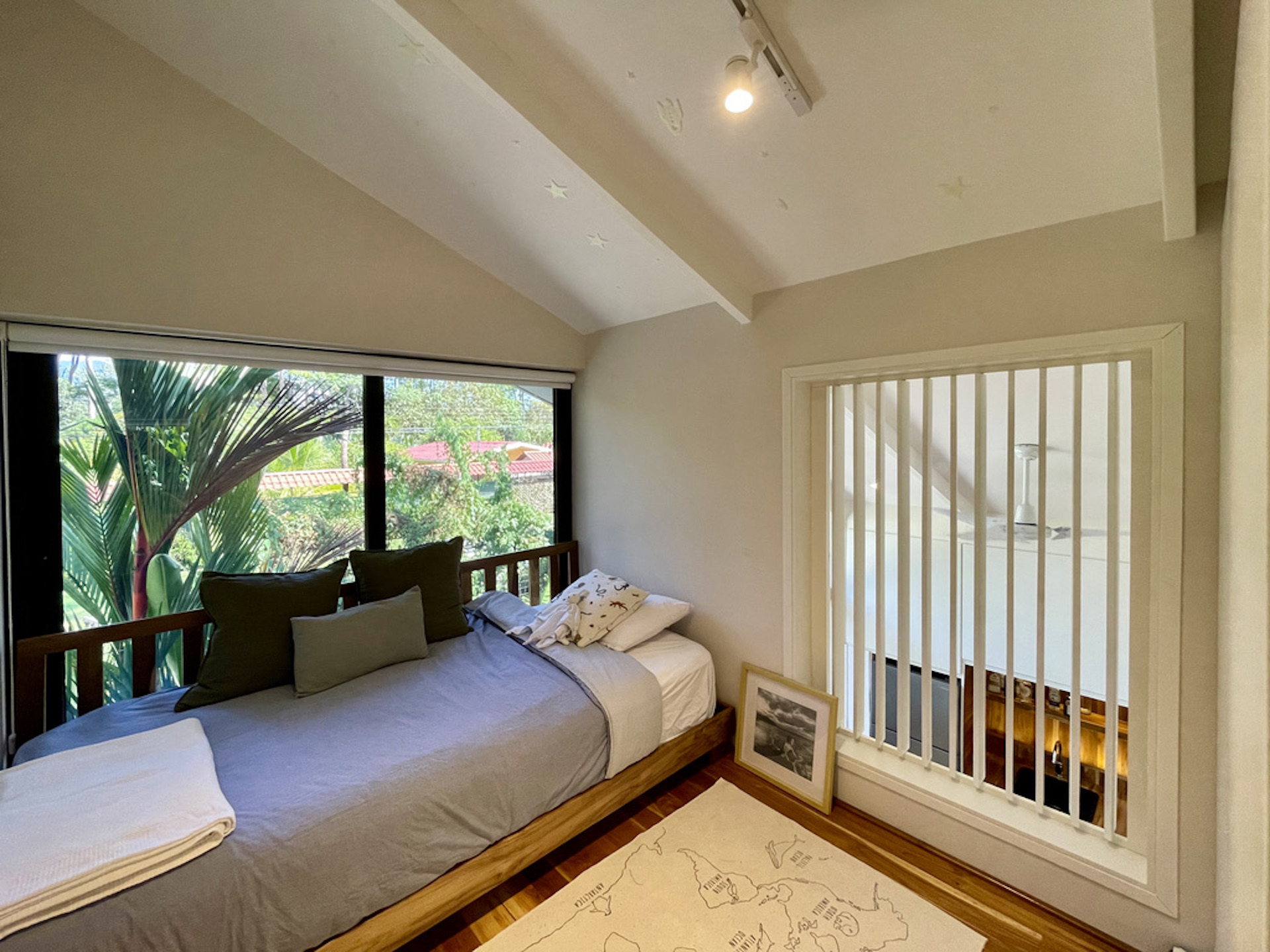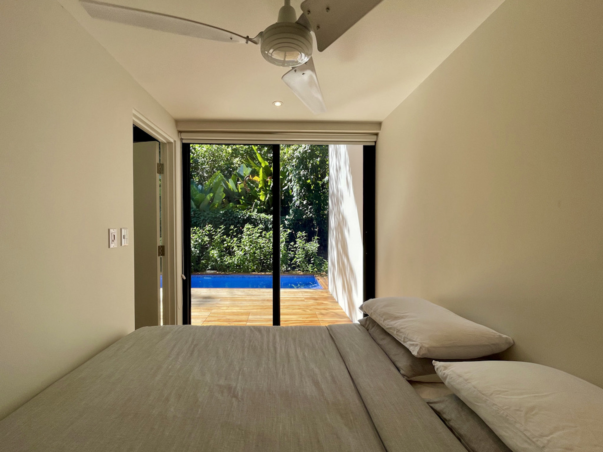 The house hosts 3 little bedroom. One is on the ground floor, it has a queen-size bed and direct access to the terrace. An alternated staircase takes you to the second floor where lie two small single bedrooms, with a wall of glass overlooking the leafy exterior. The bathroom, downstairs is immaculate with a large sliding mirror hiding a laundry closet and a shower.