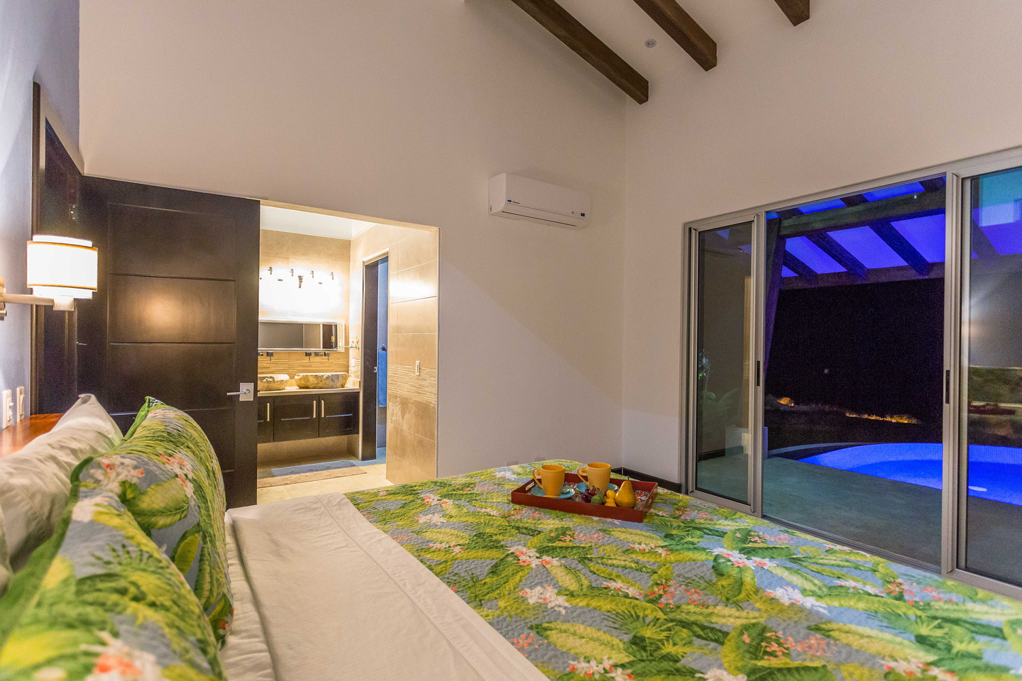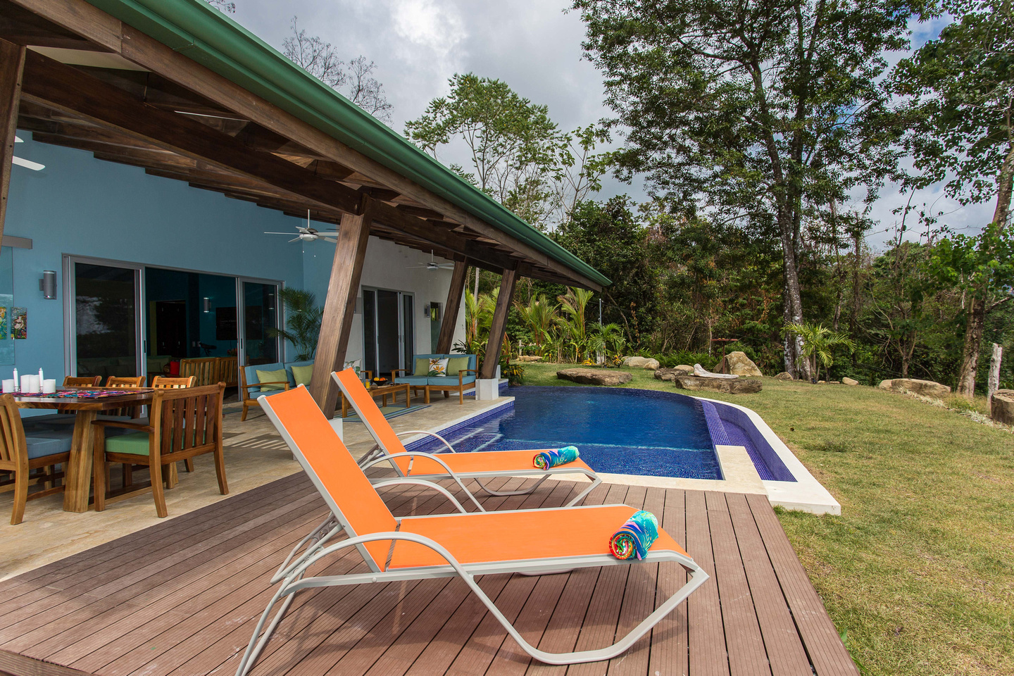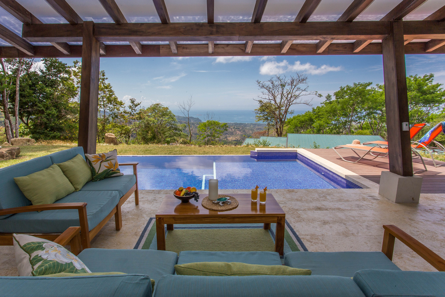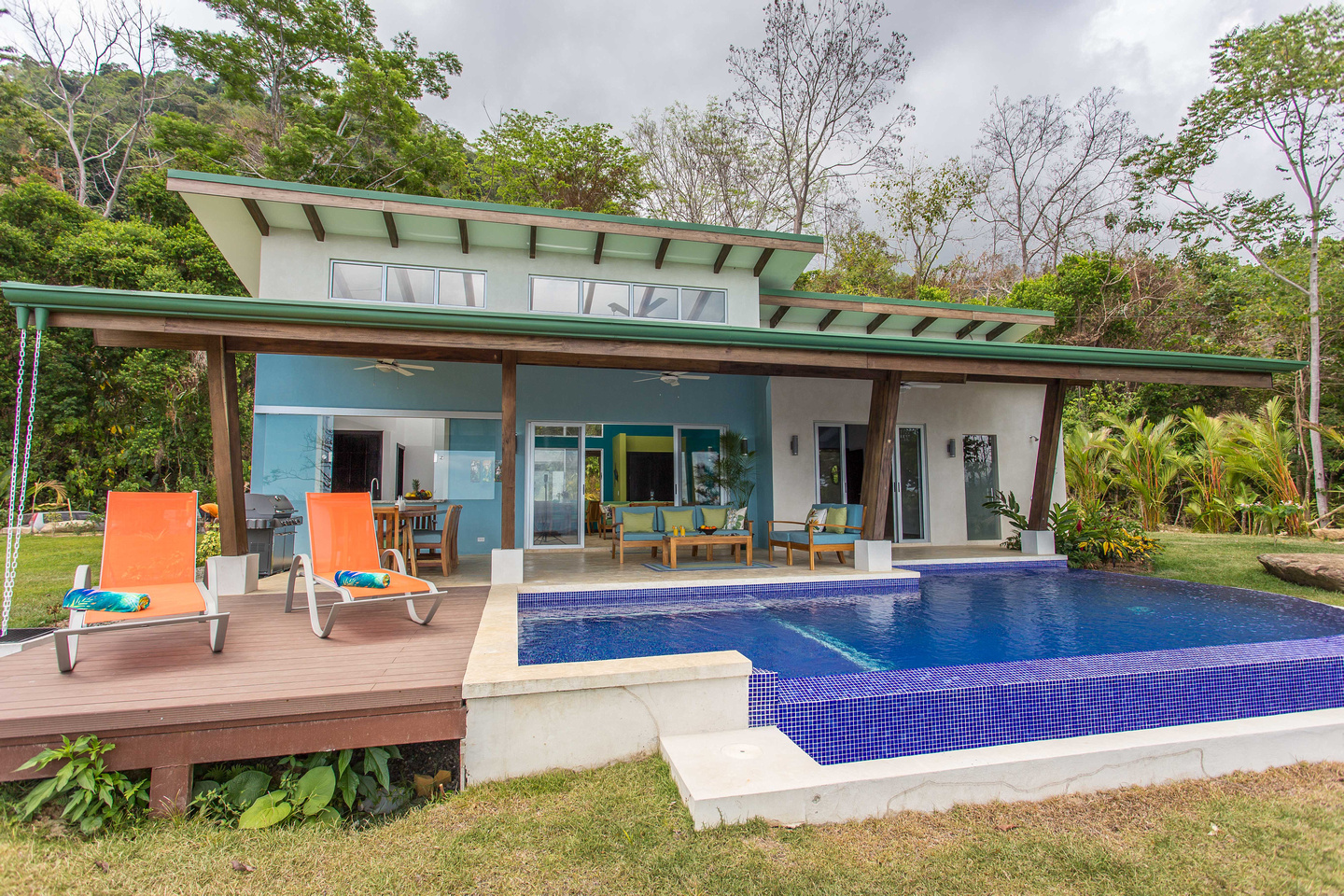 The 2,300 sq. ft. home features a streamline modern design overlooking the jungle, ocean and an small pick of the Whale's Tail. The kitchen and living area features an open floor plan, with sliding glass doors into the pool side terrace. The kitchen is finished with marble counter tops hardwood cabinetry. The single plane roof design allows for natural airflow, keeping the main living area a comfortable temperature without the day. A bib terrace looking down to the infinity edge pool will keep you cool all day. The infinity edge pool faces the ocean and the forest where one will see a variety of wildlife such as Howler monkeys, Capuchin monkeys, Scarlet Macaws, green parrots, and much more!