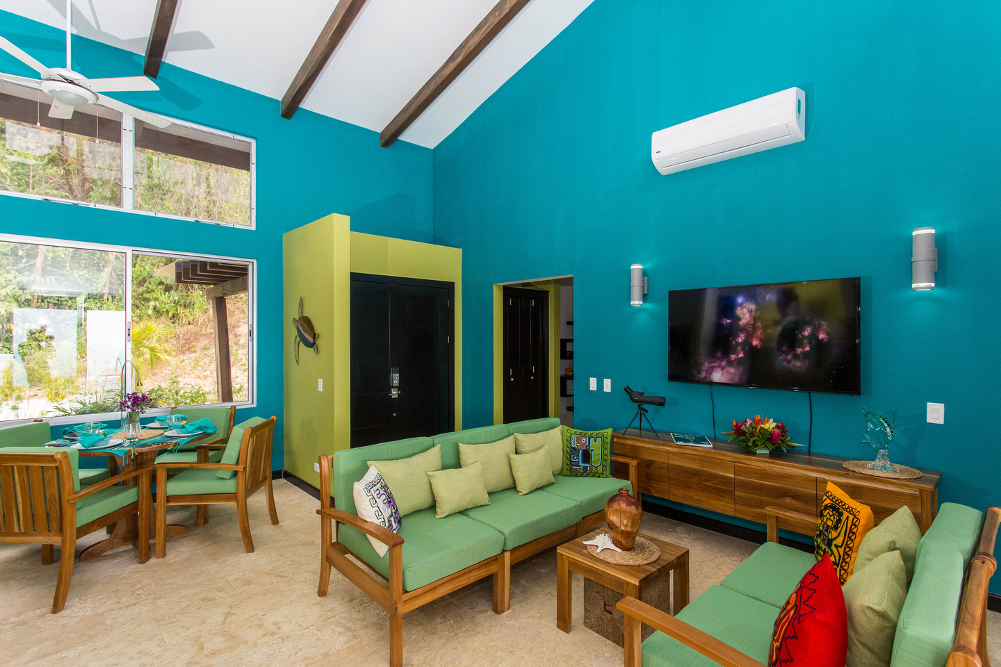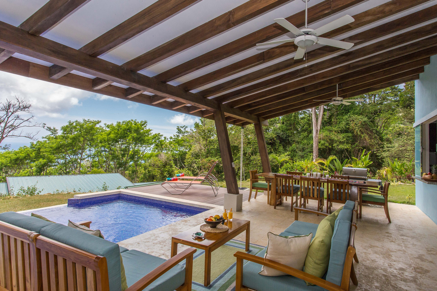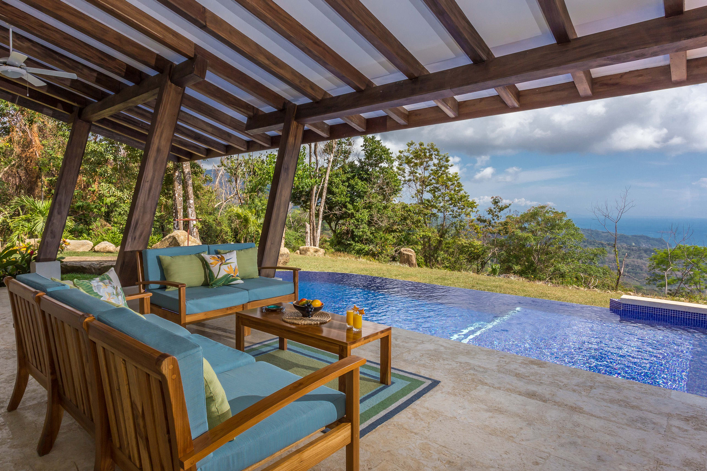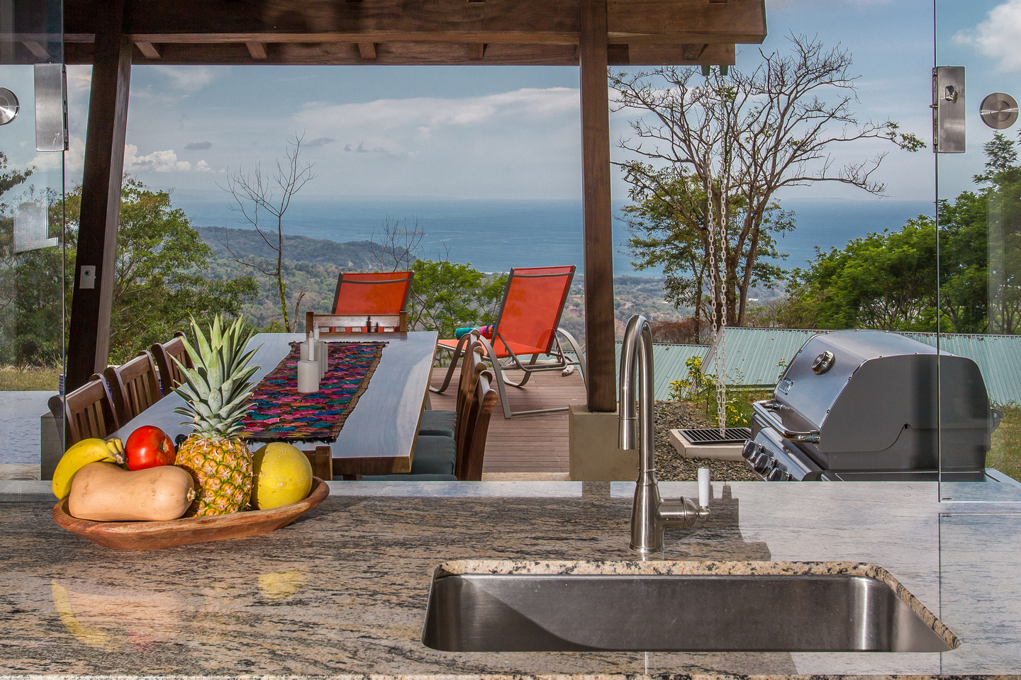 The 2,300 sq. ft. home features a streamline modern design overlooking the jungle, ocean and an small pick of the Whale's Tail. The kitchen and living area features an open floor plan, with sliding glass doors into the pool side terrace. The kitchen is finished with marble counter tops hardwood cabinetry. The single plane roof design allows for natural airflow, keeping the main living area a comfortable temperature without the day. A bib terrace looking down to the infinity edge pool will keep you cool all day. The infinity edge pool faces the ocean and the forest where one will see a variety of wildlife such as Howler monkeys, Capuchin monkeys, Scarlet Macaws, green parrots, and much more!