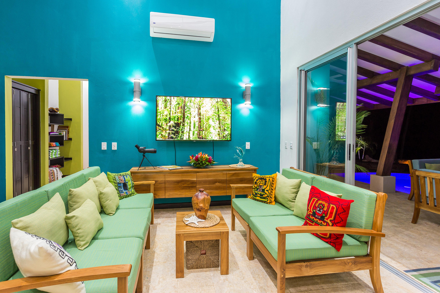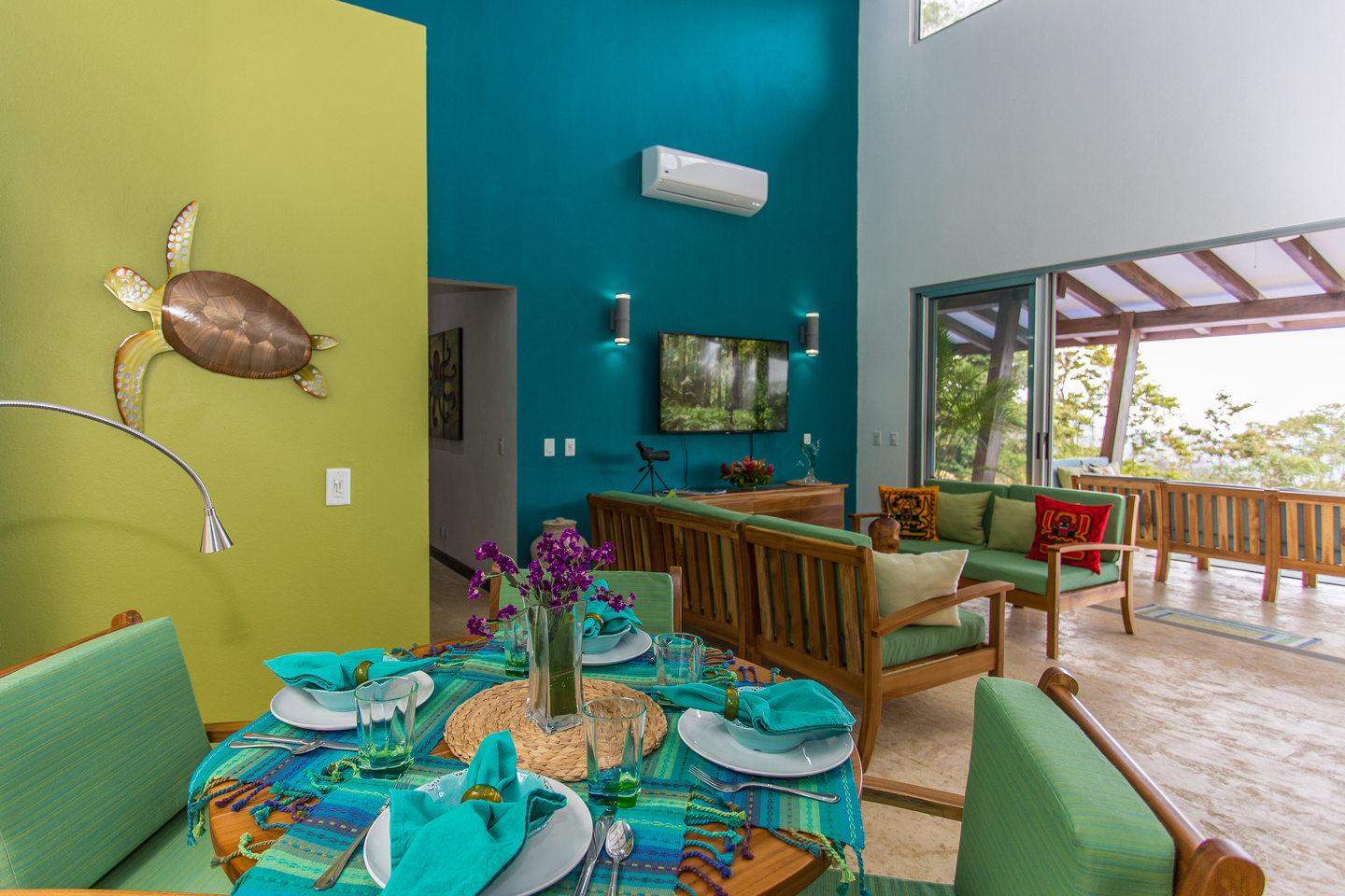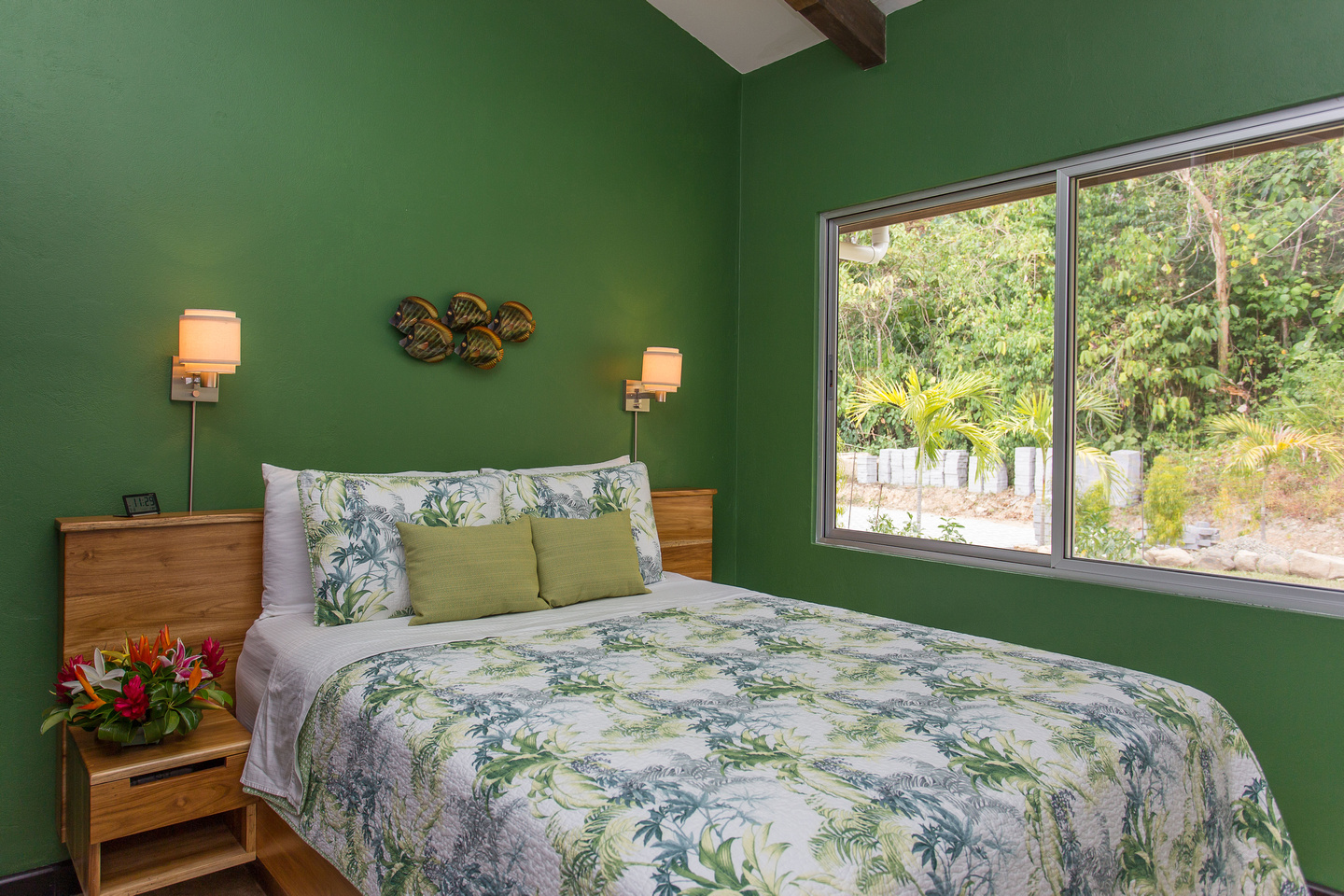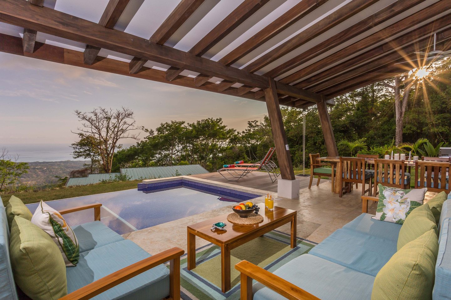 The 2,300 sq. ft. home features a streamline modern design overlooking the jungle, ocean and an small pick of the Whale's Tail. The kitchen and living area features an open floor plan, with sliding glass doors into the pool side terrace. The kitchen is finished with marble counter tops hardwood cabinetry. The single plane roof design allows for natural airflow, keeping the main living area a comfortable temperature without the day. A bib terrace looking down to the infinity edge pool will keep you cool all day. The infinity edge pool faces the ocean and the forest where one will see a variety of wildlife such as Howler monkeys, Capuchin monkeys, Scarlet Macaws, green parrots, and much more!