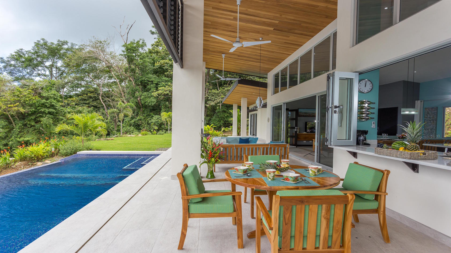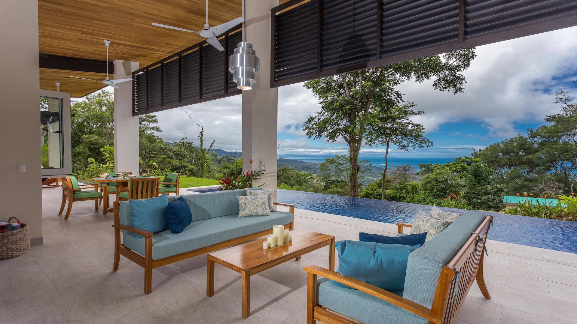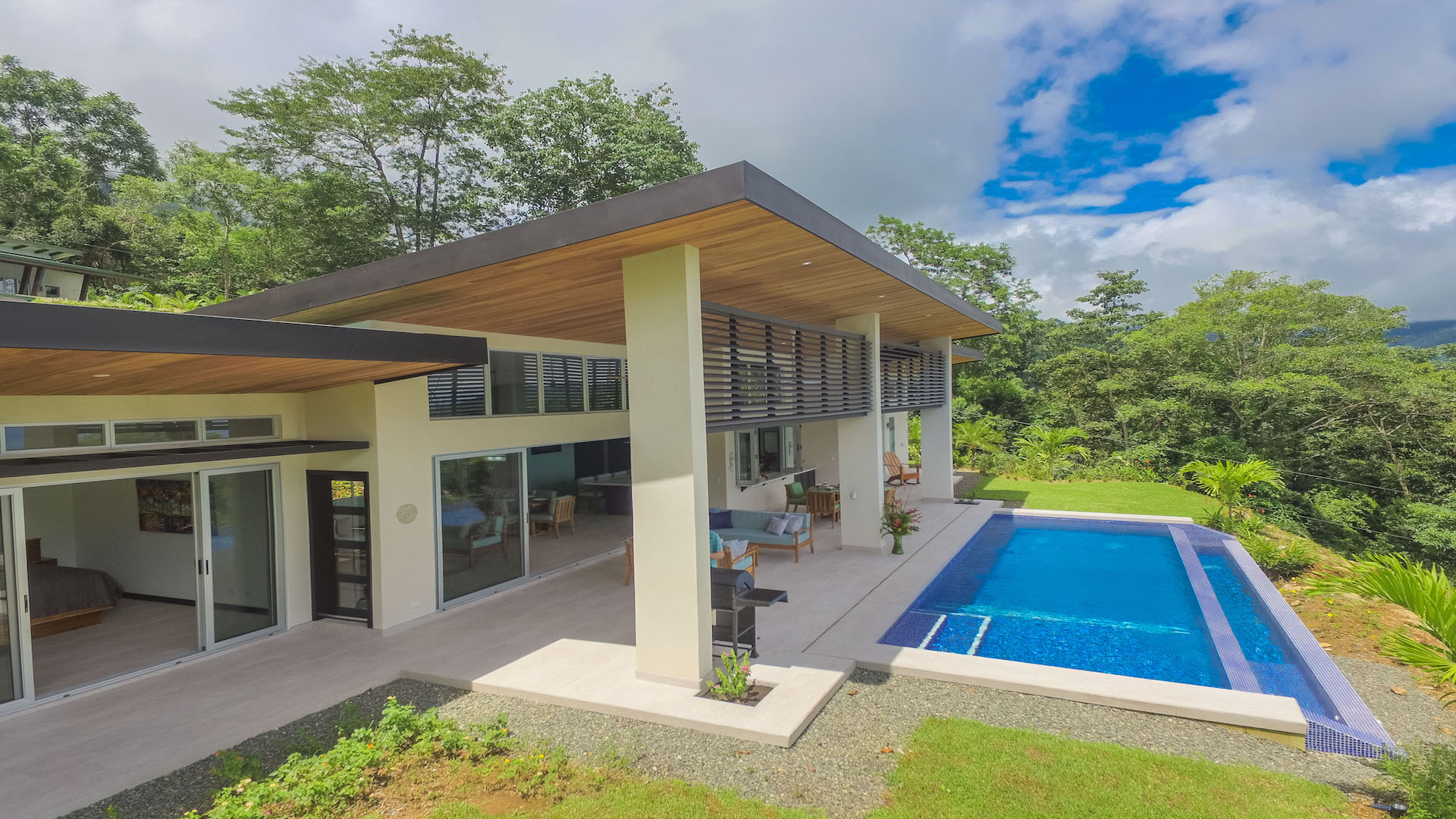 The 3,300 sq. ft. home features a streamline modern design overlooking the jungle, ocean and an small pick of the Whale\'s Tail. The kitchen and living area features an open floor plan, with sliding glass doors into the pool side terrace. A big and long infinity edge pool by the giant covered terrace will sells you. The kitchen will be finished with marble counter tops & hardwood cabinetry. The single plane roof design allows for natural airflow, keeping the main living area a comfortable temperature without the day. A big terrace looking down to the infinity edge pool will keep you cool all day. The infinity edge pool faces the ocean and the forest where one will see a variety of wildlife such as Howler monkeys, Capuchin monkeys, Scarlet Macaws, green parrots, and much more!