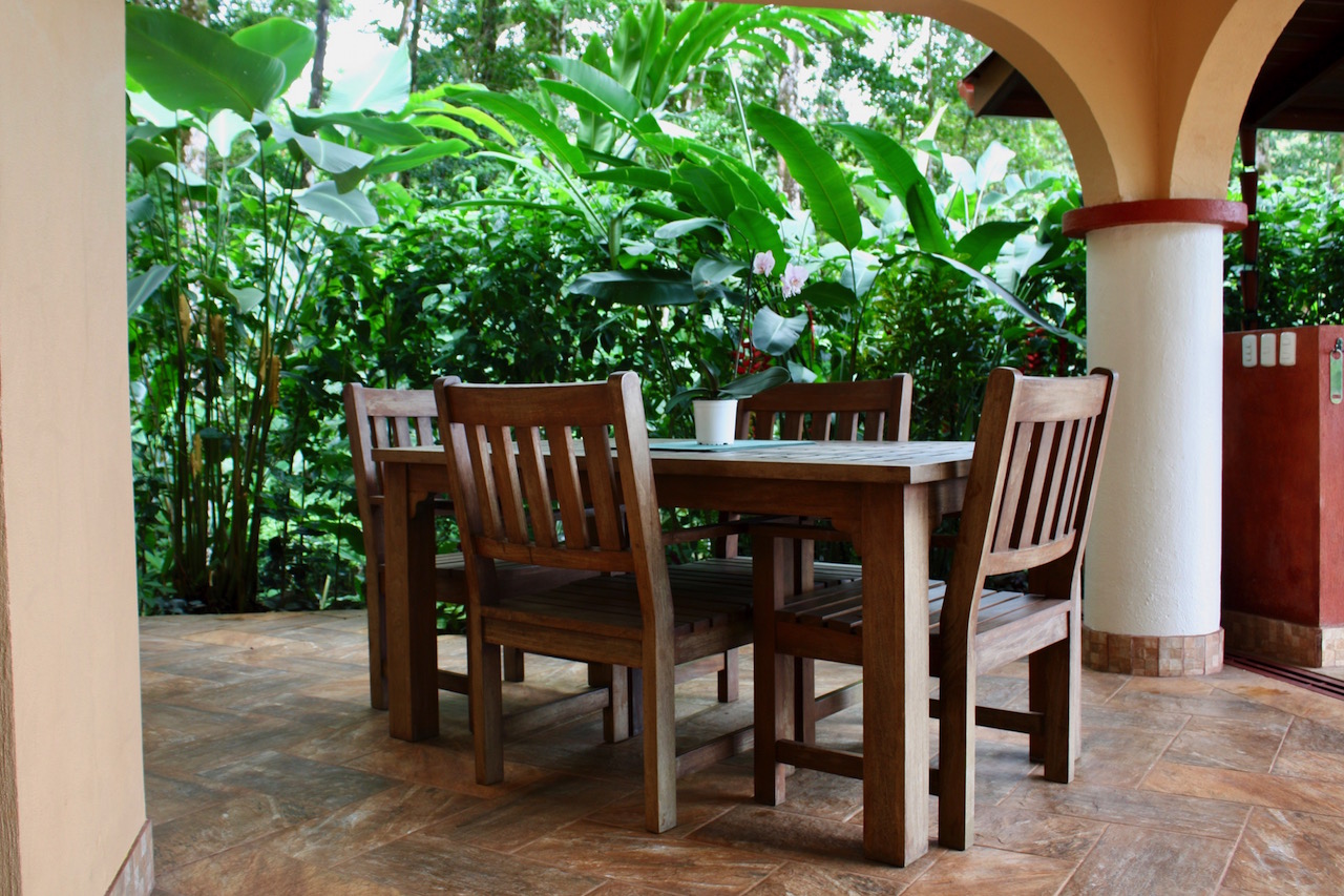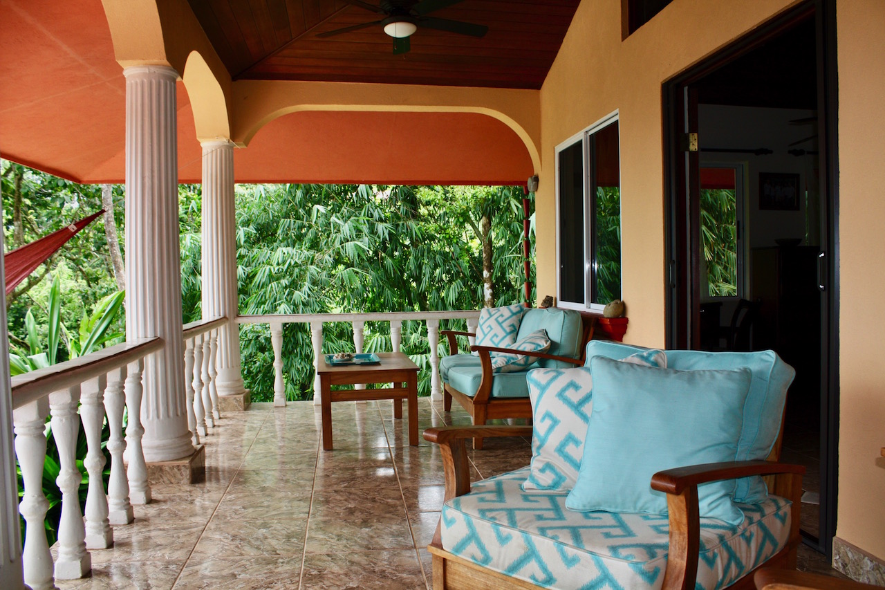 House: This 2-story home takes full advantage of the views and breezes! The entire upper level is the spacious master suite with private bathroom and balcony. This is a fantastic place to enjoy a morning coffee and watch the toucans fly across the view. On the lower level youll find two guest bedrooms with air conditioning, a shared bathroom, laundry room, and storage areas. The kitchen and living room are filled with natural light and flow to the patio and outdoor living spaces. Youll want to spend all of your time outside on this beautiful property. The covered outdoor kitchen features a sink, burners, grill, and pizza oven – perfect for entertaining. This house comes fully furnished with custom teak furniture inside and out.