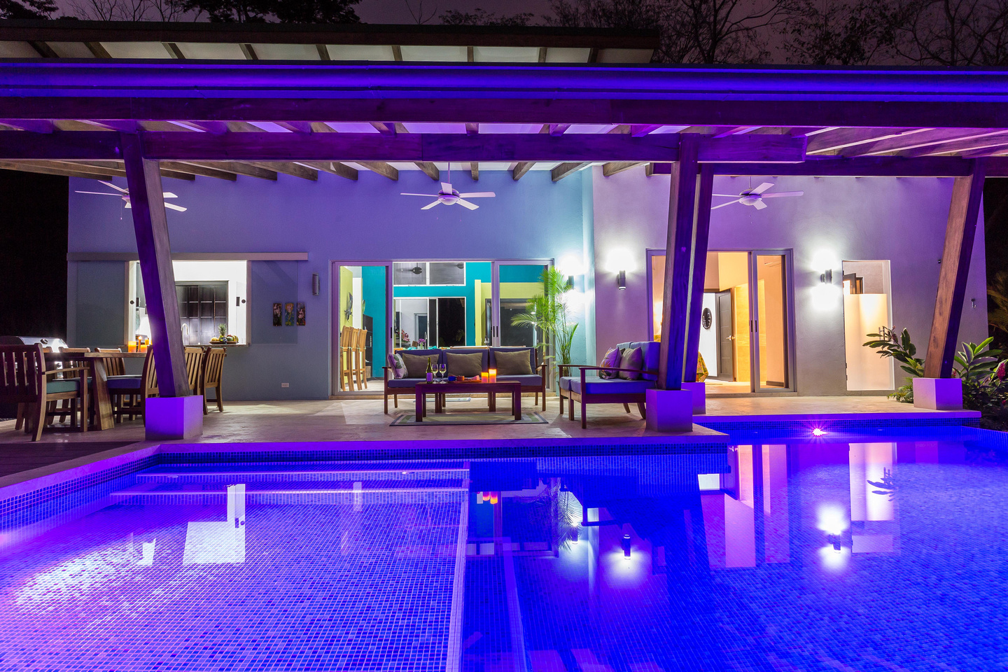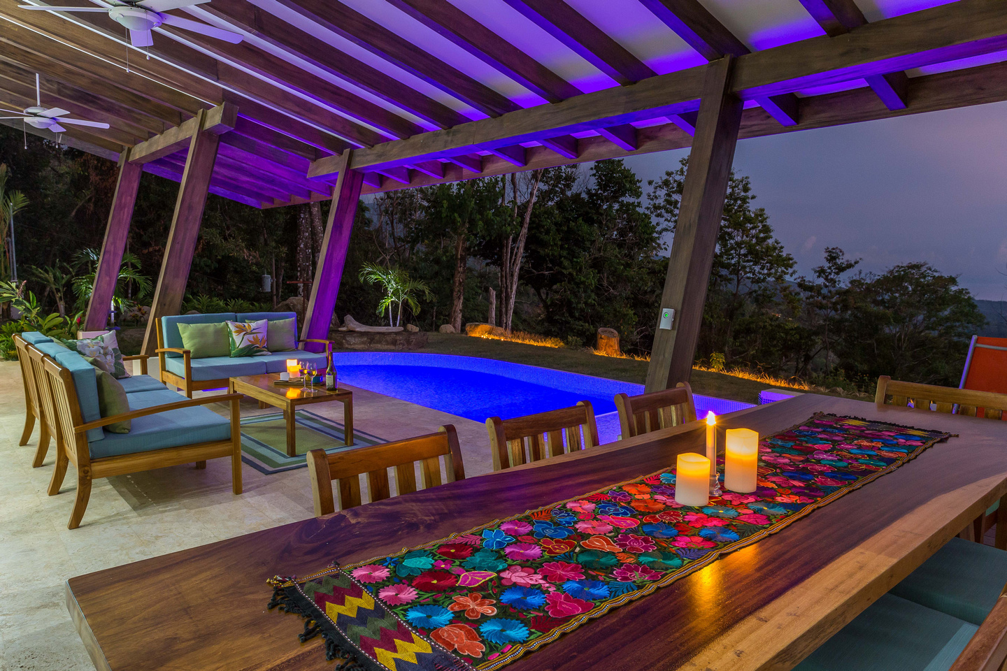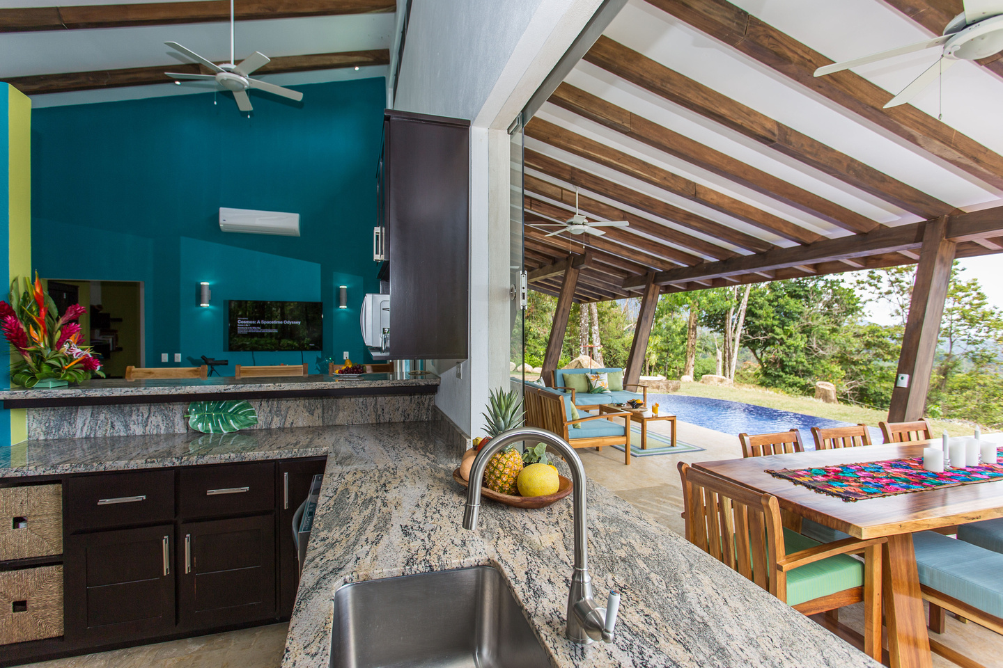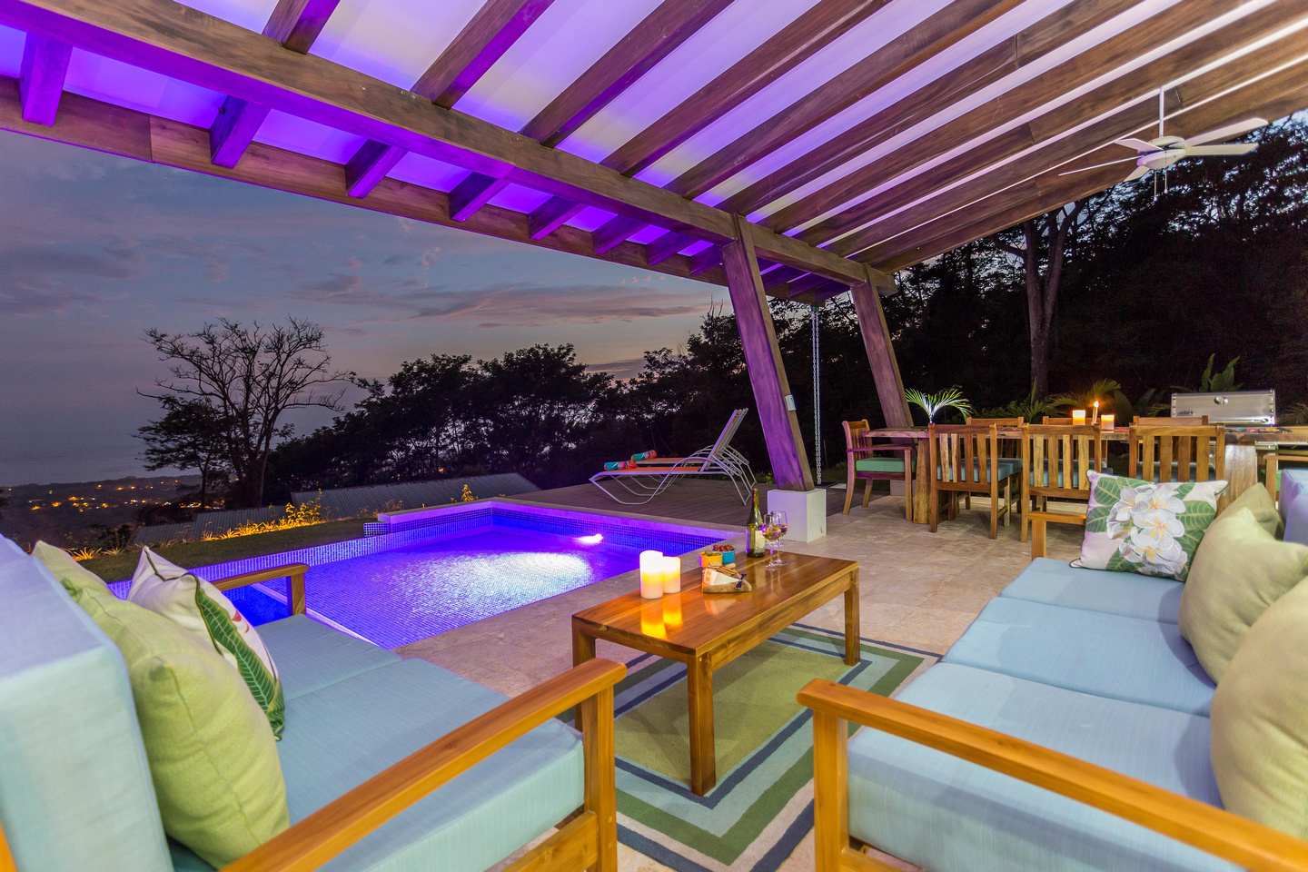 Life happens out-doors in Costa Rica. There may be times when you'll opt to hangout inside, and you can certainly do this due to the gorgeous living and dining room areas of the house, but for the most part, you'll want to do your dining and visiting with friends & family in the 24/7 perfect climate of Costa Rica. This is done in the outdoor dining area that features a gorgeous guanacaste wood table that is located just near the bar-b-cue and is in easy proximity to the pass-through window from the kitchen. There is also the couch-defined outdoor living room with couches on 3 sides, looking over the pool and out to the ocean.