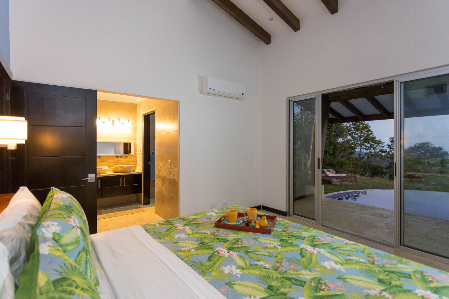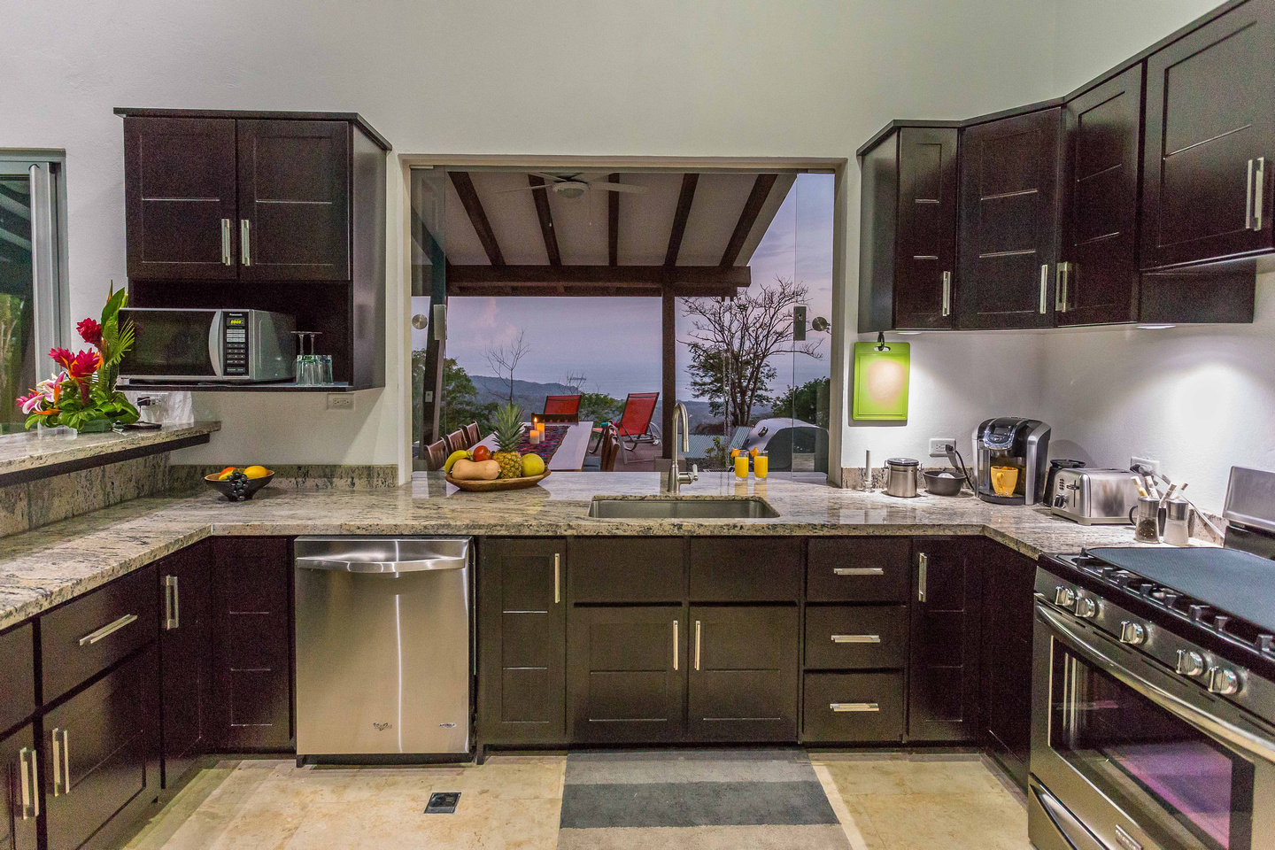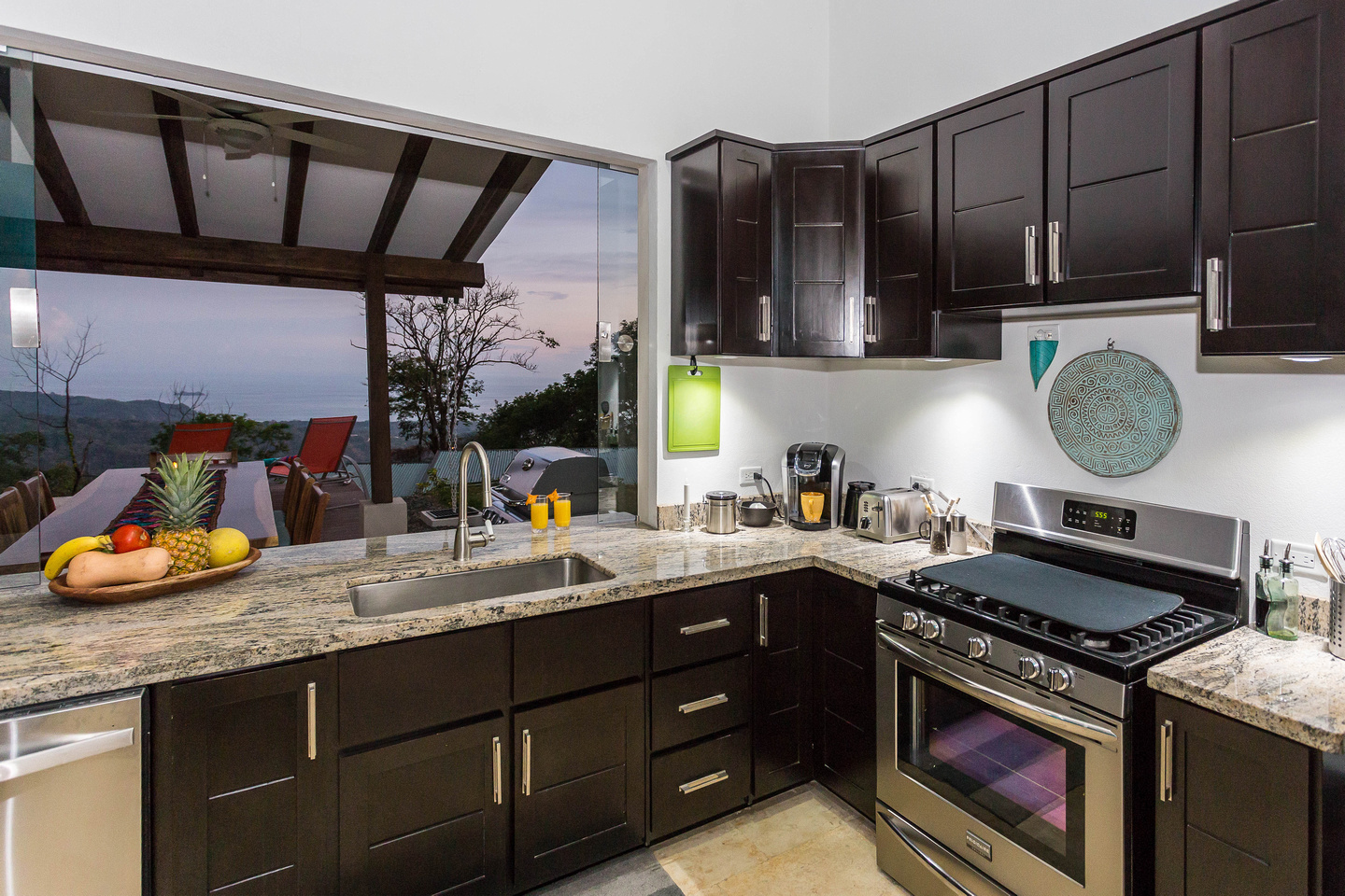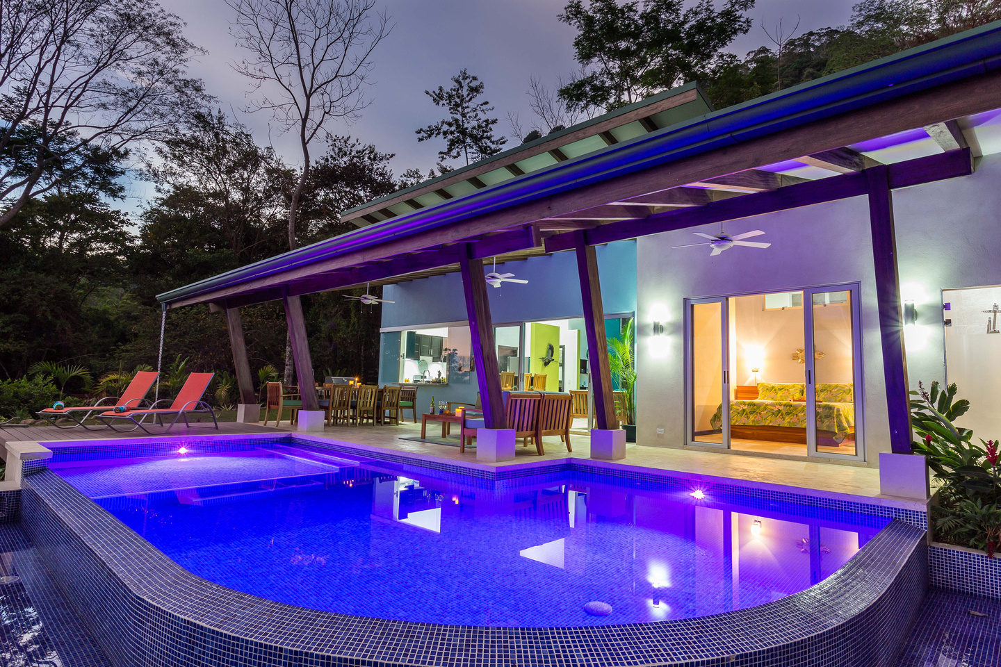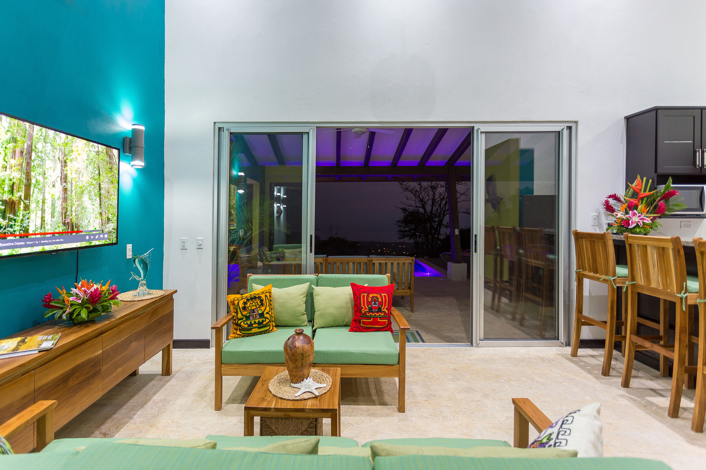 Life happens out-doors in Costa Rica. There may be times when you'll opt to hangout inside, and you can certainly do this due to the gorgeous living and dining room areas of the house, but for the most part, you'll want to do your dining and visiting with friends & family in the 24/7 perfect climate of Costa Rica. This is done in the outdoor dining area that features a gorgeous guanacaste wood table that is located just near the bar-b-cue and is in easy proximity to the pass-through window from the kitchen. There is also the couch-defined outdoor living room with couches on 3 sides, looking over the pool and out to the ocean.
