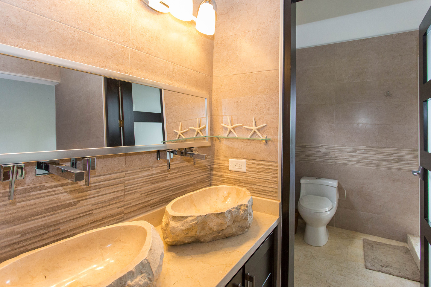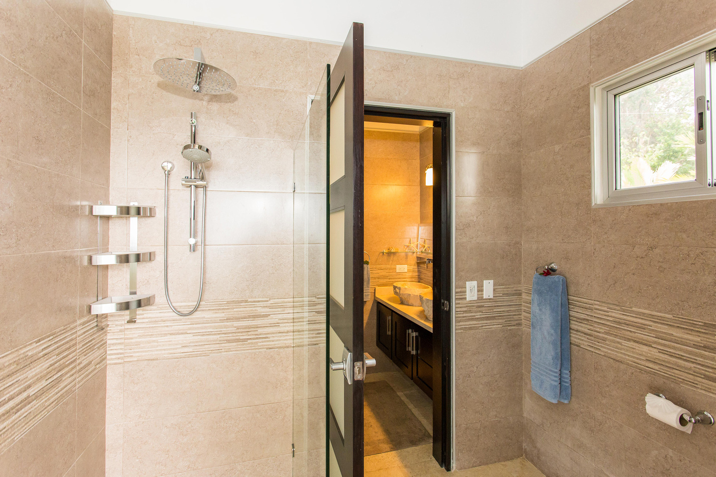The master bedroom offers a gorgeous ocean view, even from the bed. Wake to this view and you're sure to have a good day. There is a large closet and twin side-by-side stone sinks. The master shower features a glass door to the outside. Once outside, you'll notice that you can choose to shower right there as well.