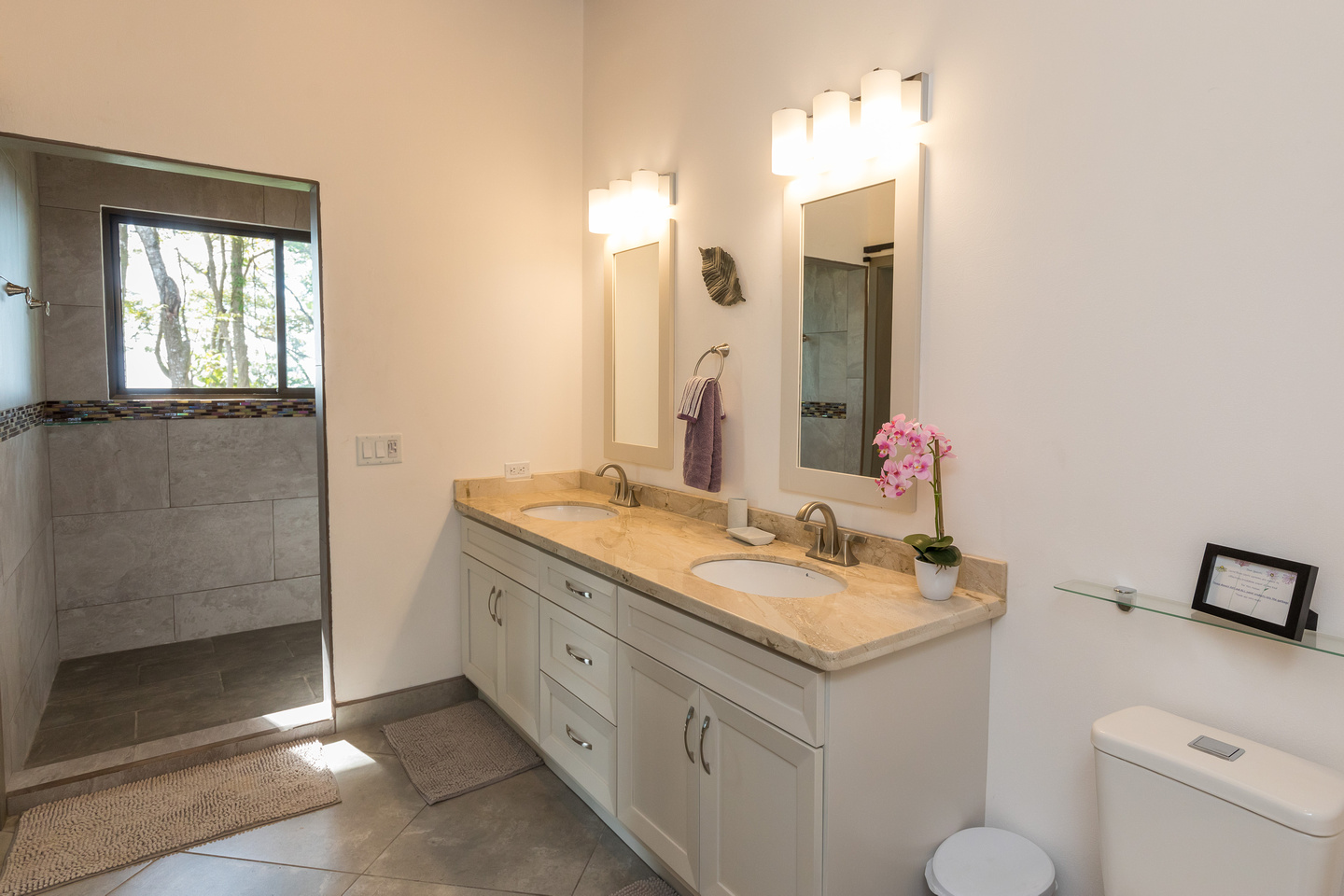 The two guest master bedrooms have their own on-suite full bathrooms with dual sinks and mirrors, and of course ocean view showers! Also the two guest masters have their own covered terrace to sit with views of the ocean and the surrounding forest. Both guest rooms have armoire closets and a vanity or desk space created with rustic style hardwood slab.