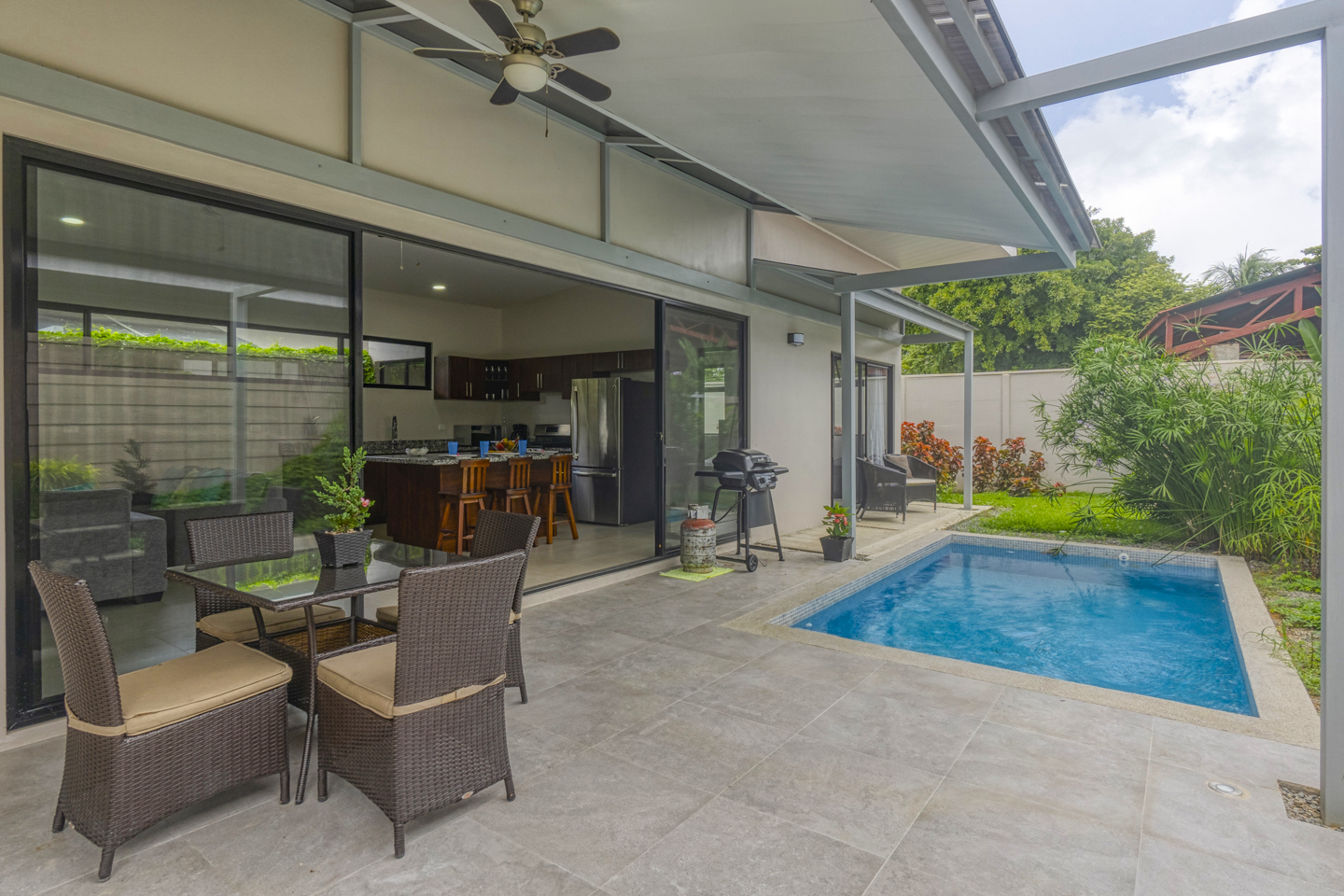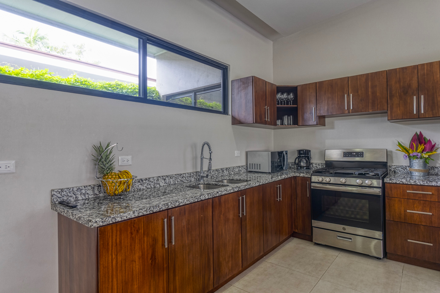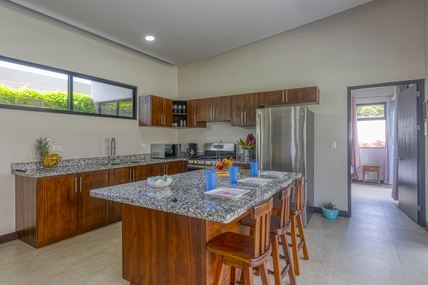 The kitchen has hardwood cabinetry; it is fully equipped with appliances, granite countertops and a big glass sliding door that leads you to the pool area and gardens.
