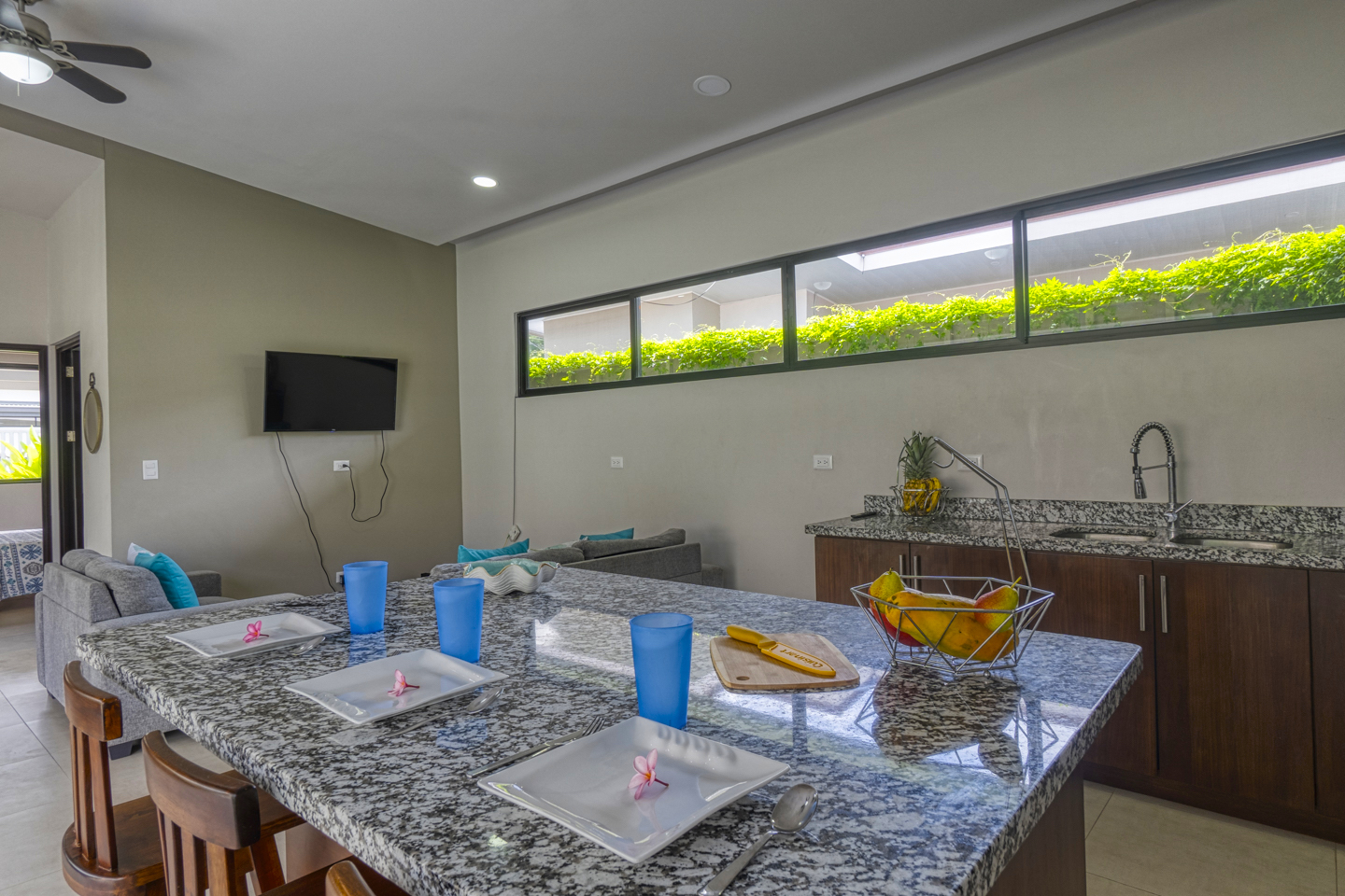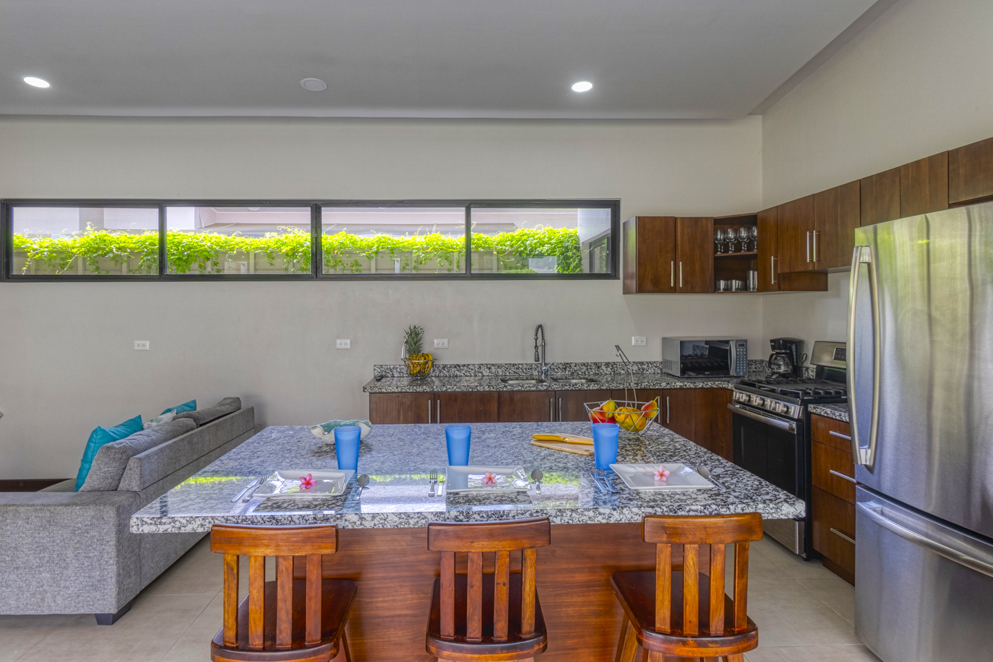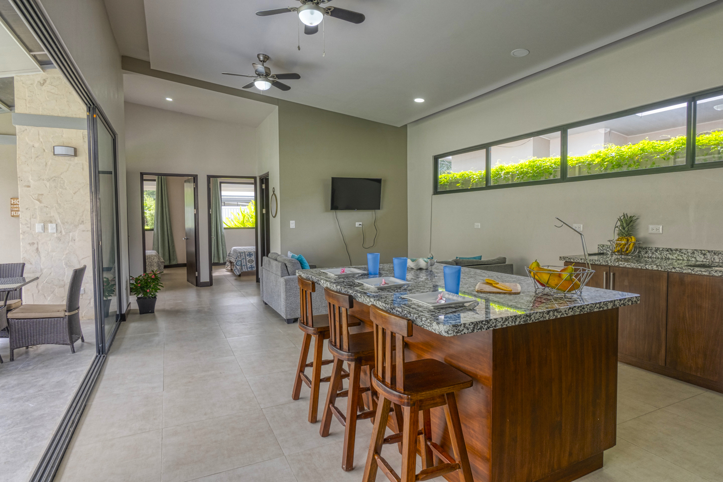 The kitchen has hardwood cabinetry; it is fully equipped with appliances, granite countertops and a big glass sliding door that leads you to the pool area and gardens.
