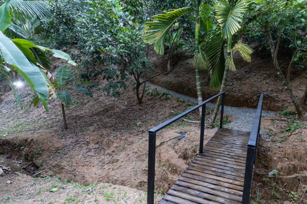 The home it perfectly placed on the lot allowing room on three sides to maintain your privacy. Pool to the left, an extra parking area or room to expand to the right, and the ravine in the back with a path and fruit trees bearing delicious bananas, and more!