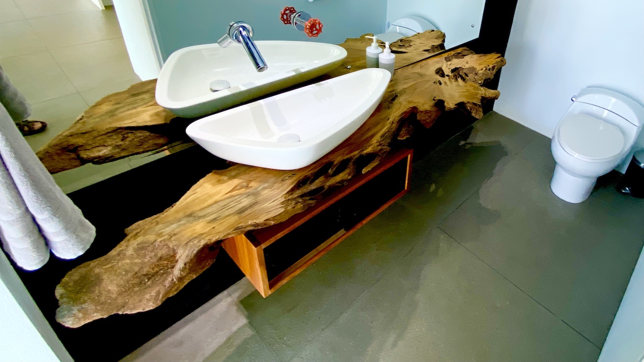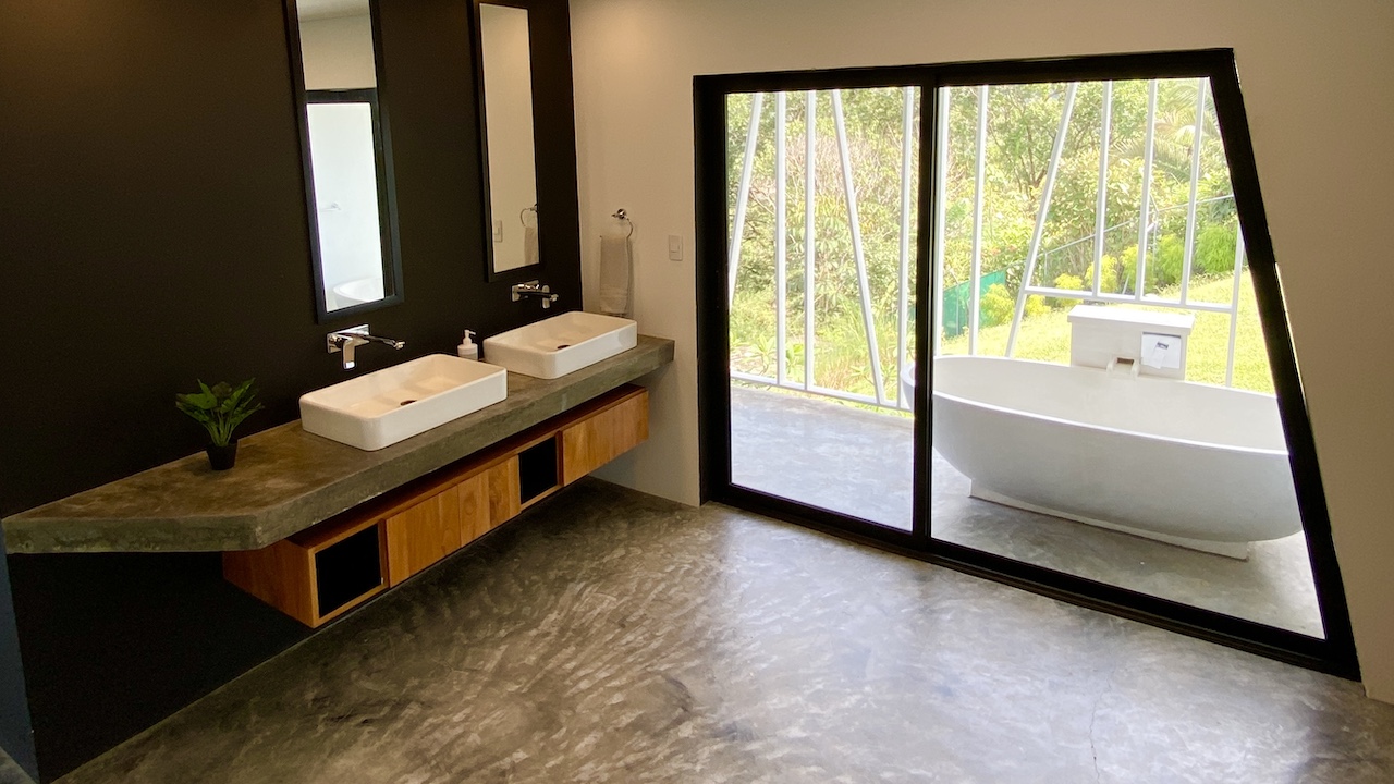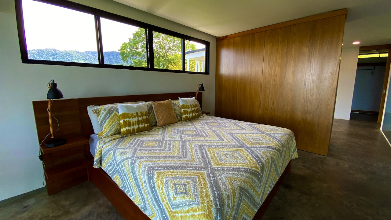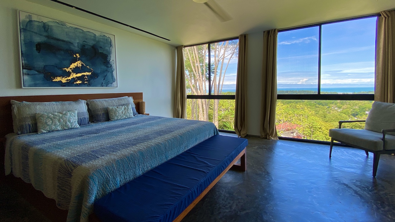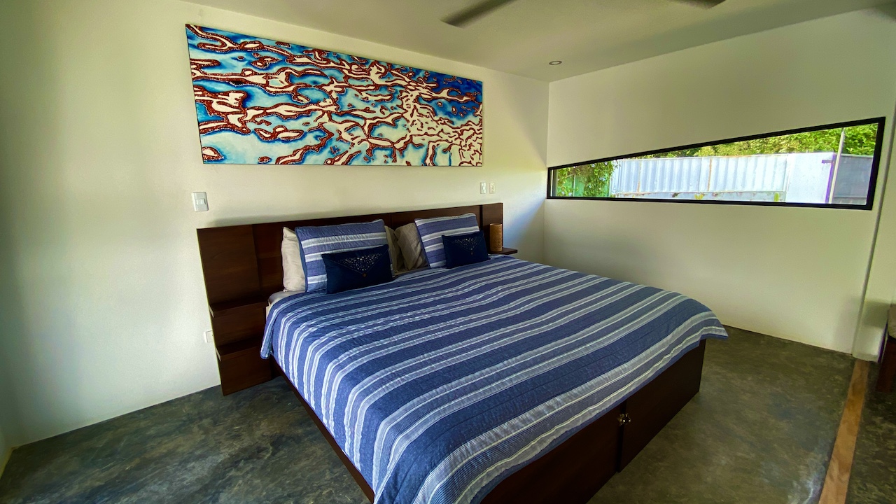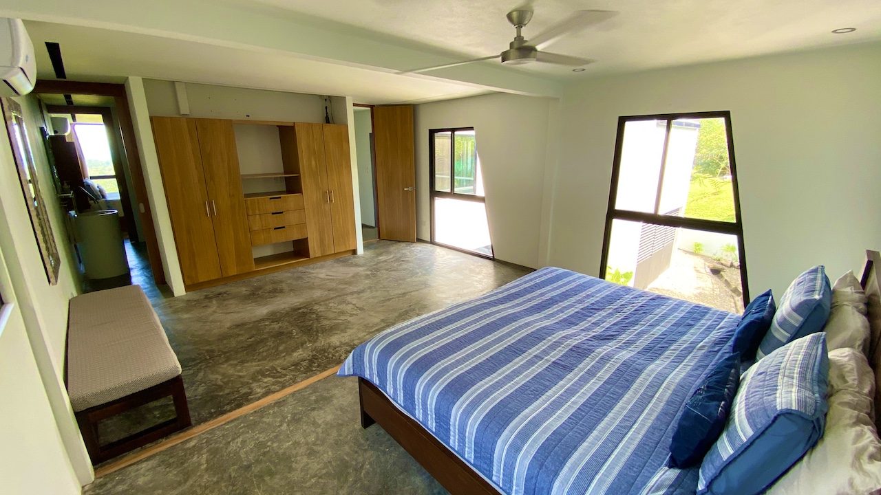 All three bedrooms are located upstairs. The master bedroom features a king bed, air-conditioning, walk-in closet, en-suite bathroom, and an ocean-view deck with stunning sunset views toward the famous Whale’s Tail reef. On a different patio in the master bedroom sits an outdoor soaking tub so you can take in the sights and sounds of the jungle while taking a break from your day in paradise sipping your favorite margarita or freshly blended pineapple ice
