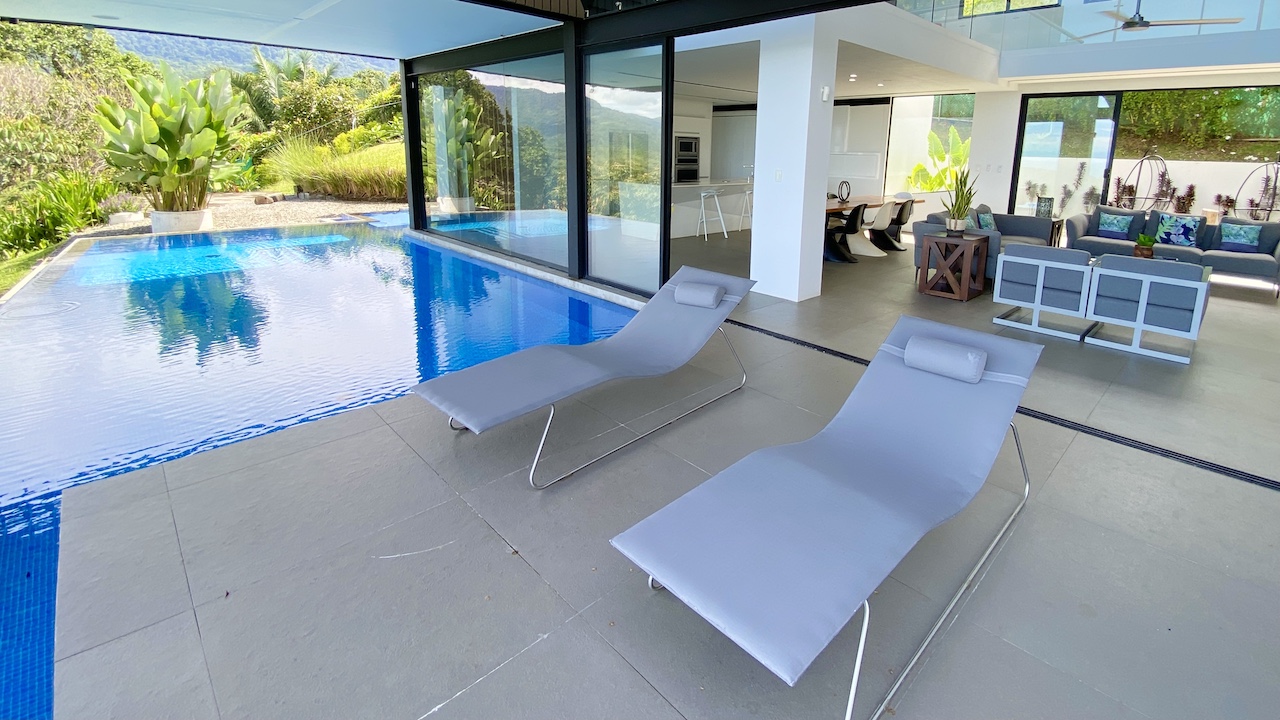 Layout-wise, the infinity pool bumps right up to the kitchen and dining area, so everyone gets to feel like they’re a part of the action, regardless if you’re making breakfast or swimming laps. There are shallow sections inside the pool for water-based lounging, as well as a layout for chairs on the pool side deck.