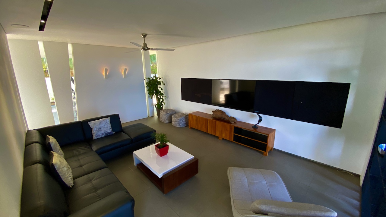The large kitchen is a culinary delight, open-air with a view of everything ideal for entertaining large groups or Intimate settings while watching the sunset. There’s a large dining table with seating for eight guests and another kitchen island with barstools. With all this space to maneuver in both the kitchen and dining areas, you’ll never feel cramped. When you’re done swimming in the pool or flipping burgers on the BBQ, you can cozy up on the living room couches and watch television or movies on the big screen.