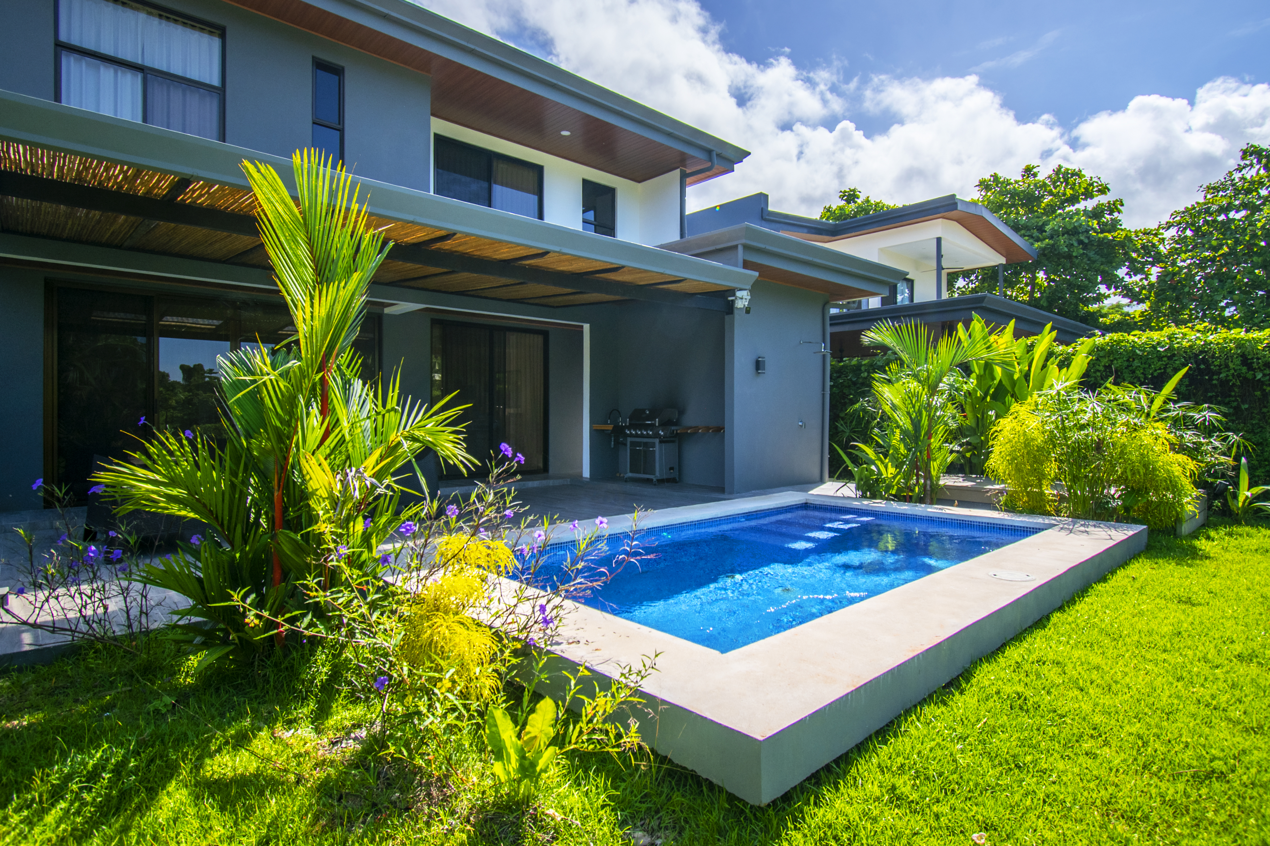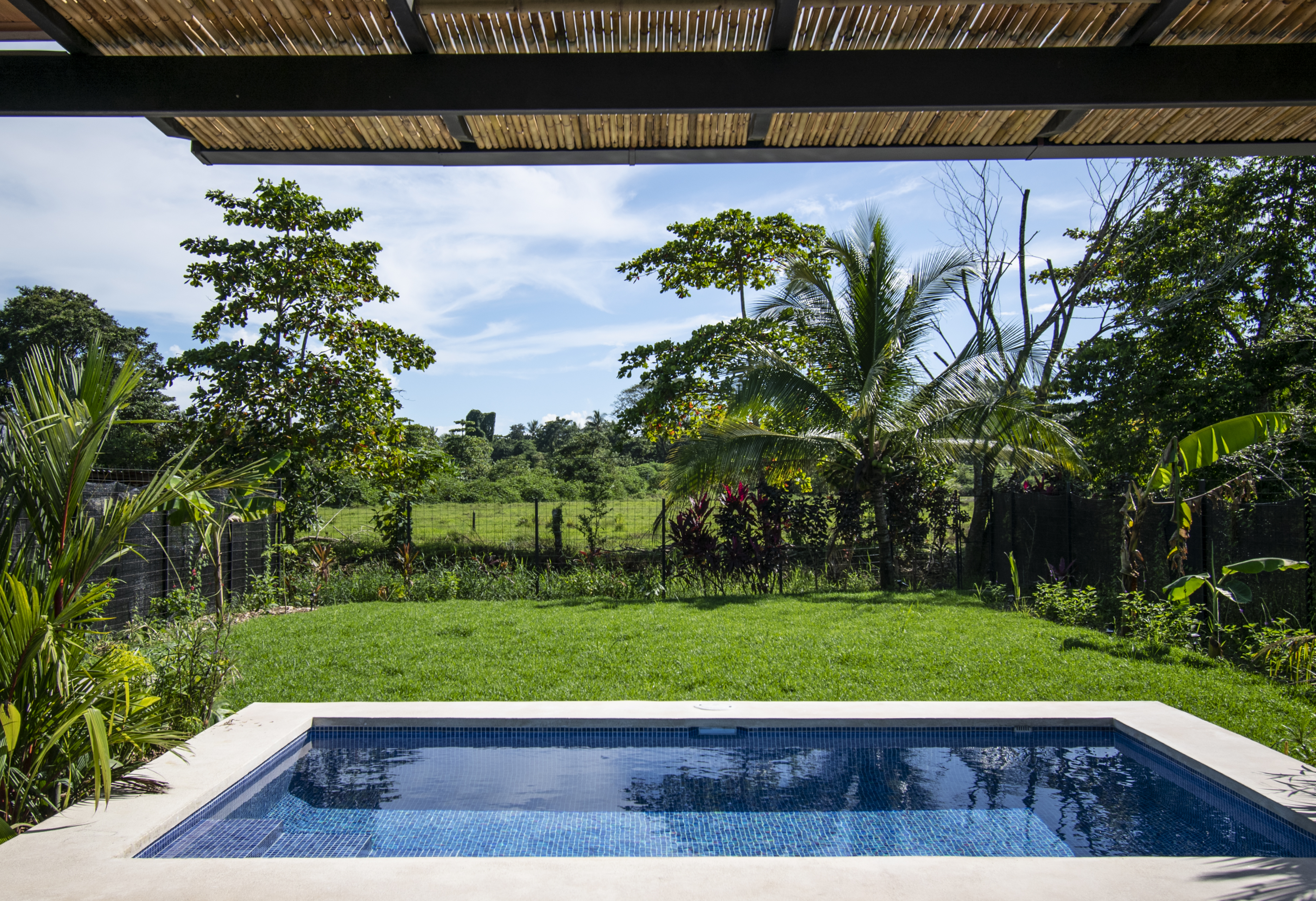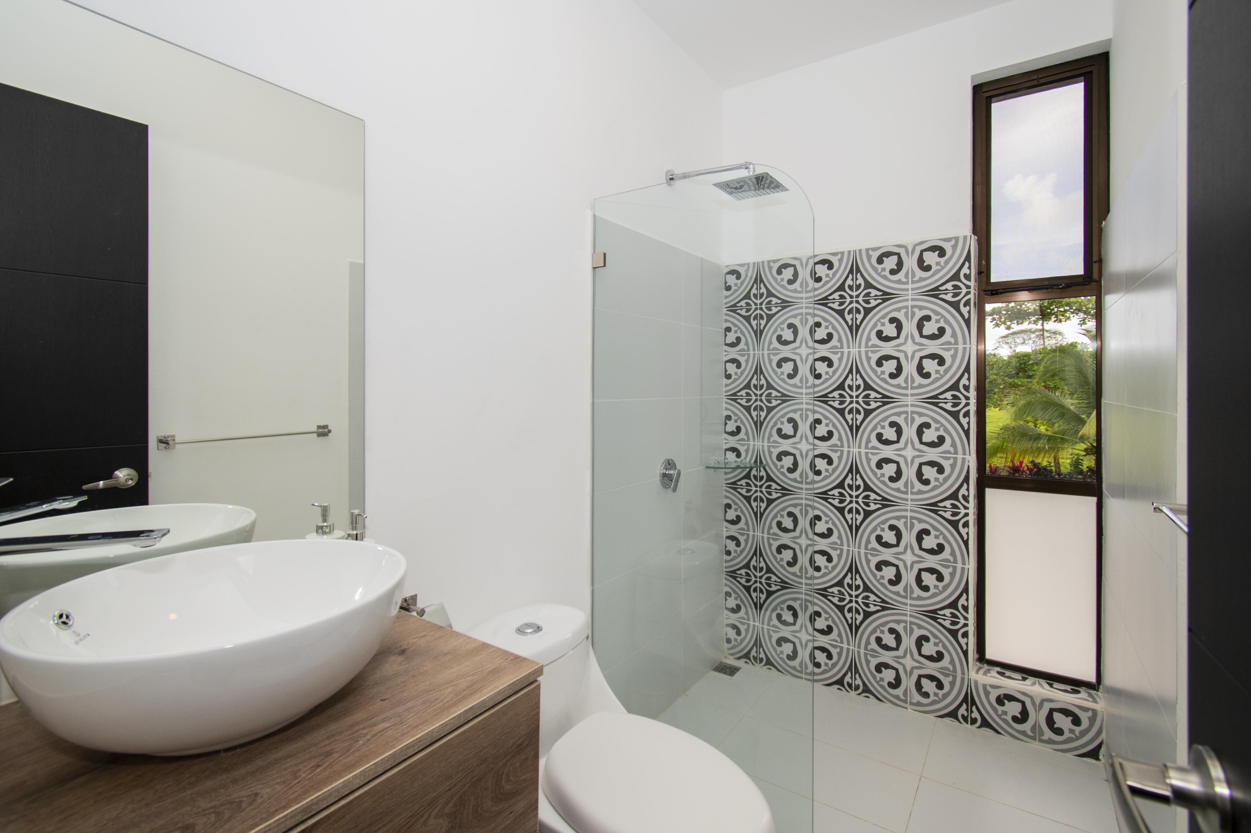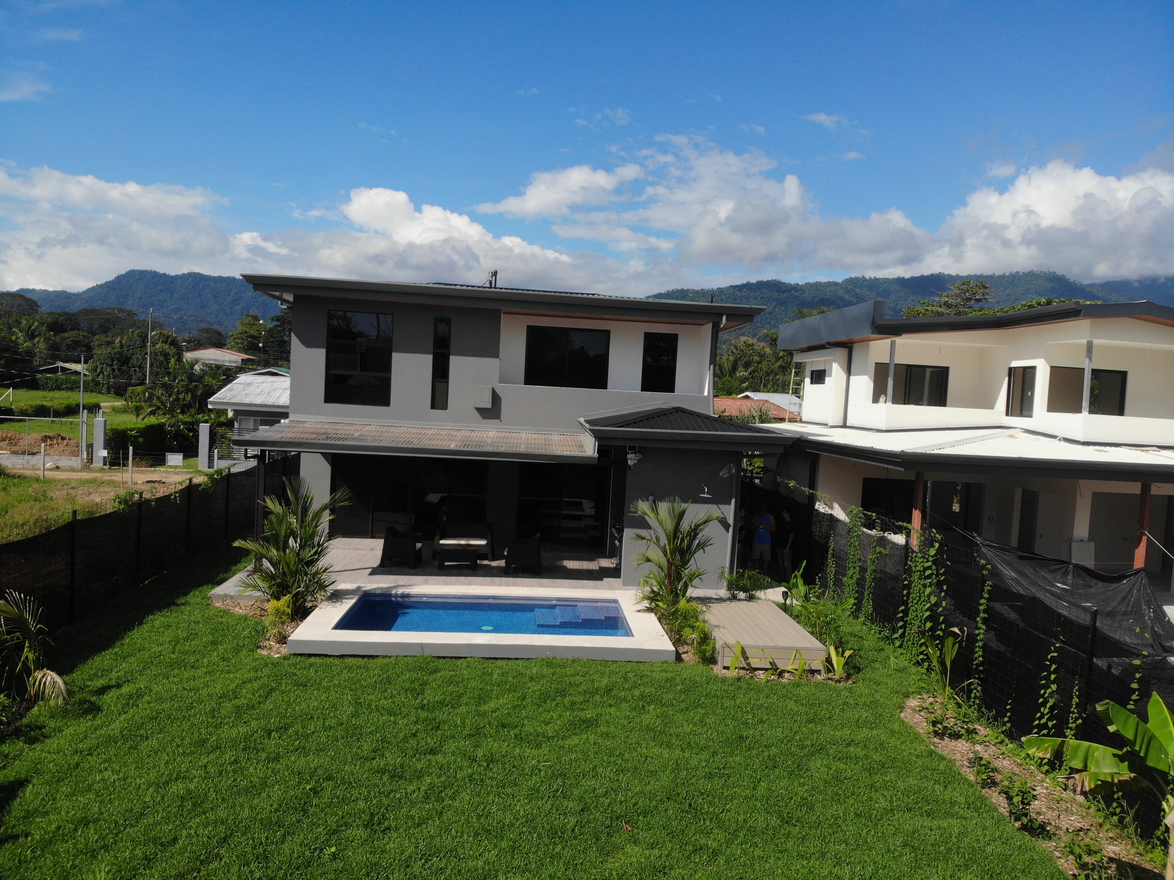 This brand new modern style 3 bedroom home was just built and is located in a great community walking distance to the Whales Tale National Marine Park (Parque Nacional Marino Ballena) which has the famous whales tale and is one of the most spectacular beaches in the world. You can also walk to several restaurants and stores near the entrance to the park. The location makes it a great place to live and also a great place for a vacation rental business. The property also backs onto a large green open space that butts directly up to the beach. The scarlet macaws are seen flying around daily!!!