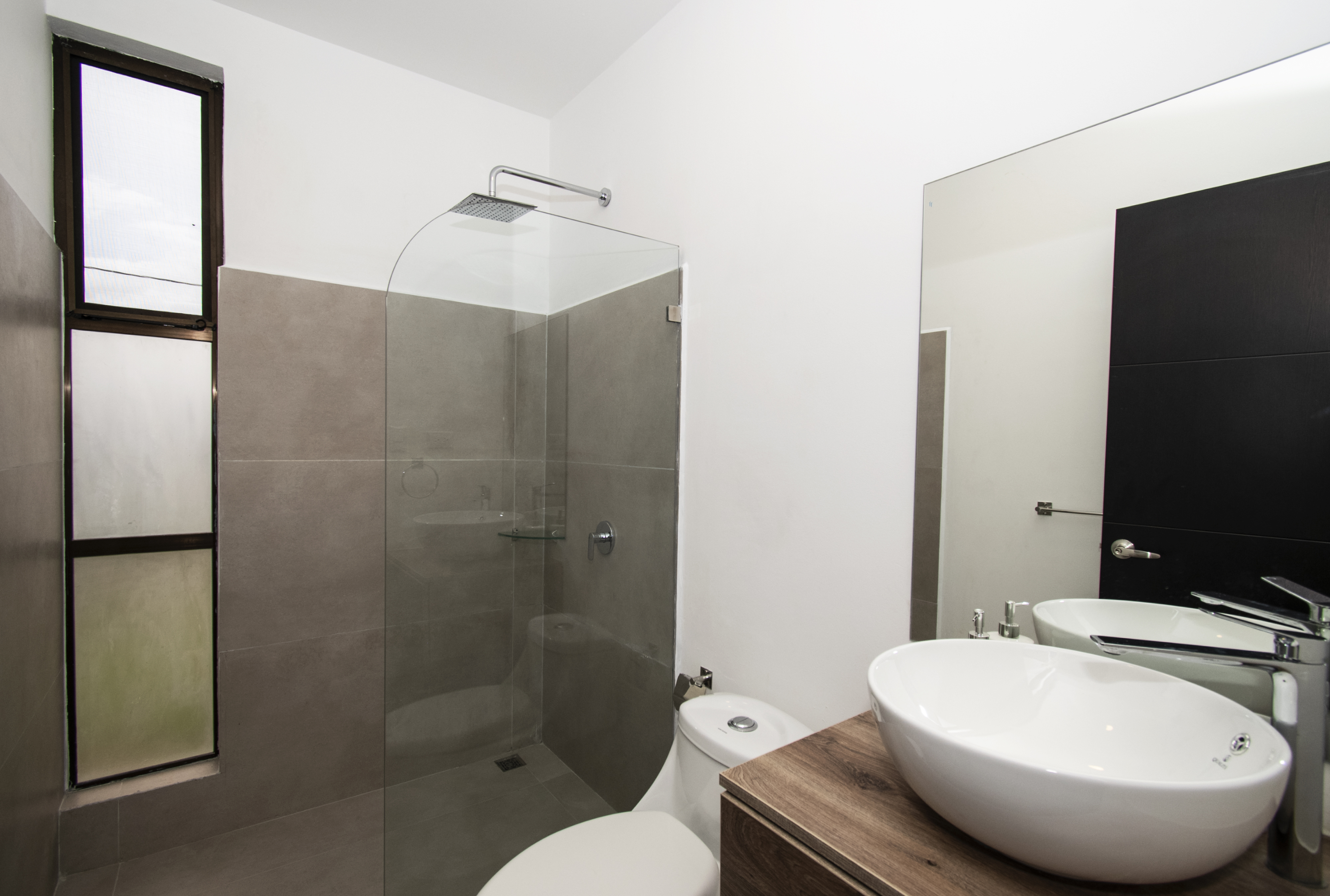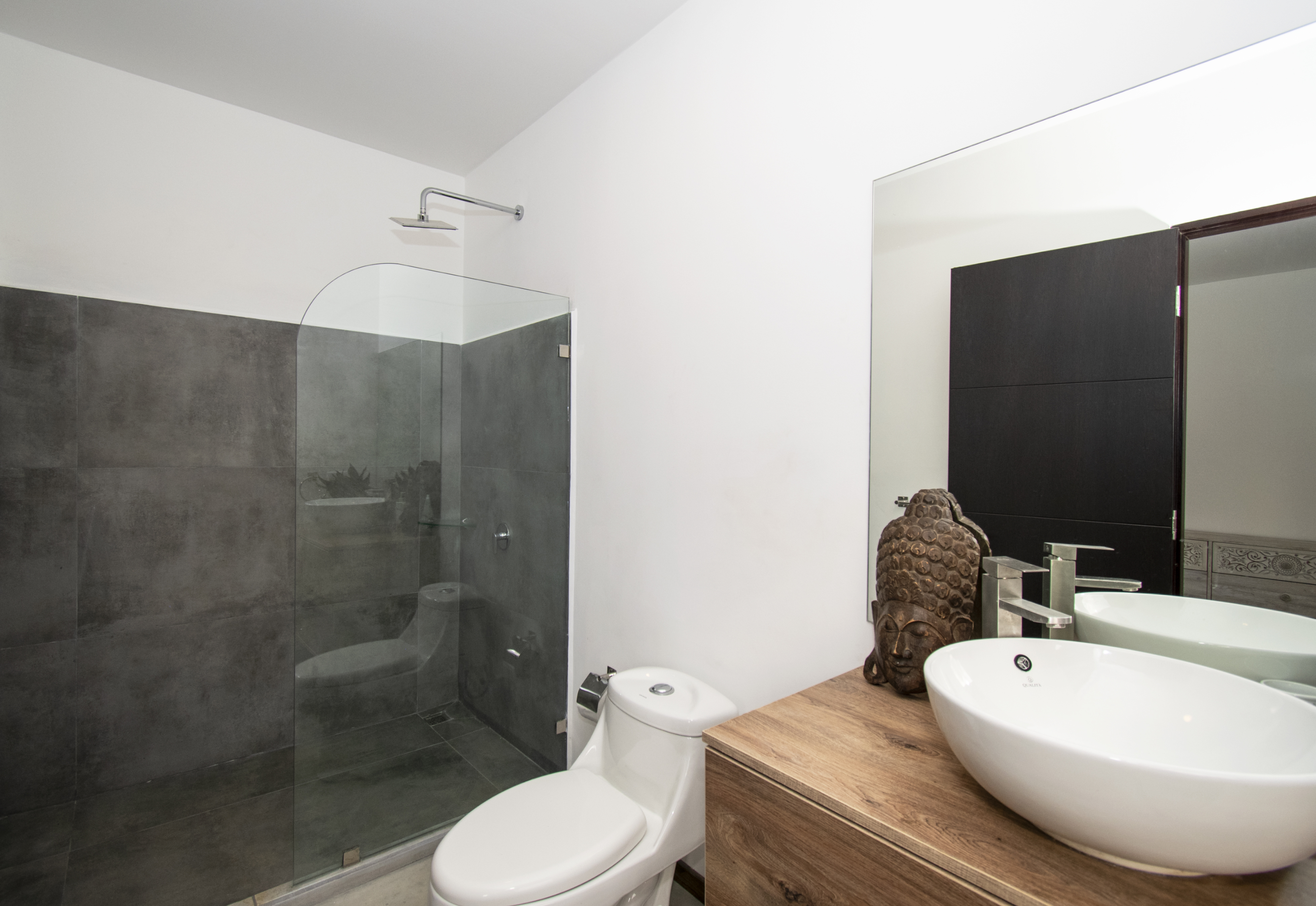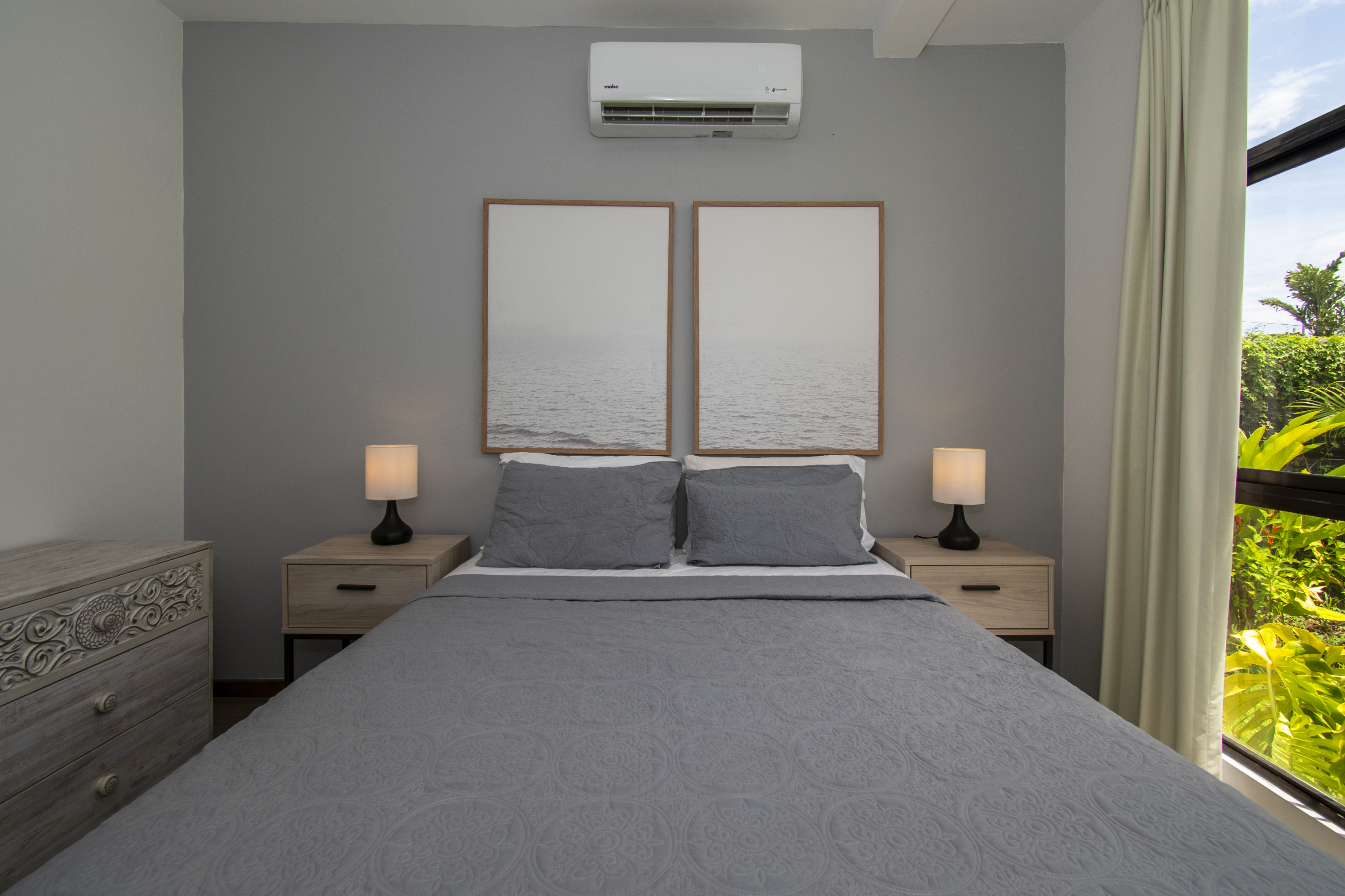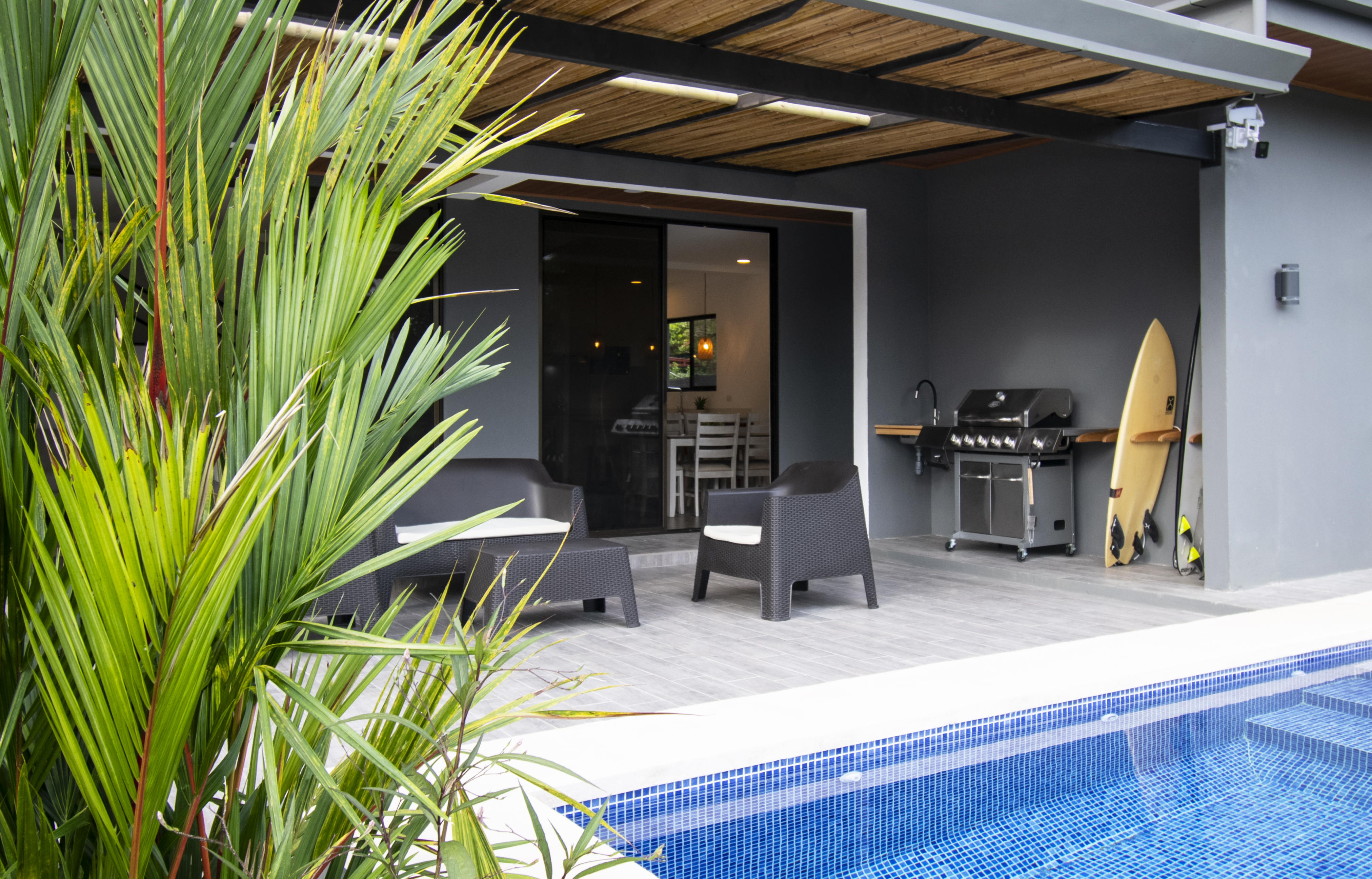It is a 2 storey modern home. On the first floor there is a guest bedroom and full bathroom, the living rooms, dining room, and kitchen, plus a large covered deck with BBQ area which flows out towards the pool. Laundry is off of the deck. Upstairs there is another guest room with full bathroom plus the master bedroom with ensuite bathroom and a balcony looking down on the pool and out over the green space towards the ocean.