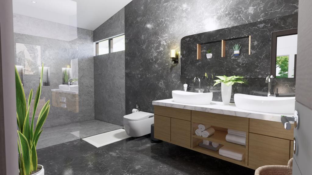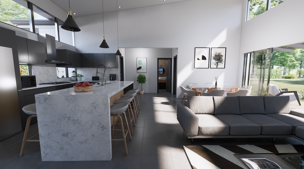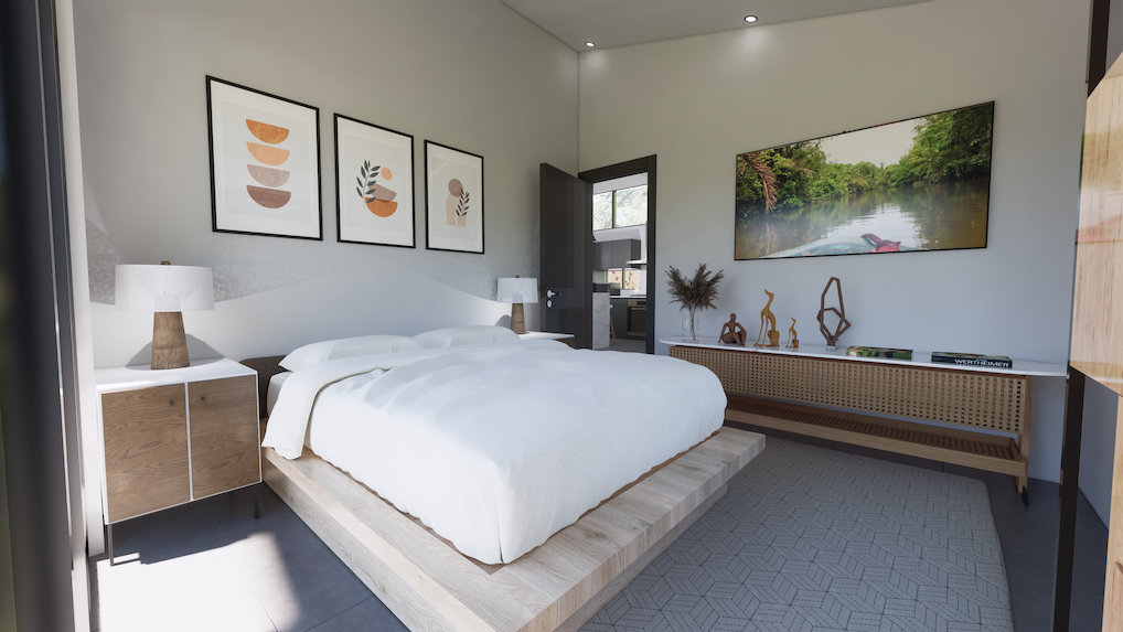 Two guest bedrooms with double beds, night tables and closets. On the other side of the house is the large master bedroom with a king size bed, 2 bedside tables and a very spacious ensuite bathroom, quartz counter tops, soluble vanity sinks and a custom closet.