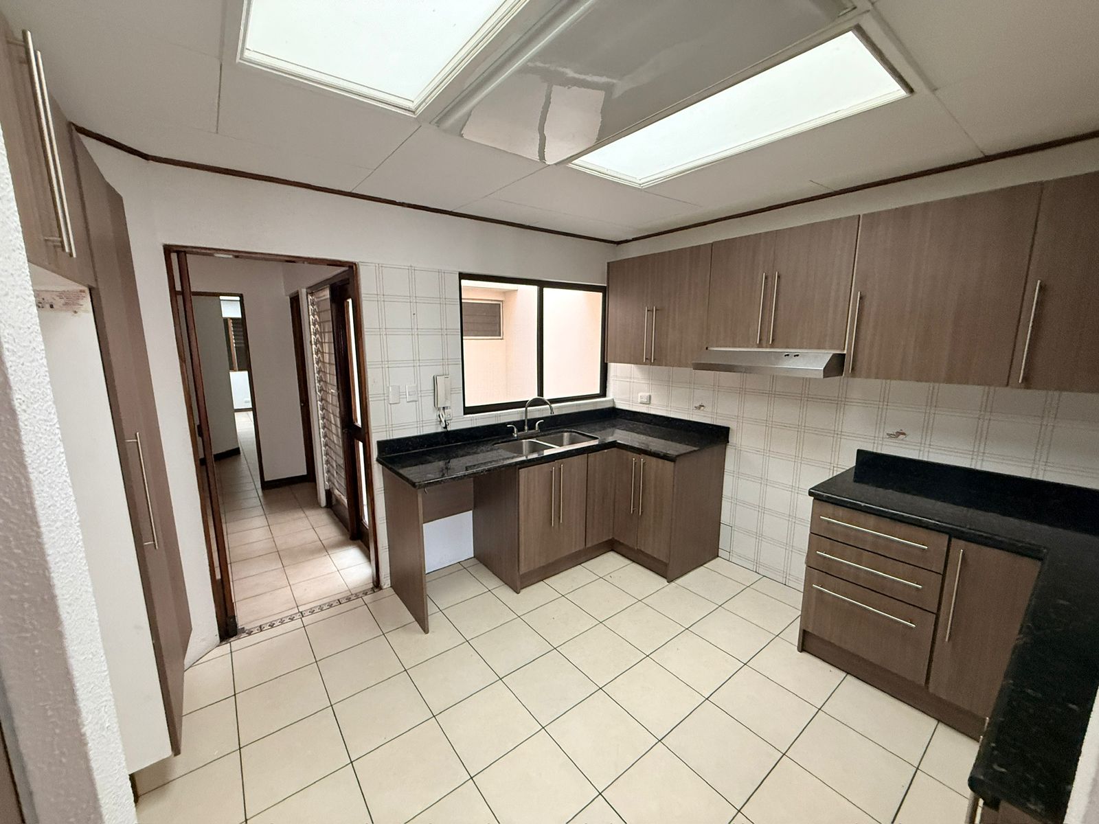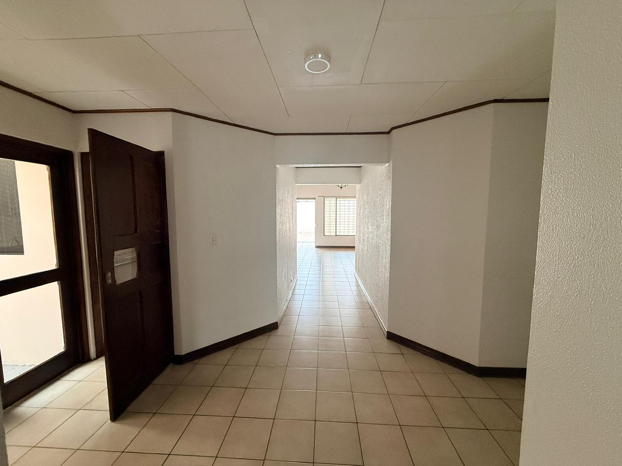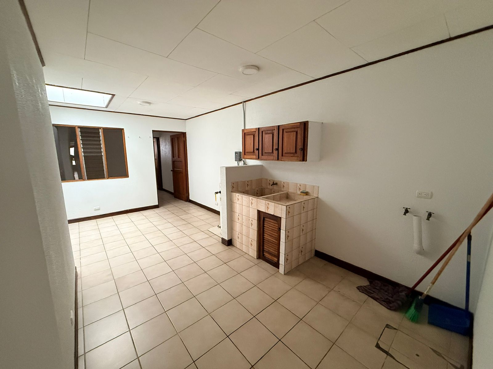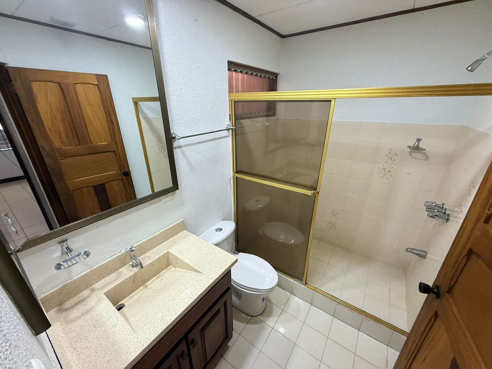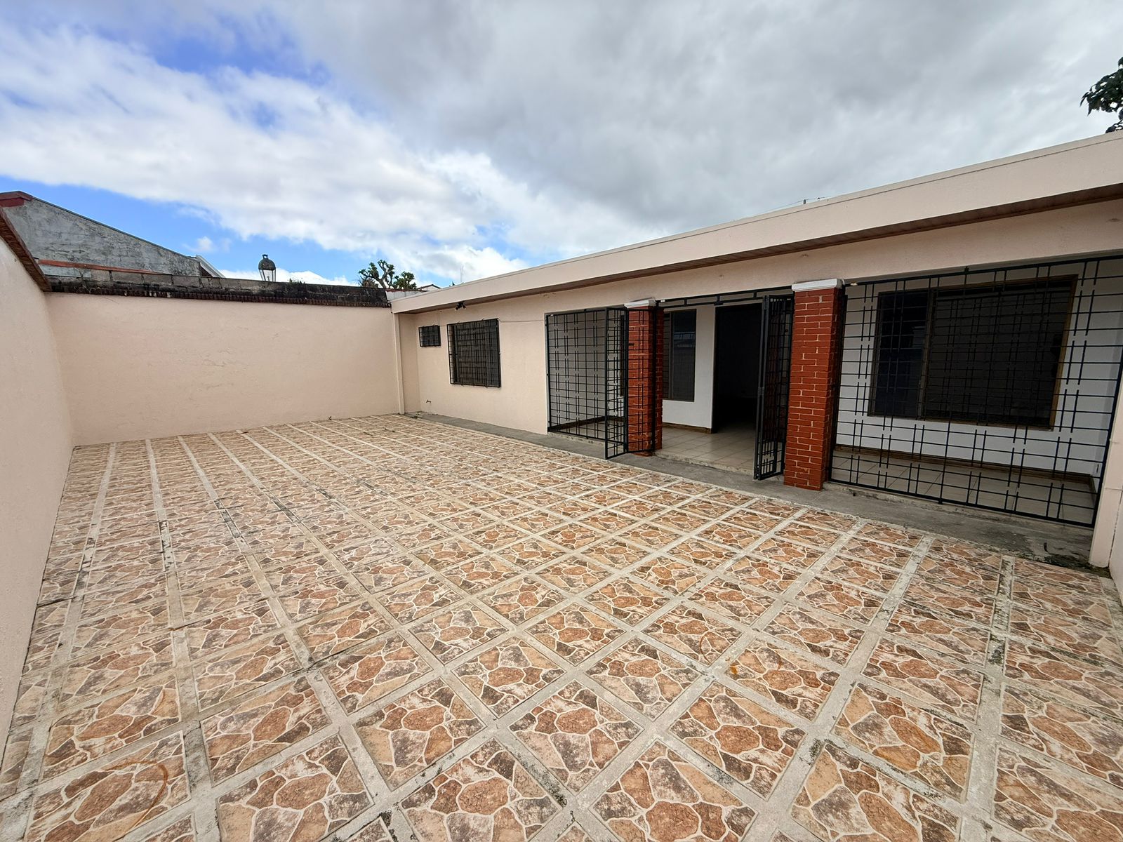 This single-story house is ideal for seniors. It features a spacious garage for two large vehicles, a small front garden, a guest bathroom, a very spacious living and dining room, two large secondary bedrooms that share a bathroom, a very spacious master bedroom with a walk-in closet and a full bathroom with a bathtub, a remodeled kitchen with granite countertops, a spacious patio perfect for pets, and a laundry room with a maid's quarters and bathroom.