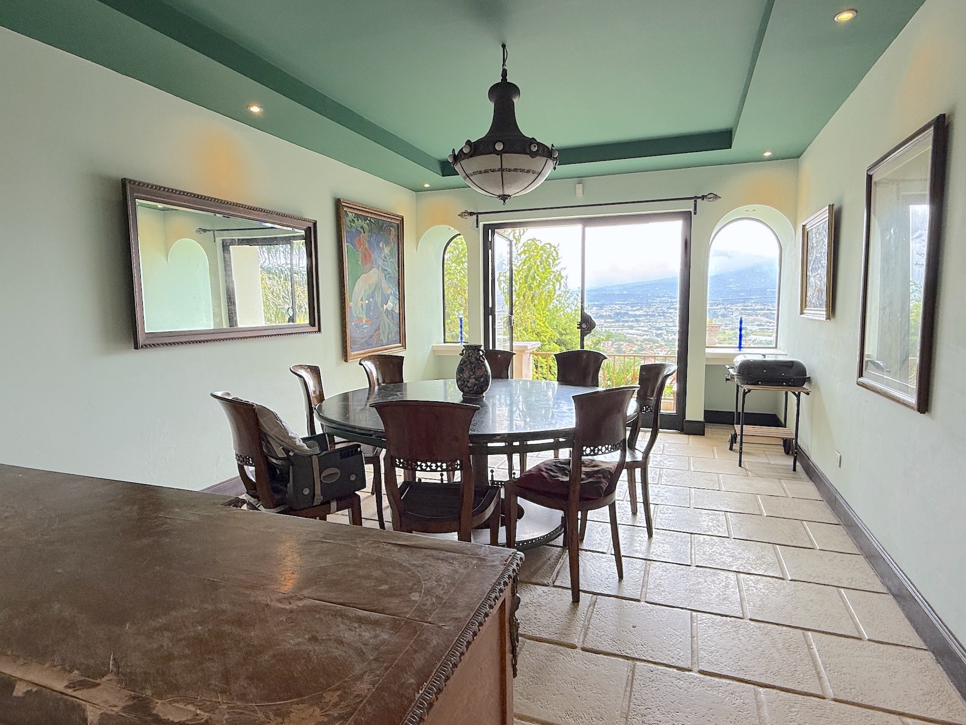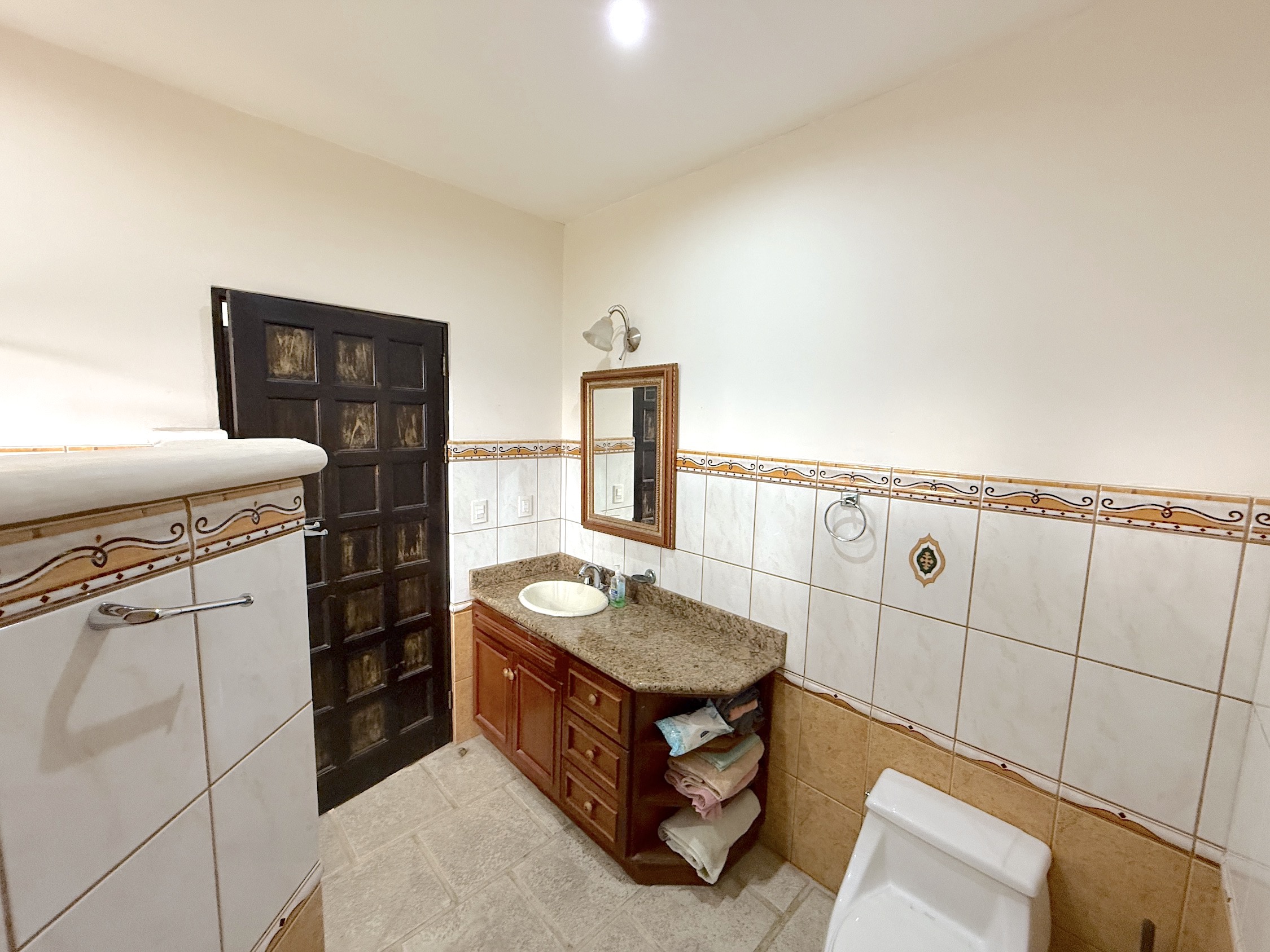 With arched windows, handcrafted woodwork, and vaulted ceilings, the home’s architecture blends Mediterranean flair with Costa Rican comfort. The main living room boasts expansive views, while the spacious kitchen features granite countertops and custom cabinetry.