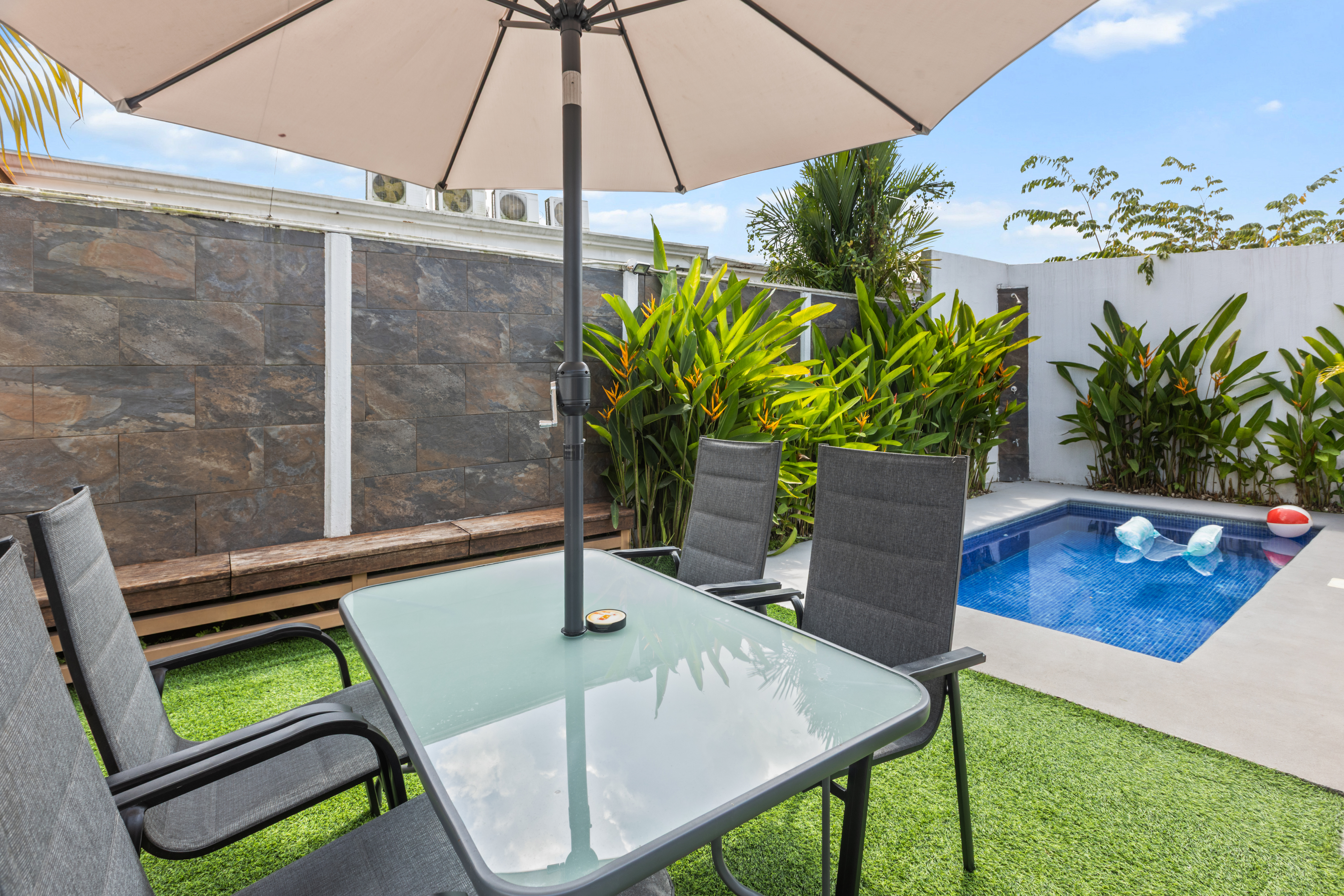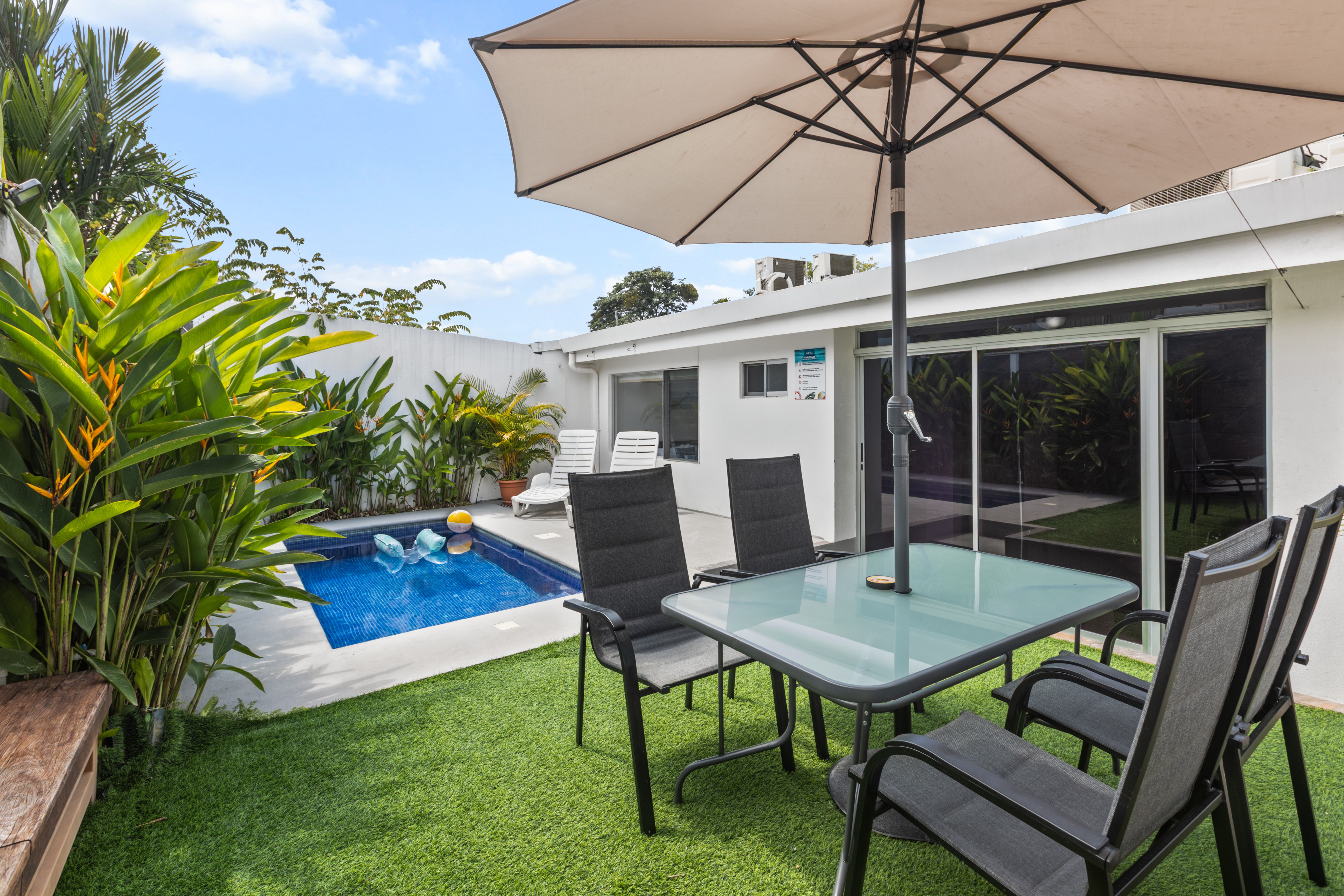 El patio es el corazón de esta casa: limpio, moderno y perfecto para relajarse.