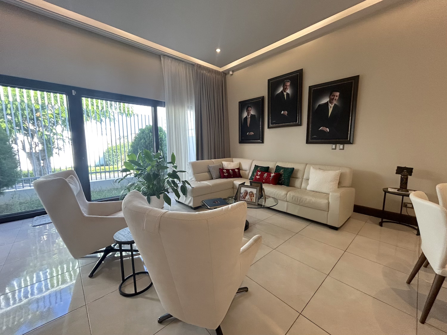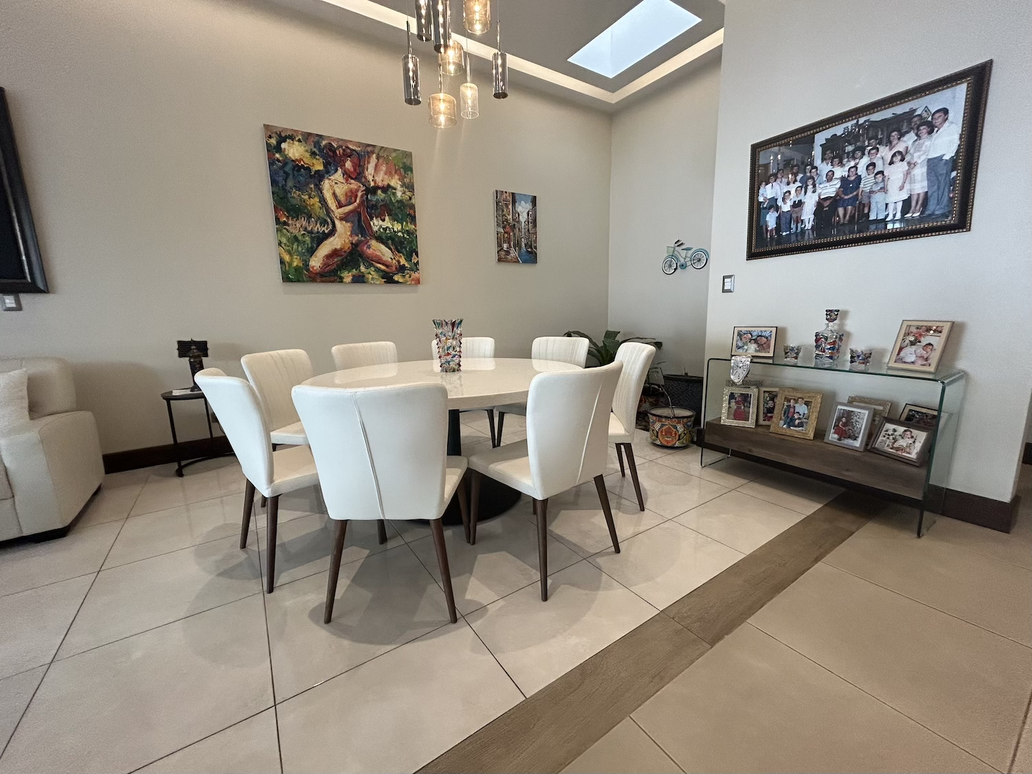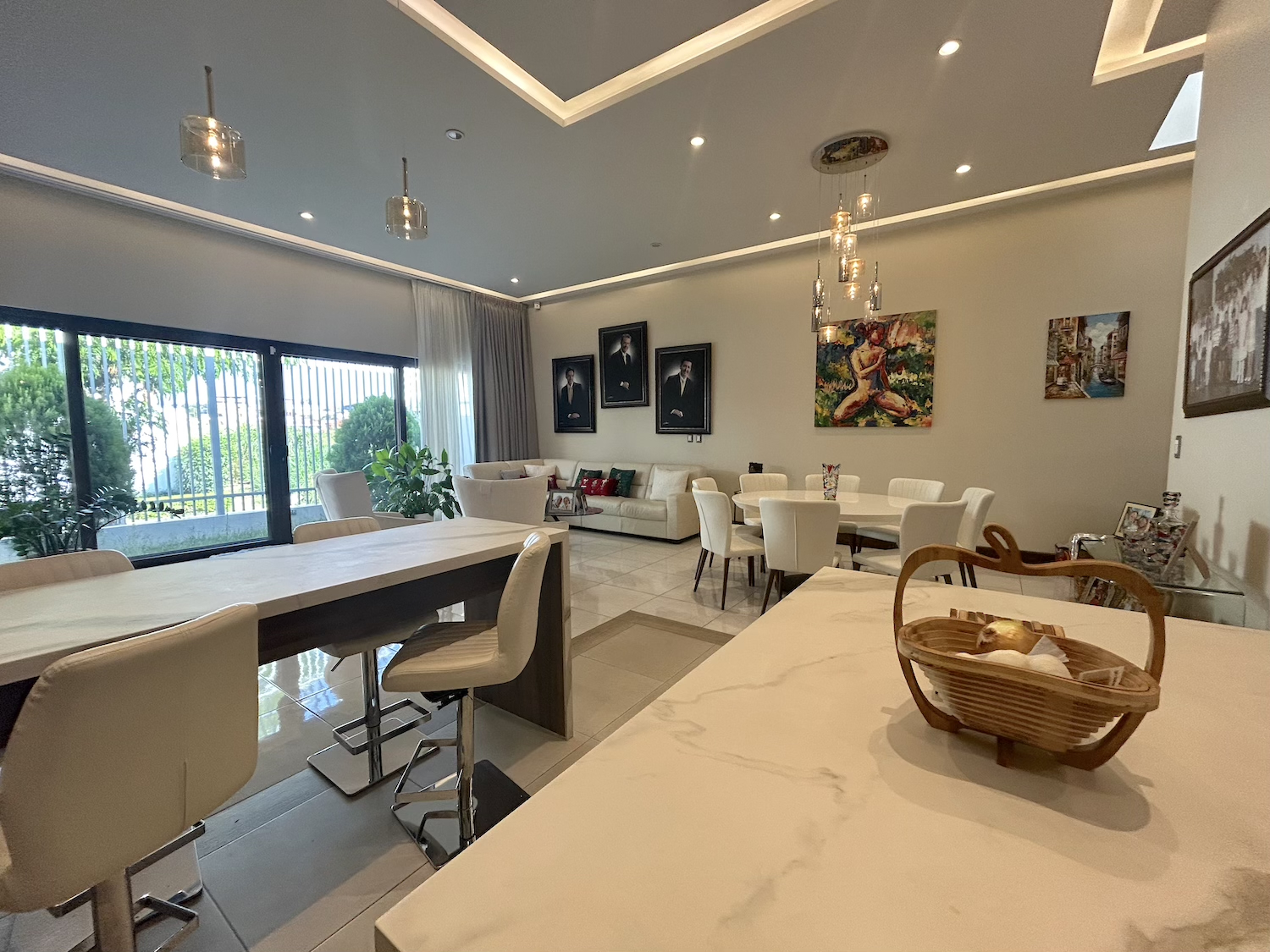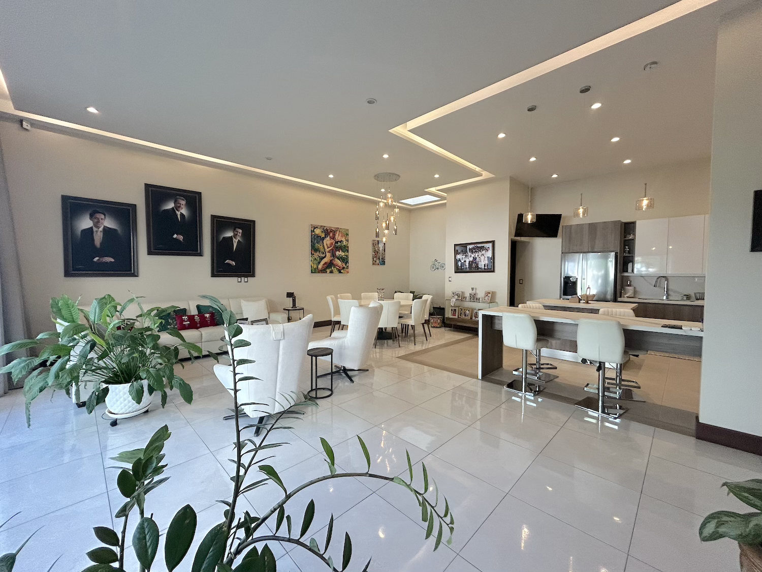 The property features a two-car garage and a spacious open-concept social area with high ceilings and contemporary lighting, creating a bright and comfortable atmosphere. The living room, dining area, and kitchen are seamlessly integrated; the kitchen is equipped with modern cabinetry and quartz countertops, ideal for those who appreciate both functionality and modern design.