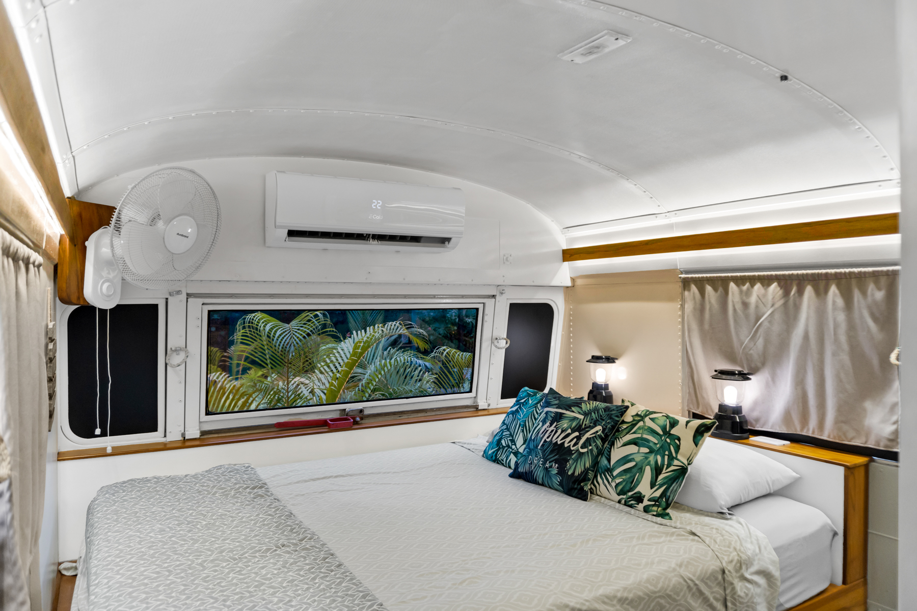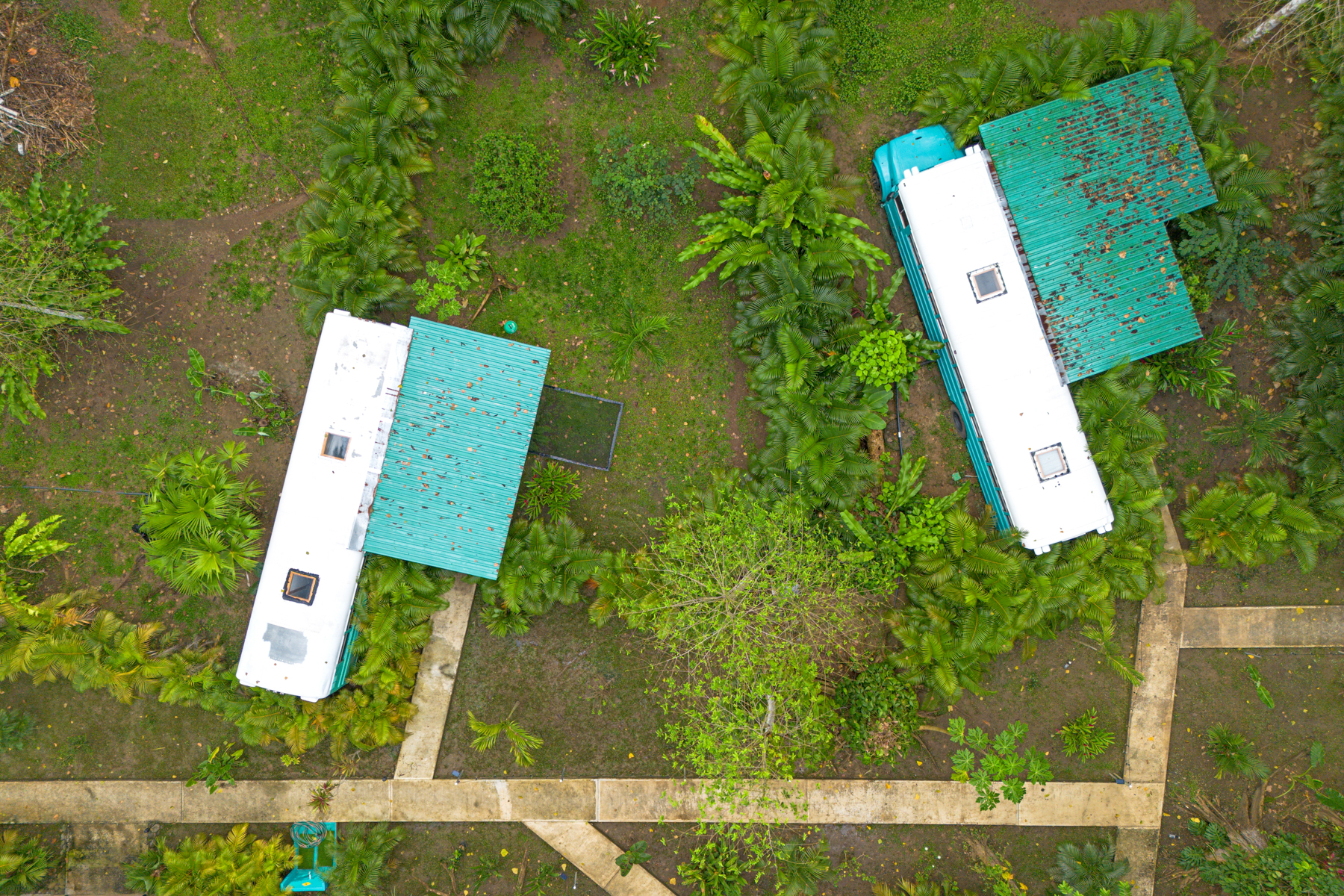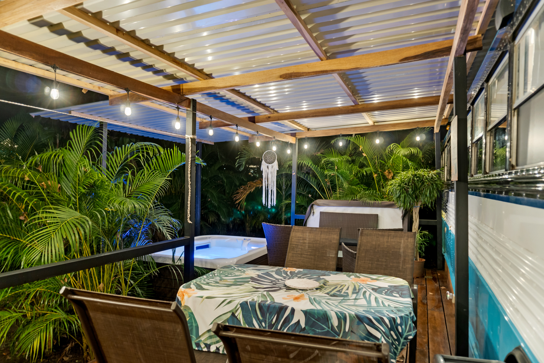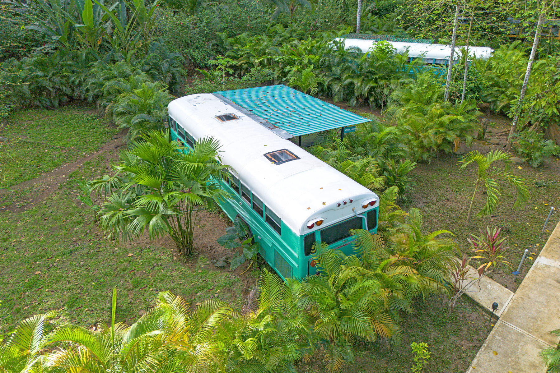 Four creatively transformed buses provide singular and cozy accommodations. Each unit encompasses a bedroom, private bath, complete kitchen, and personal outdoor terrace, creating an ideal setting for guests to savor the tropical ambiance with their morning brew.