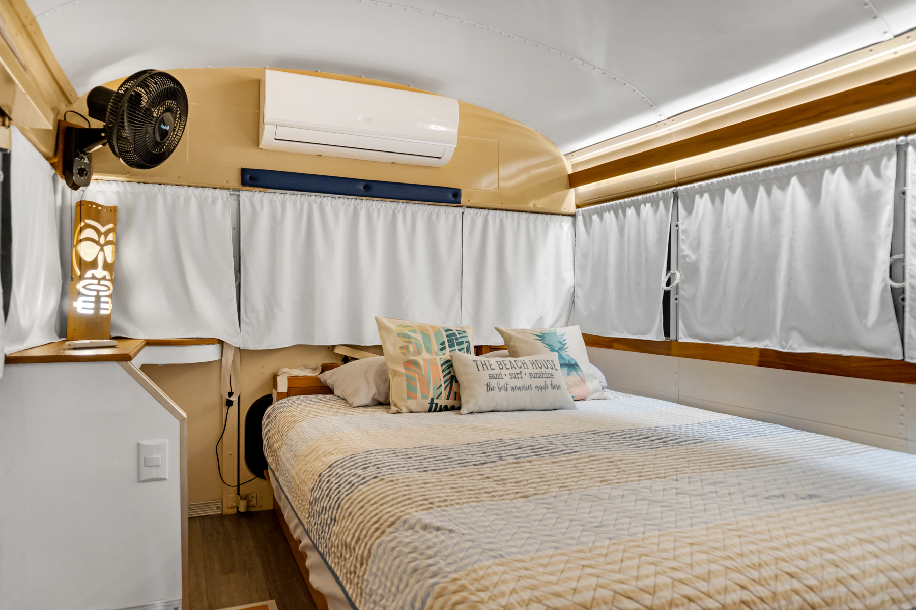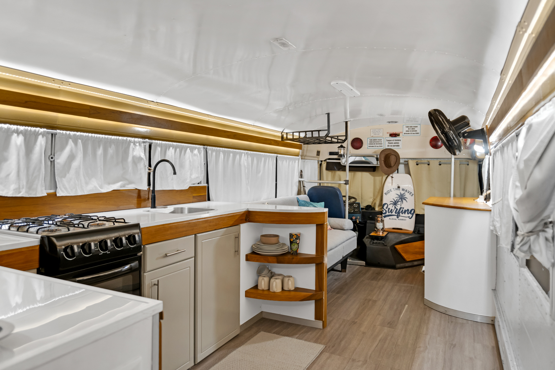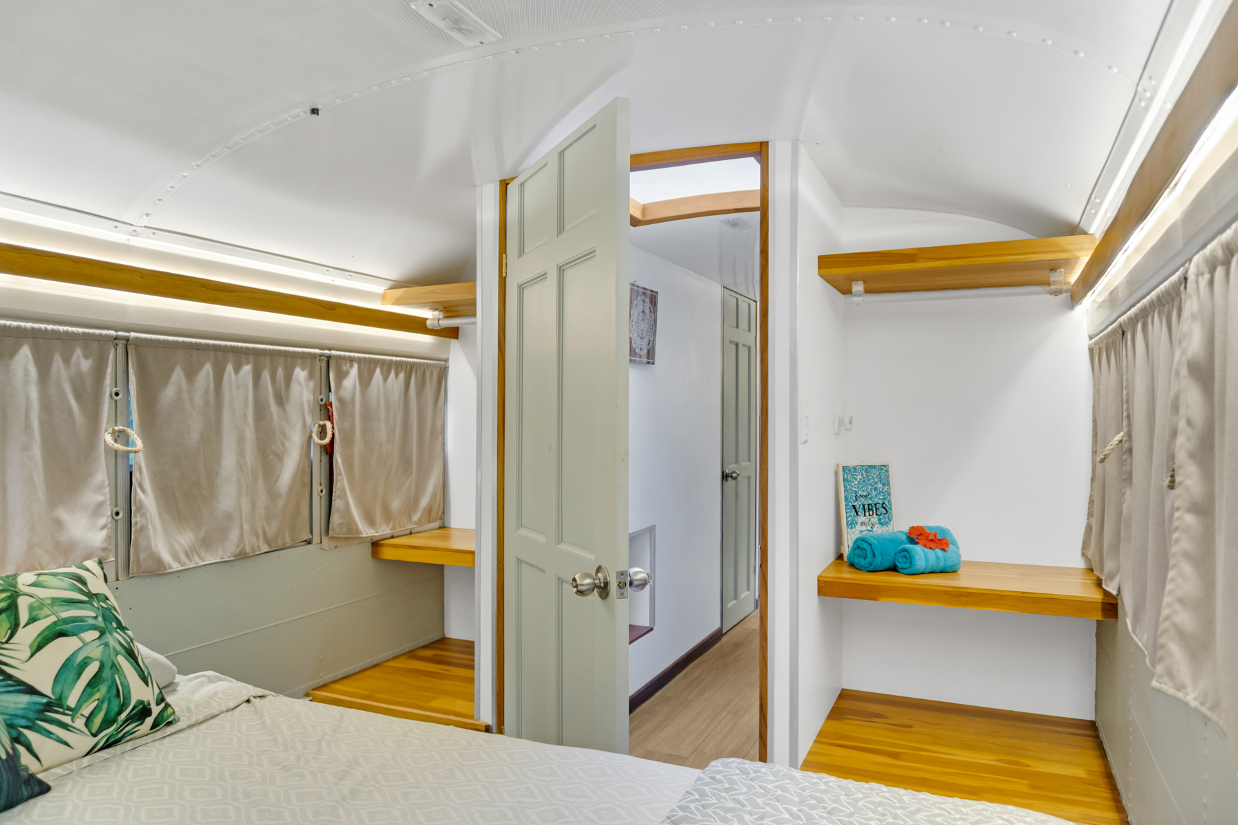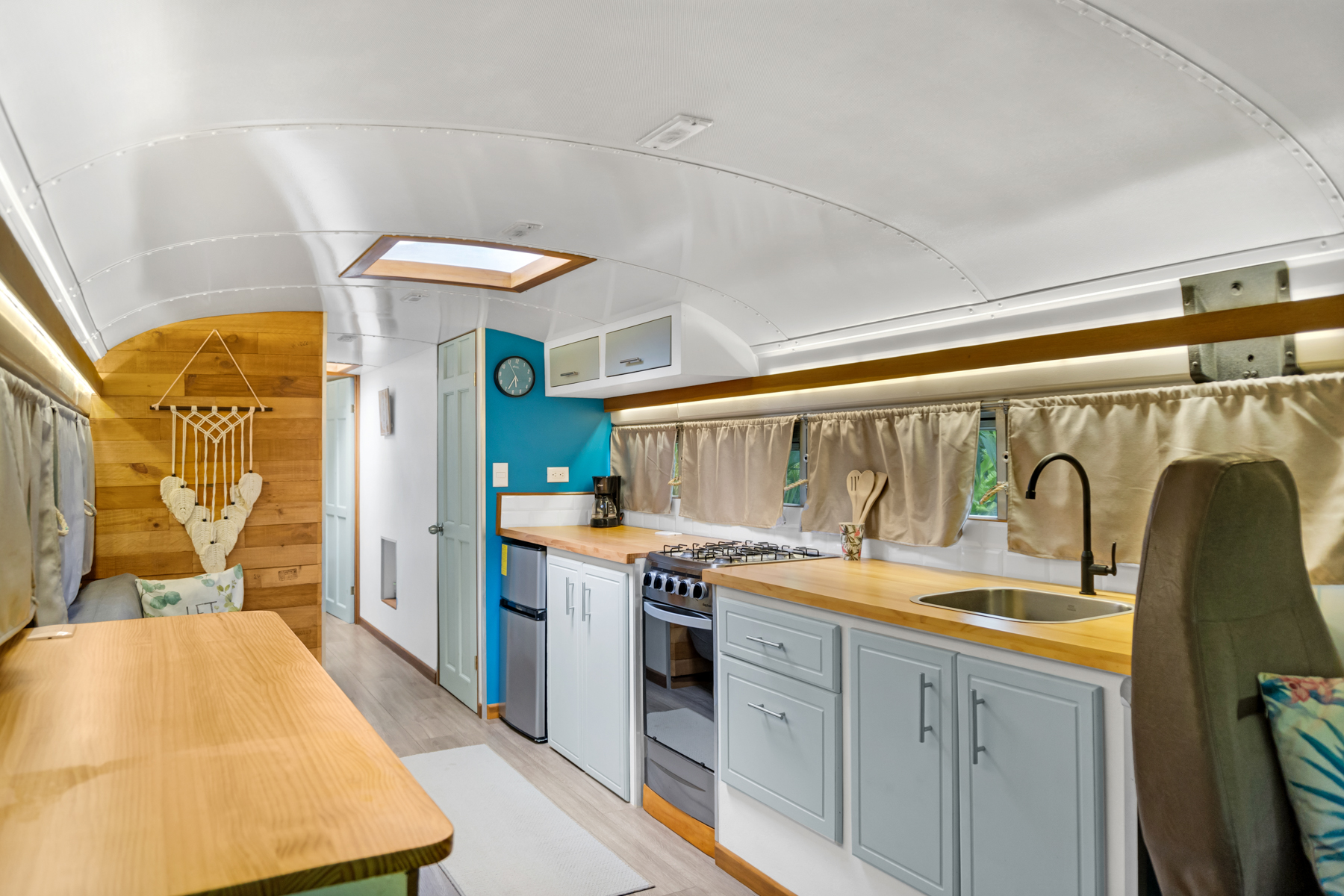 Four creatively transformed buses provide singular and cozy accommodations. Each unit encompasses a bedroom, private bath, complete kitchen, and personal outdoor terrace, creating an ideal setting for guests to savor the tropical ambiance with their morning brew.