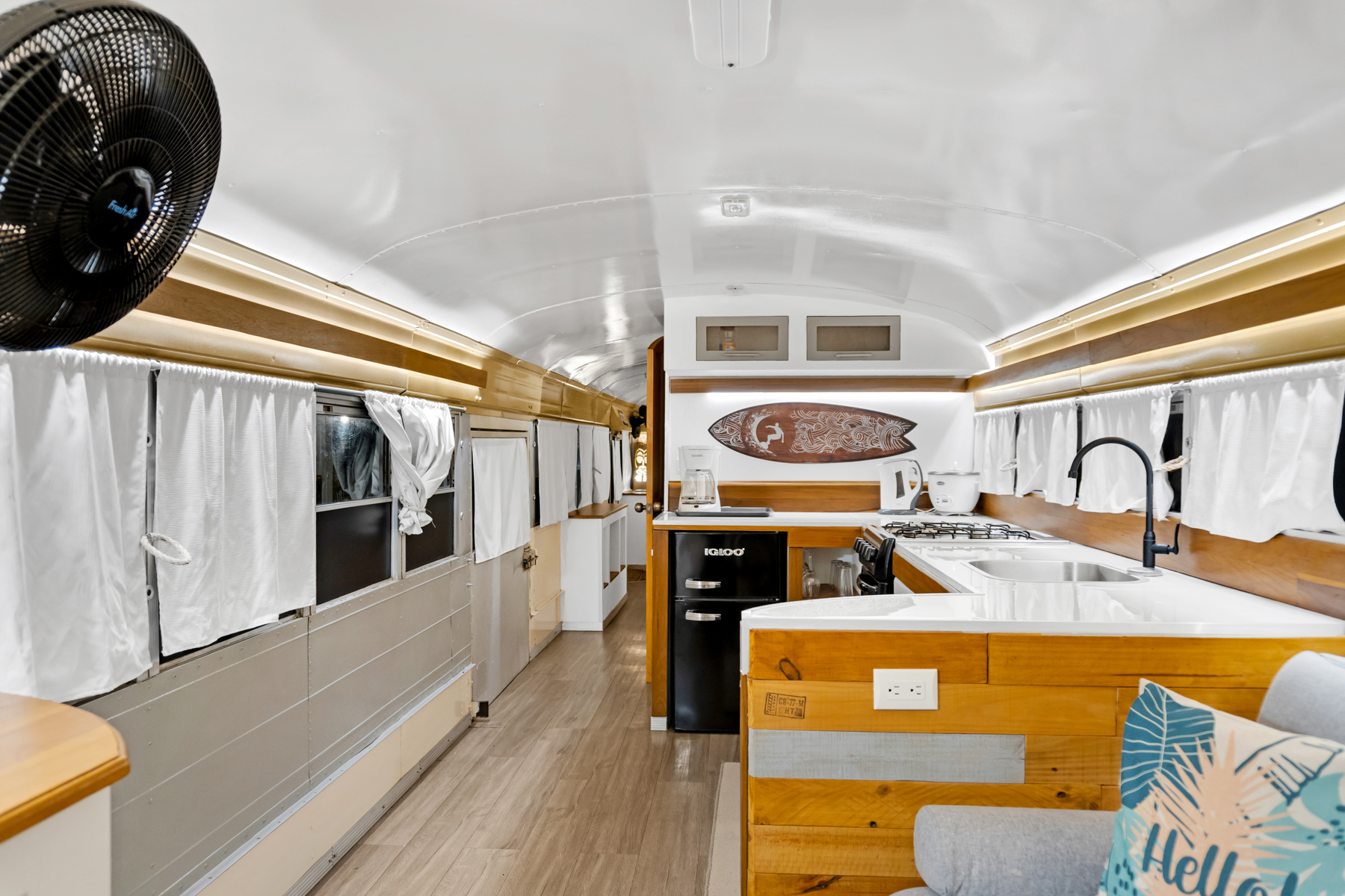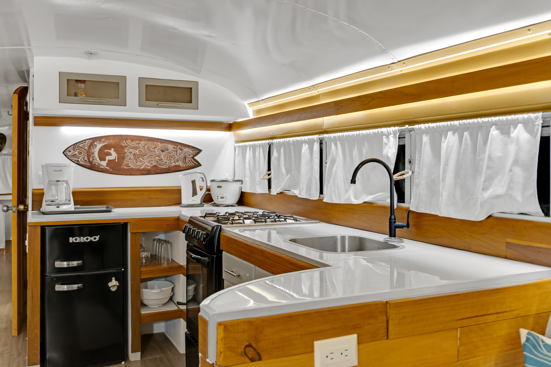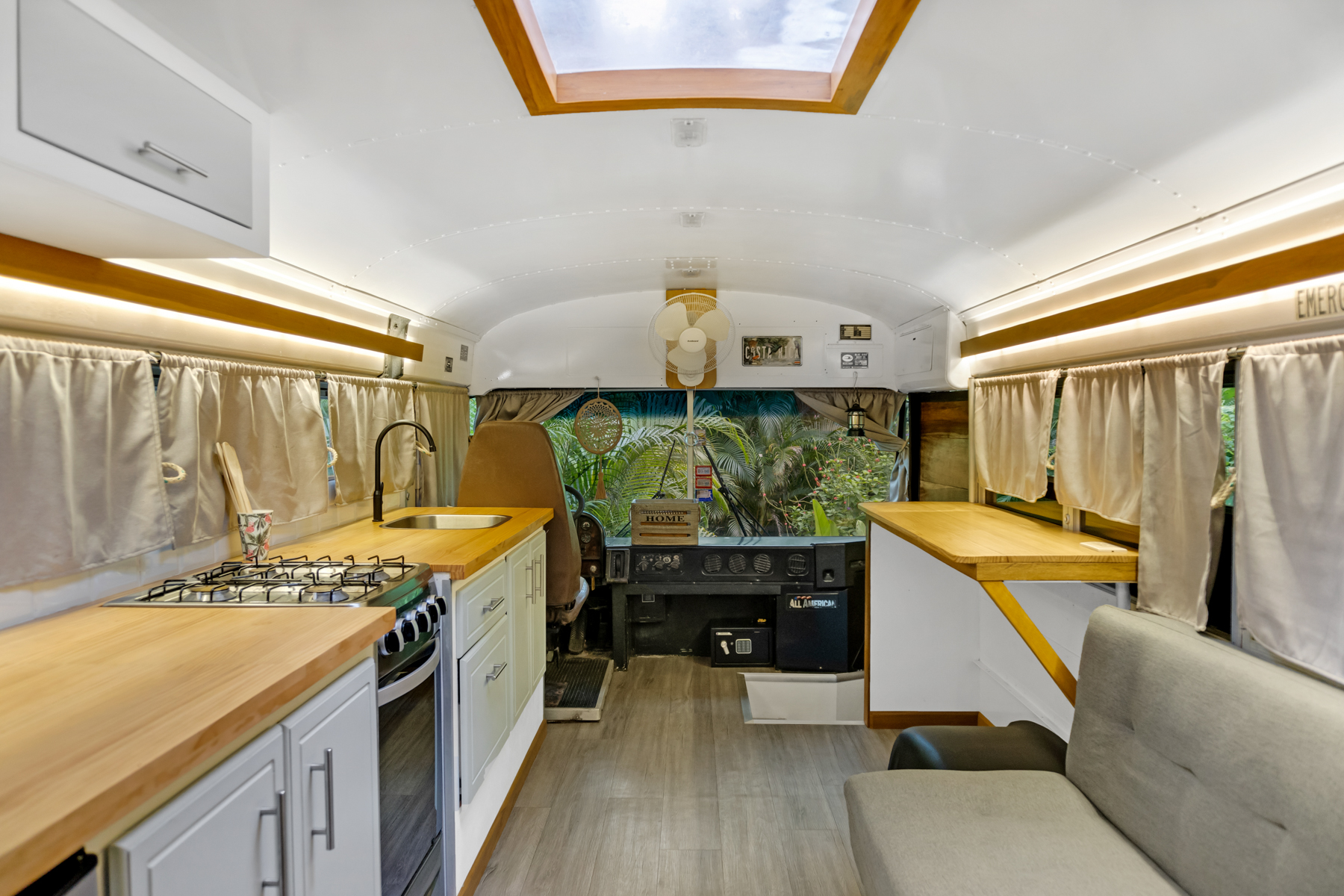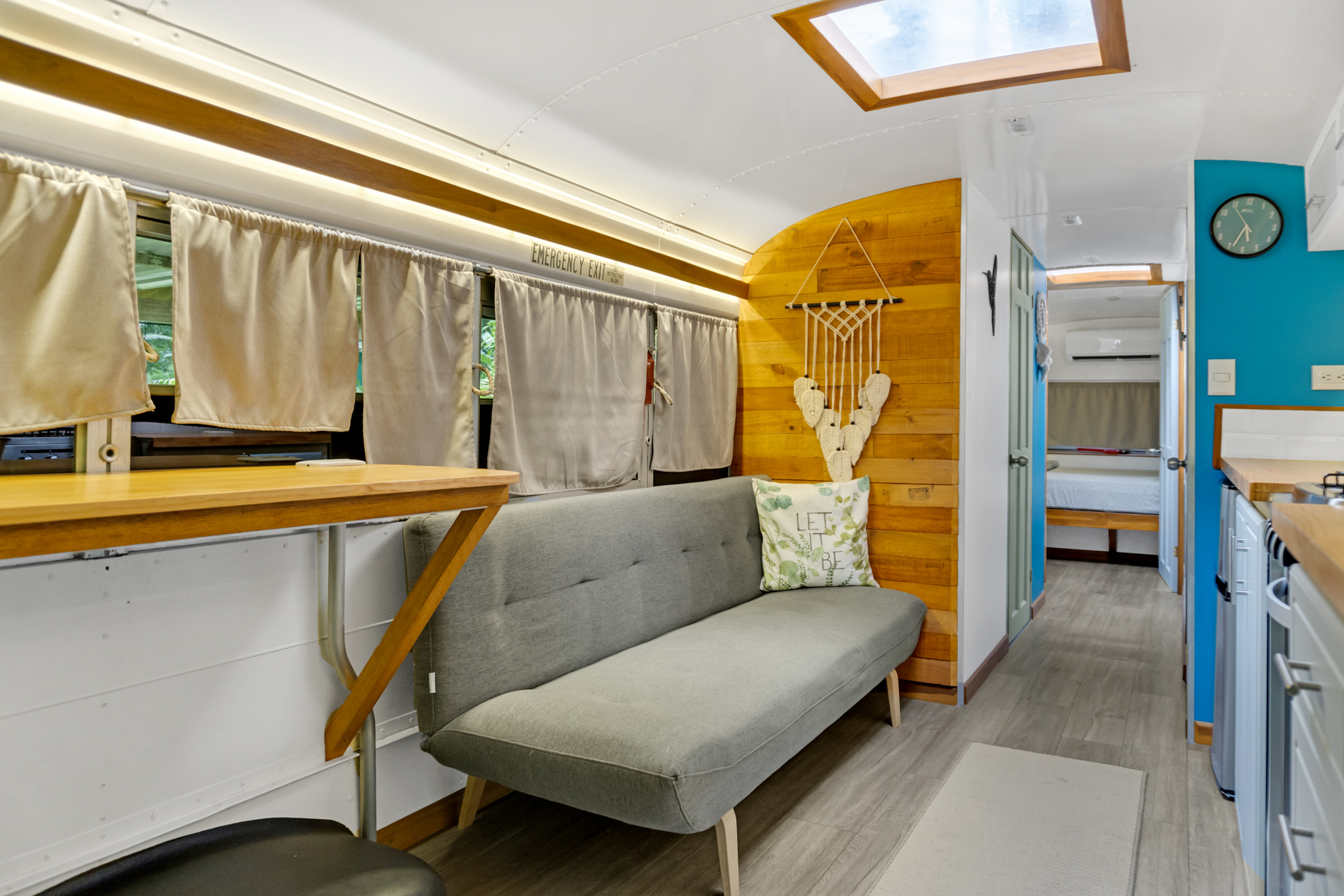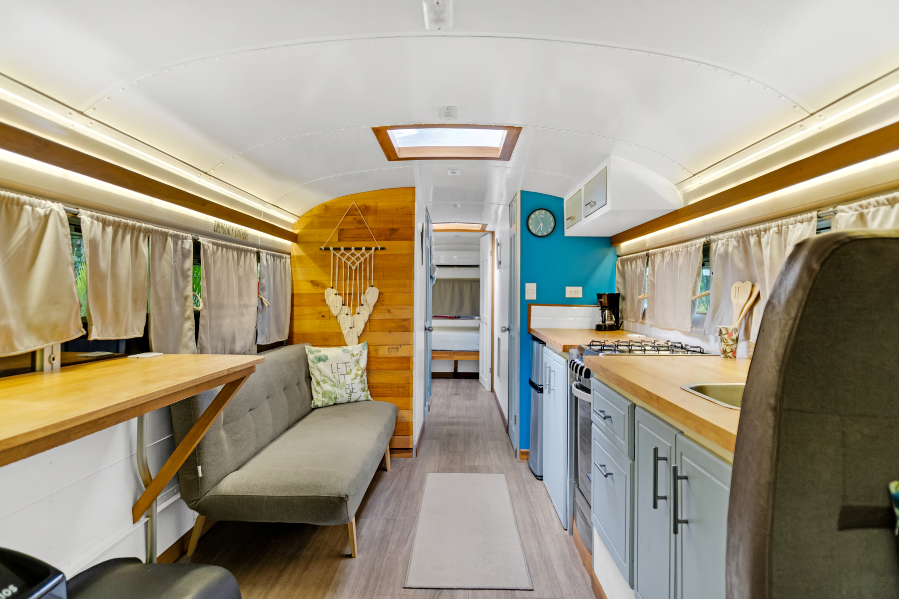 Four creatively transformed buses provide singular and cozy accommodations. Each unit encompasses a bedroom, private bath, complete kitchen, and personal outdoor terrace, creating an ideal setting for guests to savor the tropical ambiance with their morning brew.