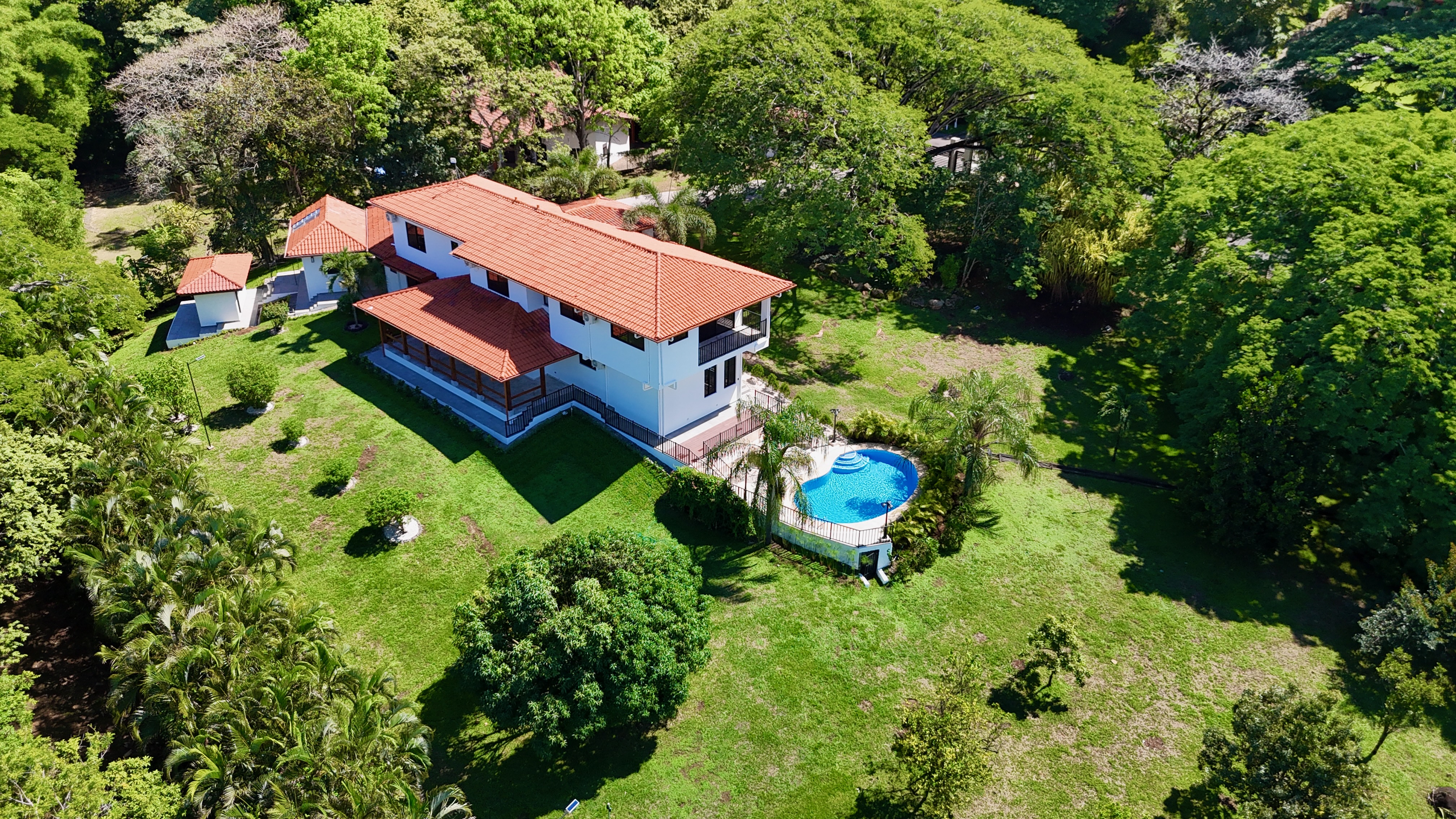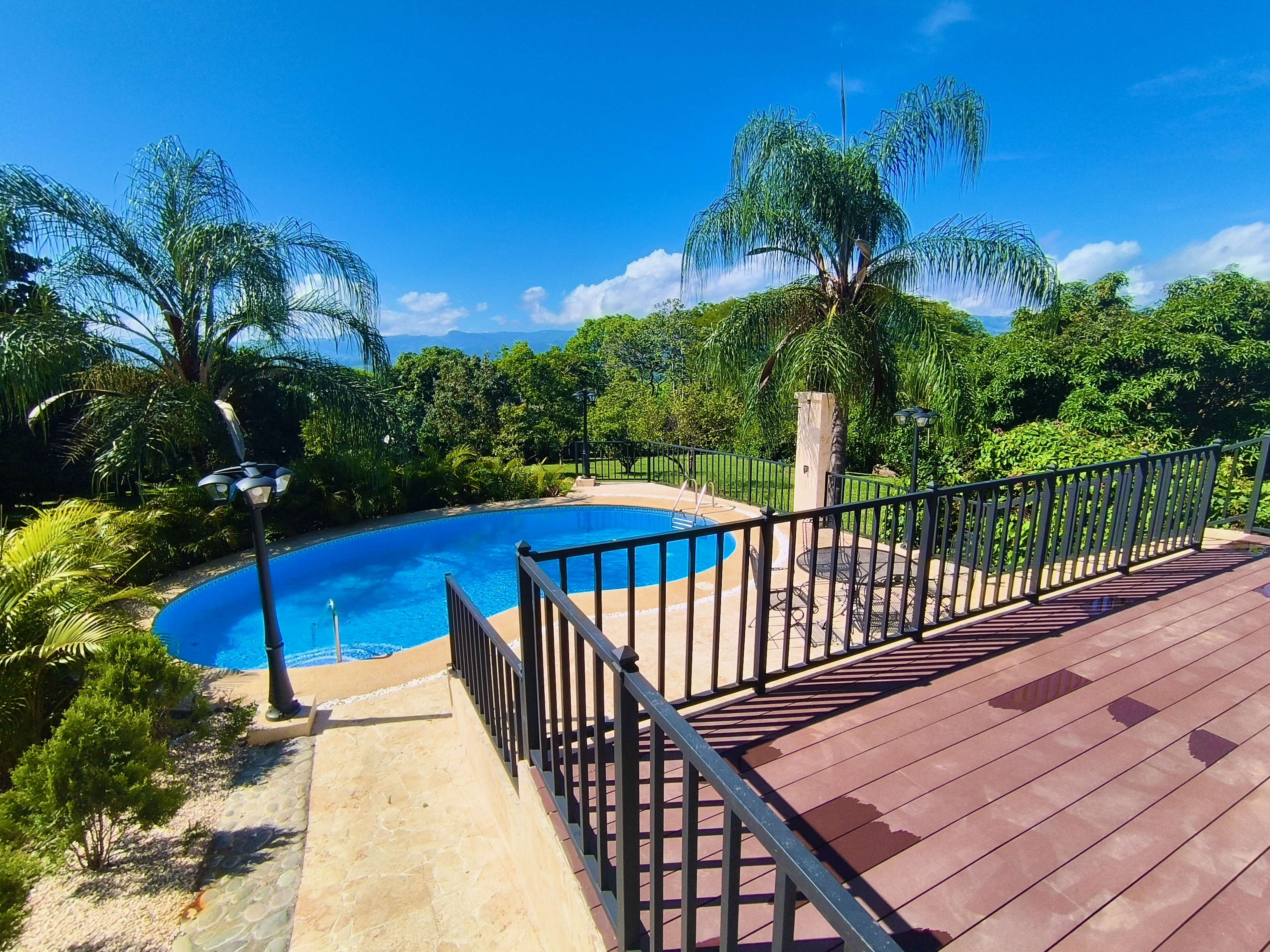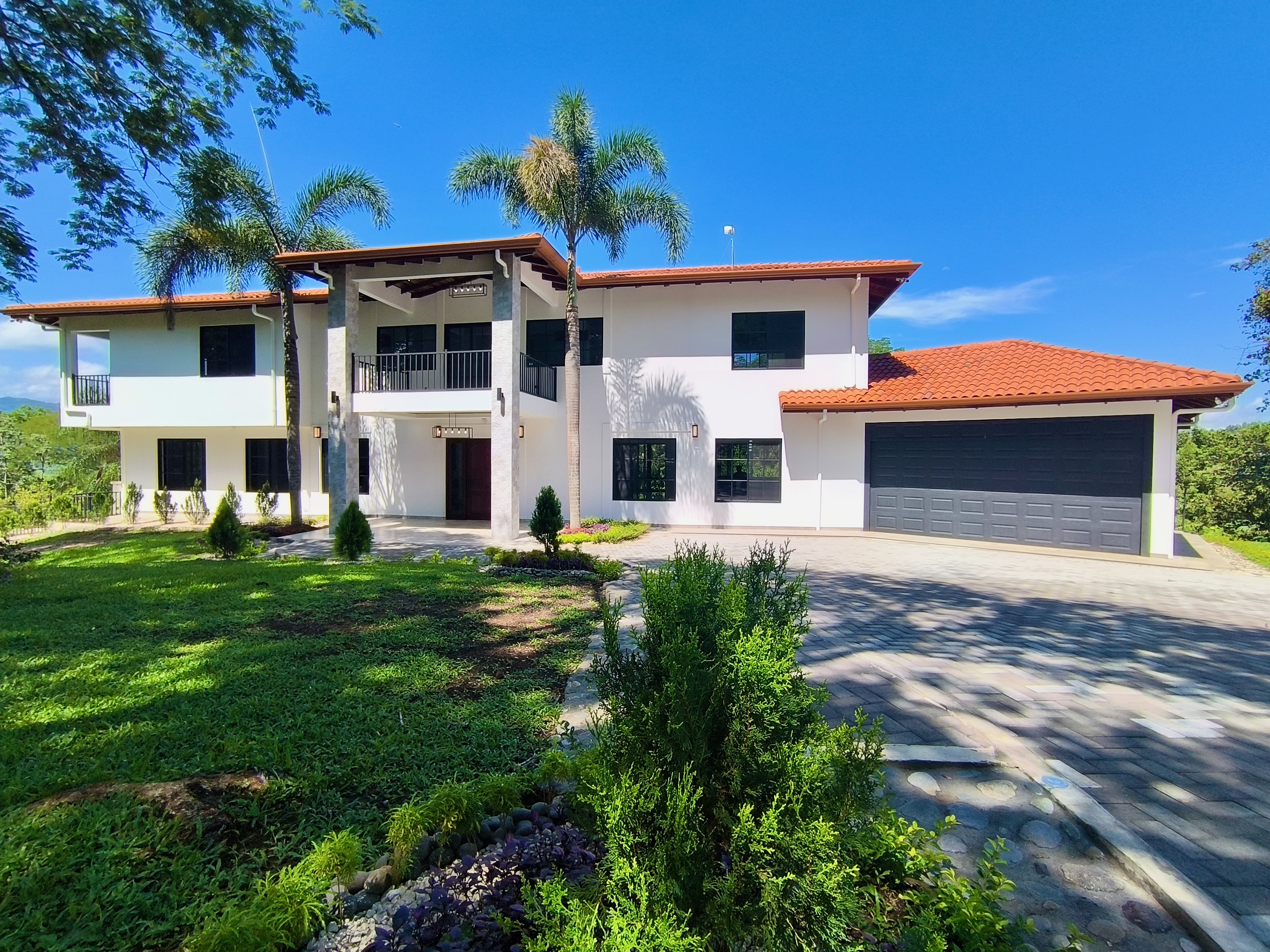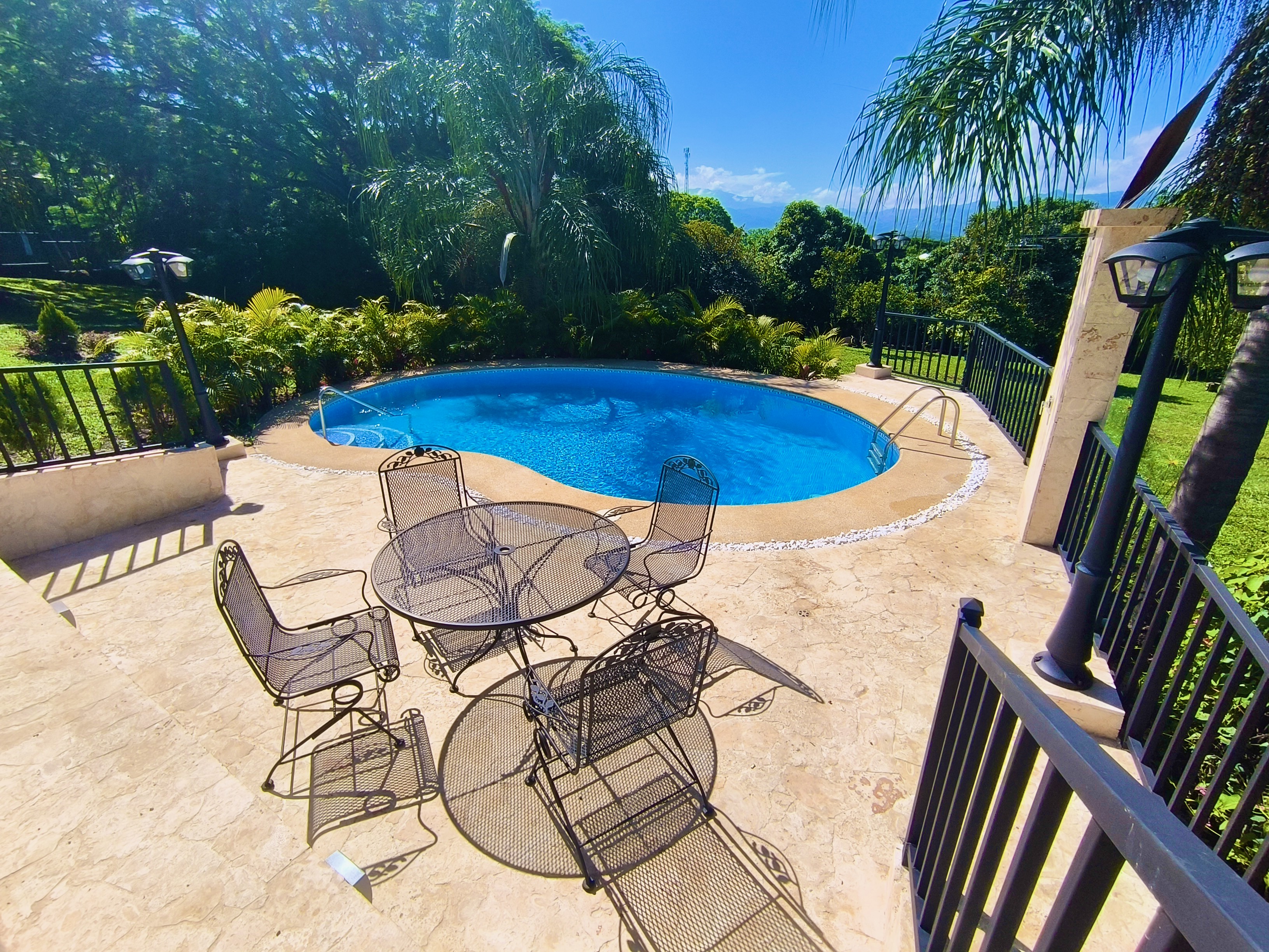 Experience the perfect blend of luxury, comfort, and nature in this impressive two-story home, set on a fully usable 7,000 m² (1.8 acres) lot. Surrounded by beautifully landscaped gardens, fruit trees, and iconic Guanacaste trees, the property offers tranquility while being just 10 minutes from Atenas and 5 minutes from Route 27, with easy access to Central Valley cities, the international airport, and Pacific coast beaches. Built in 2009 and fully renovated in 2025 with premium materials, the main floor features an open-plan living area, gourmet kitchen with pantry, laundry room, two-car garage, and a large bedroom with private en-suite and walk-in closet. Upstairs, three bedrooms each have en-suite bathrooms and walk-in closets with stunning mountain views. Smart home features, 14 security cameras, air conditioning, ceiling fans, and a naturally cool tiled roof enhance comfort. Outdoors, enjoy a Coralina-stone pool, terraces, and a guest/staff quarters.