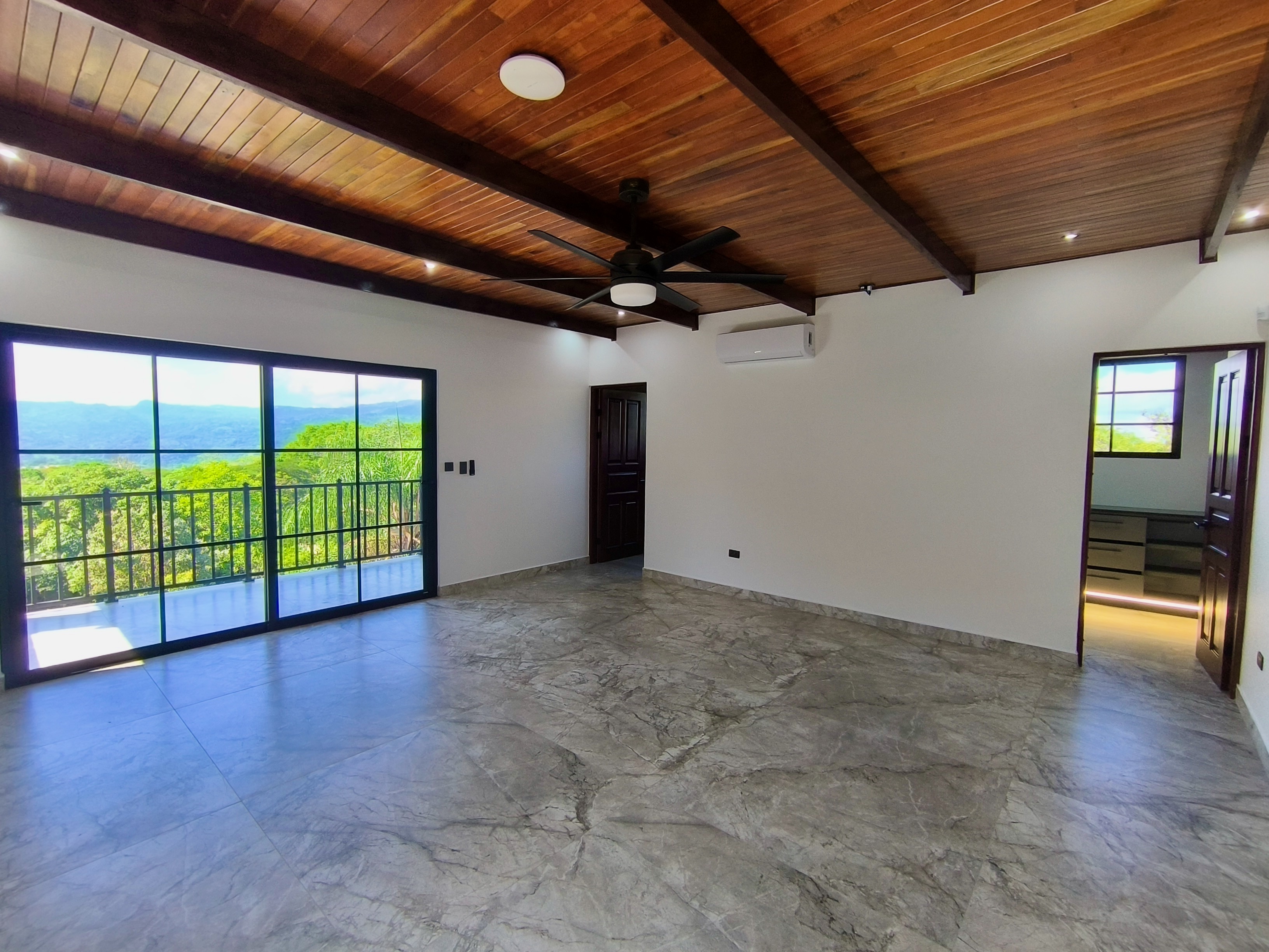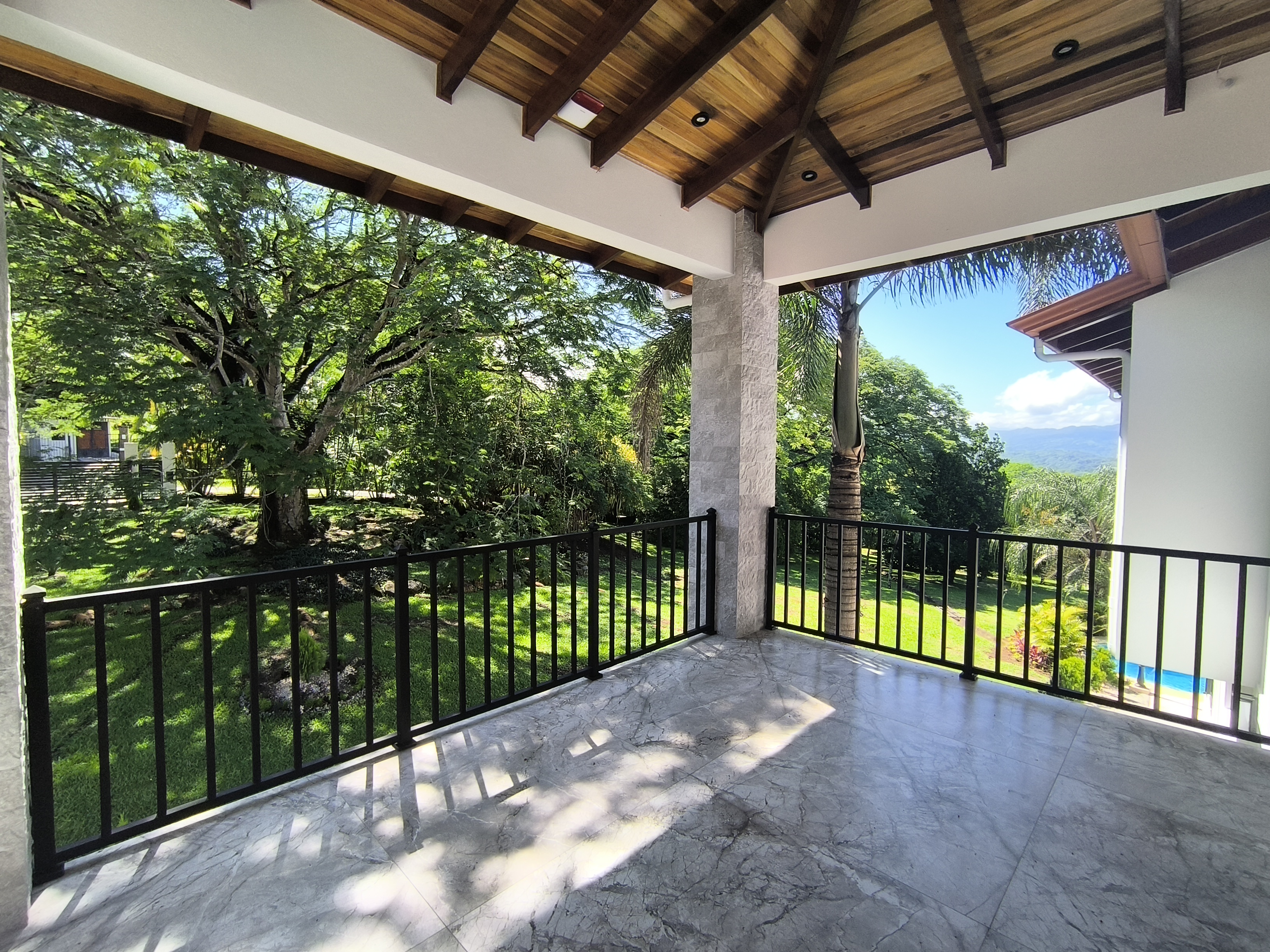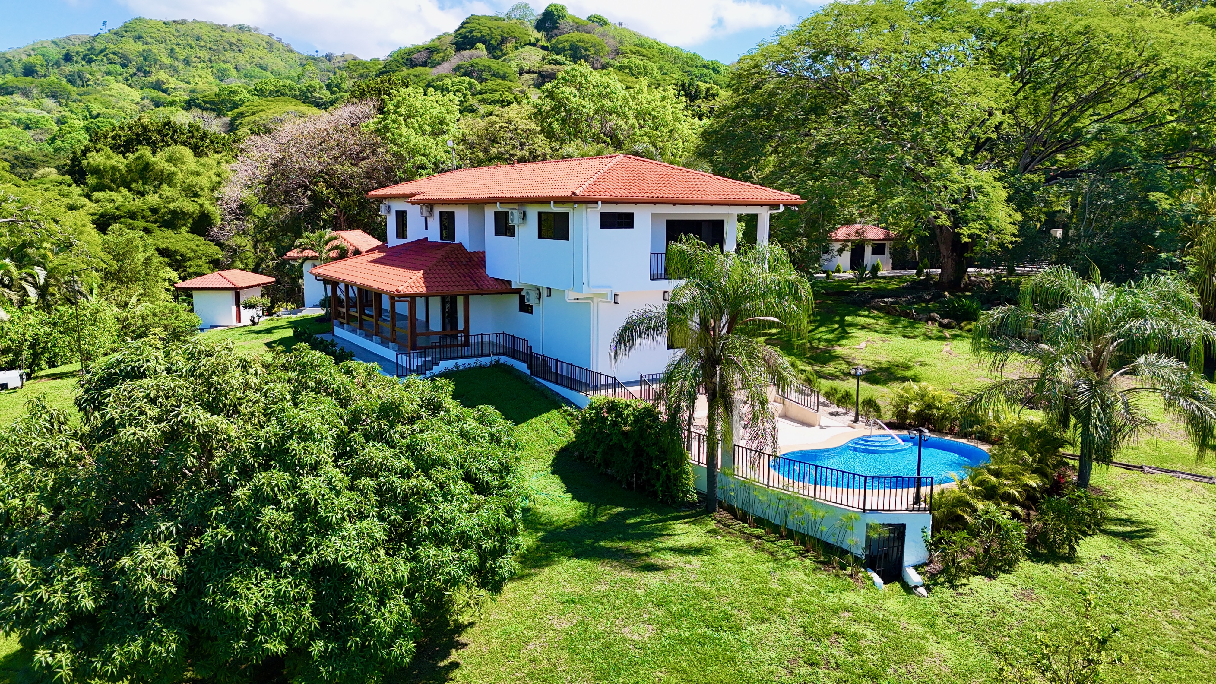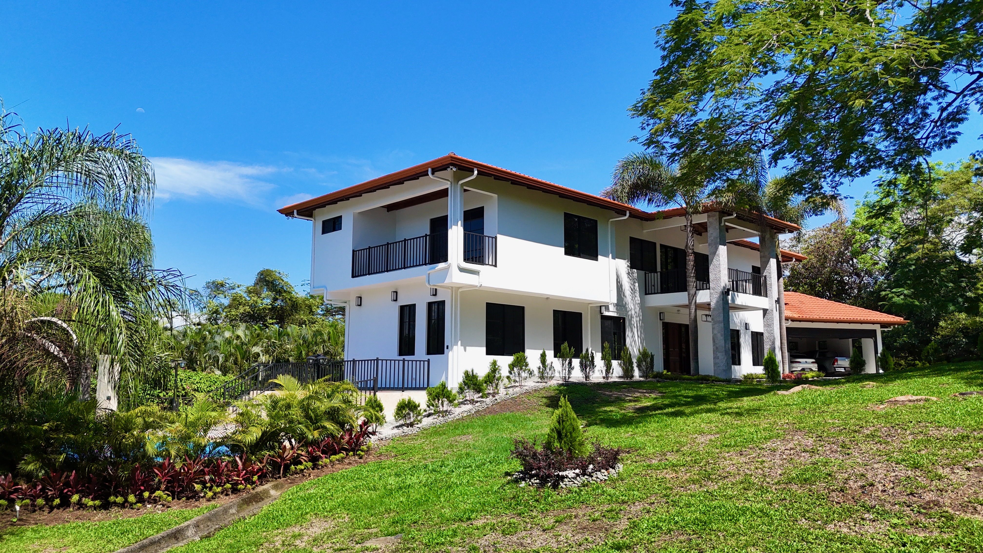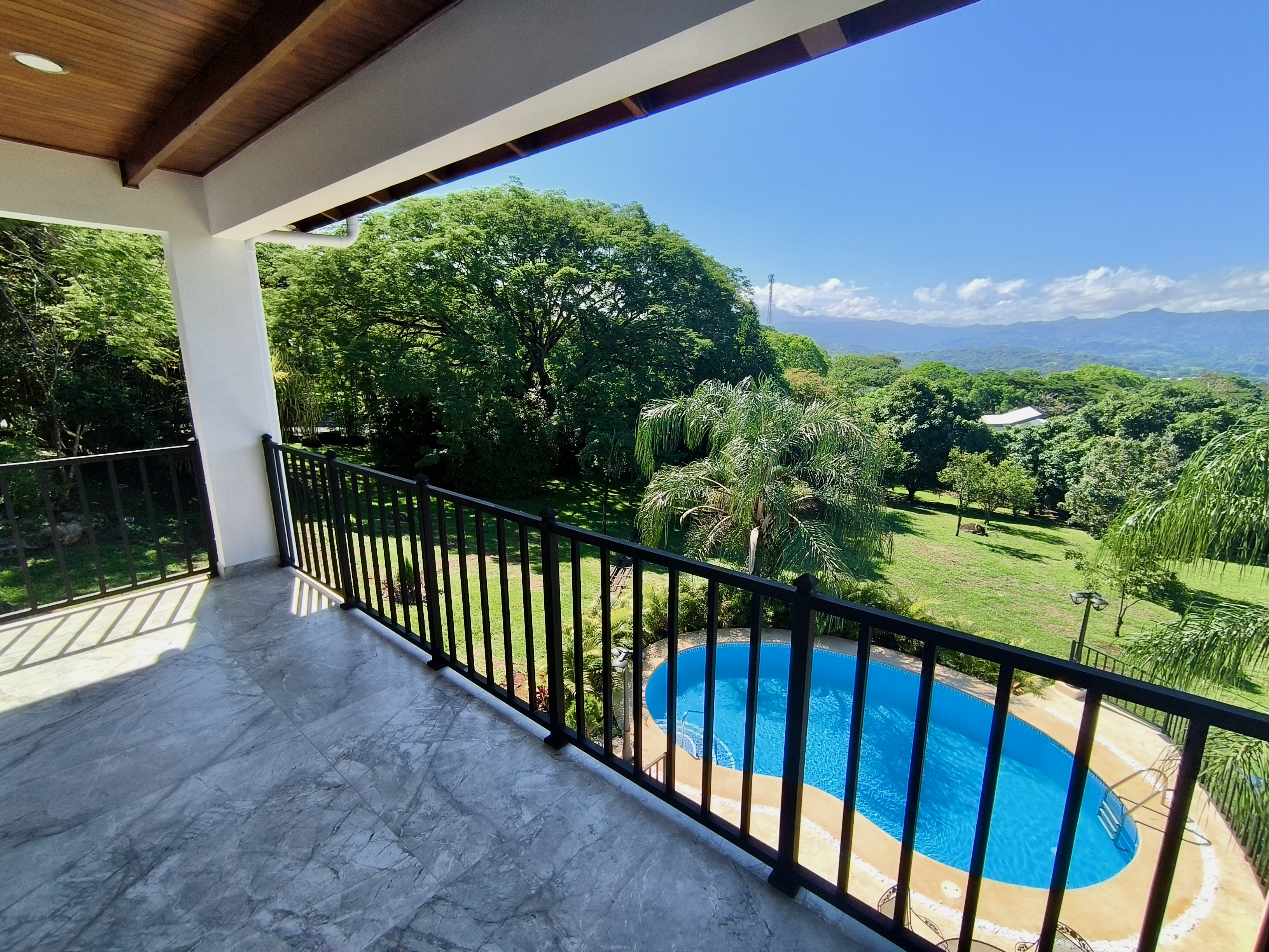 Experience the perfect blend of luxury, comfort, and nature in this impressive two-story home, set on a fully usable 7,000 m² (1.8 acres) lot. Surrounded by beautifully landscaped gardens, fruit trees, and iconic Guanacaste trees, the property offers tranquility while being just 10 minutes from Atenas and 5 minutes from Route 27, with easy access to Central Valley cities, the international airport, and Pacific coast beaches. Built in 2009 and fully renovated in 2025 with premium materials, the main floor features an open-plan living area, gourmet kitchen with pantry, laundry room, two-car garage, and a large bedroom with private en-suite and walk-in closet. Upstairs, three bedrooms each have en-suite bathrooms and walk-in closets with stunning mountain views. Smart home features, 14 security cameras, air conditioning, ceiling fans, and a naturally cool tiled roof enhance comfort. Outdoors, enjoy a Coralina-stone pool, terraces, and a guest/staff quarters.