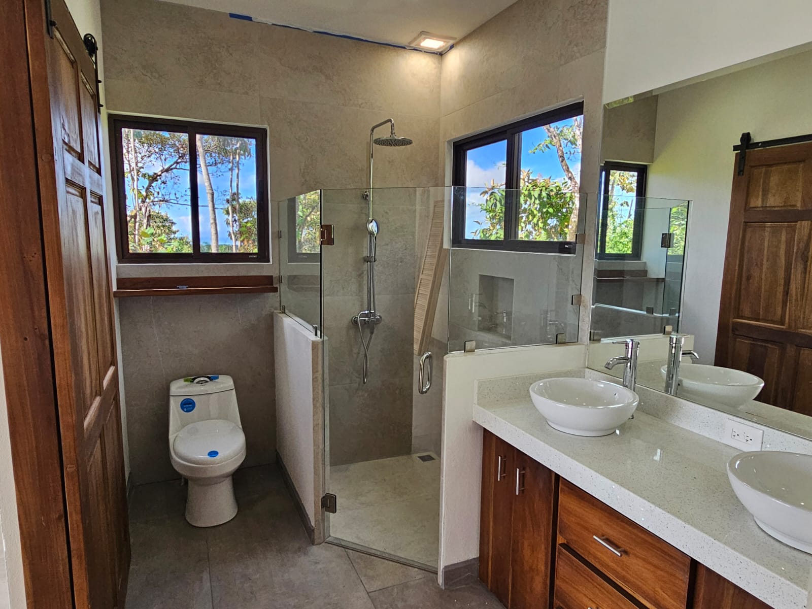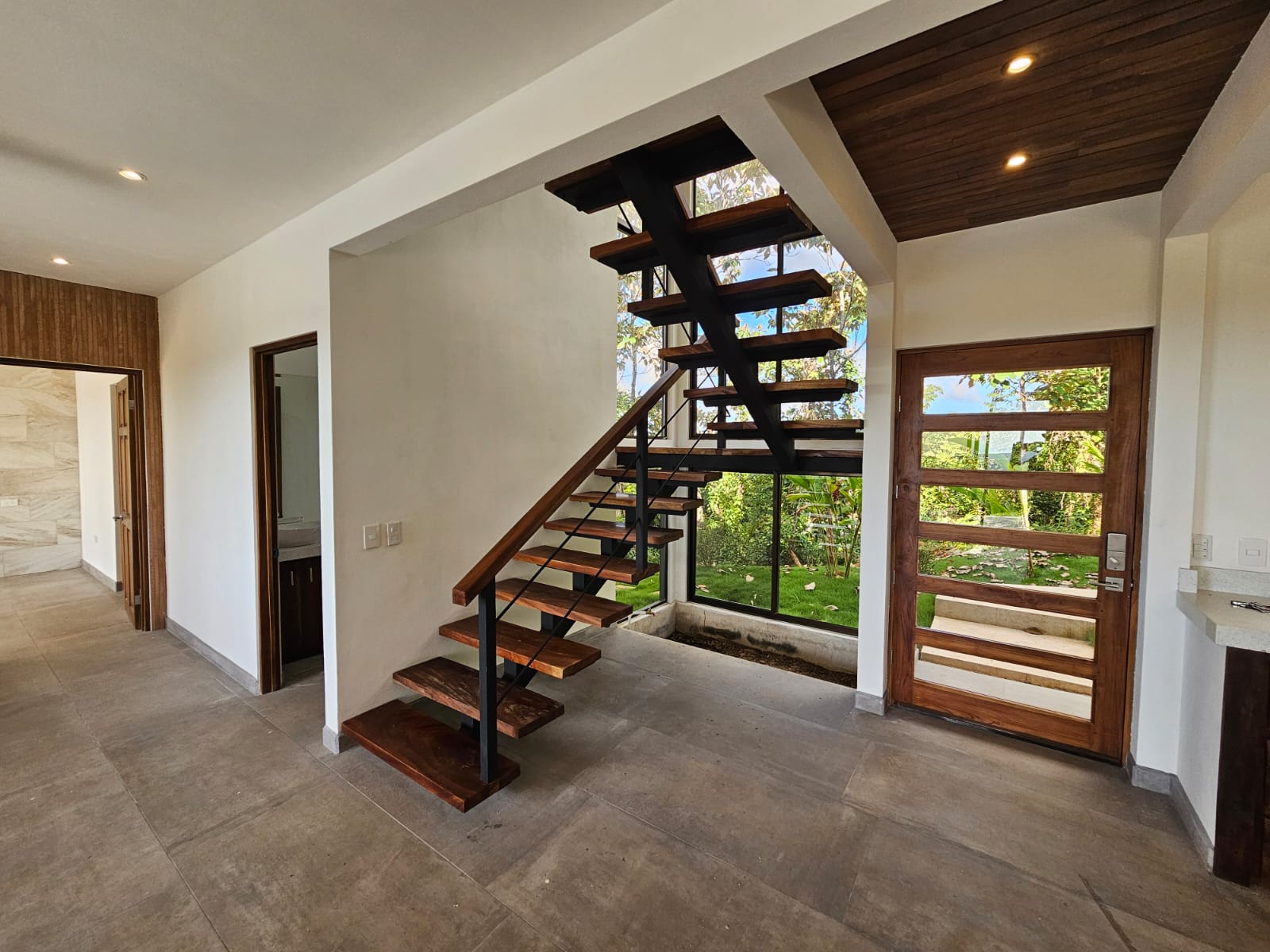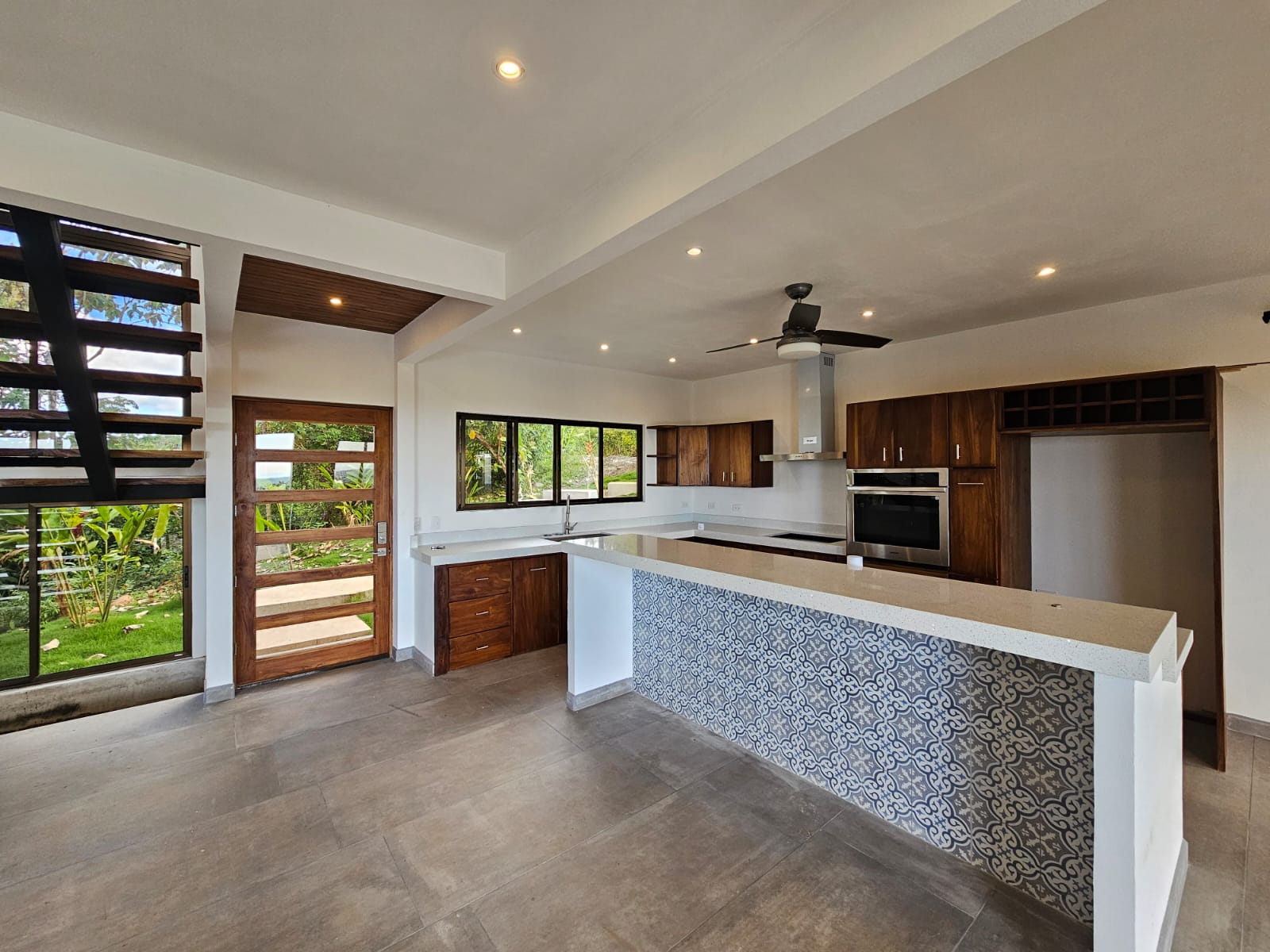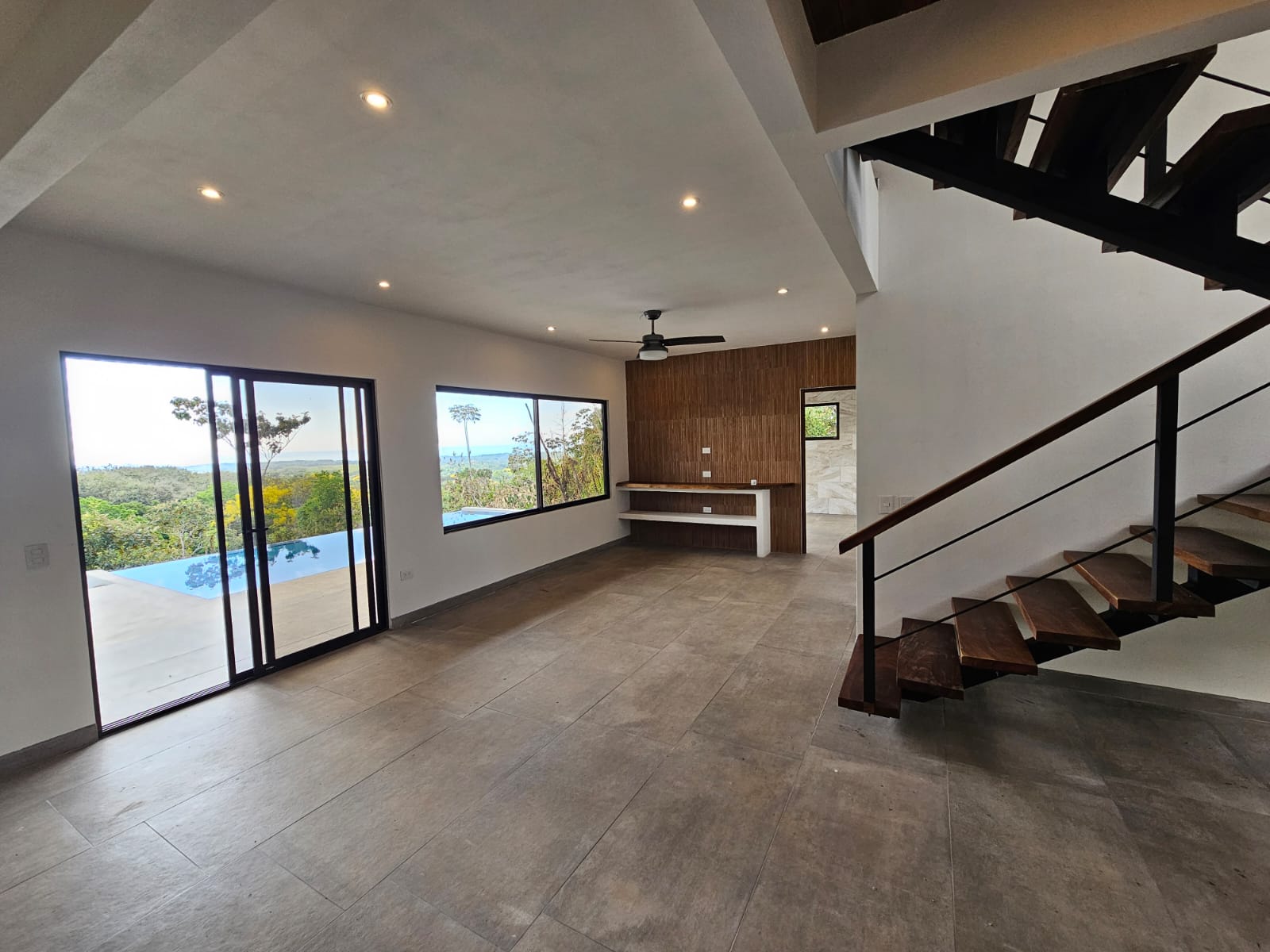 High-quality finishes are showcased throughout the home, including Spanish porcelain tile flooring, teak-accented ceilings, custom teak cabinetry, and quartz countertops. The bathrooms offer spa-like details with rainfall showers, while energy-efficient on-demand hot water heaters, LED lighting, and ceiling fans with remote controls in every room add everyday comfort and efficiency. A stunning custom Guanacaste hardwood floating staircase serves as a striking architectural focal point.