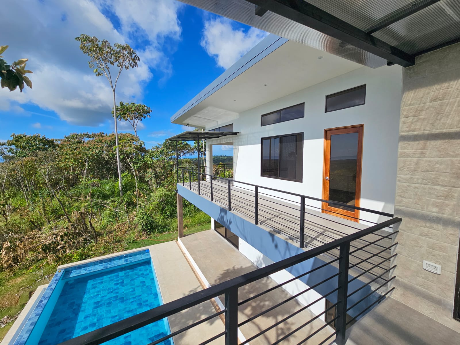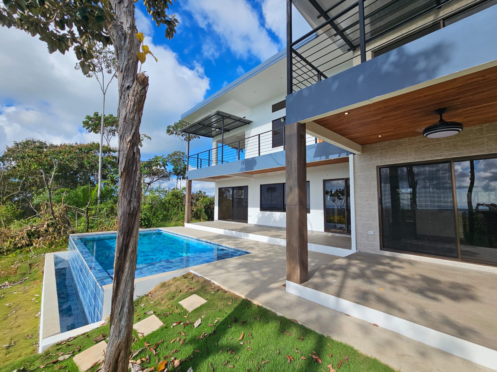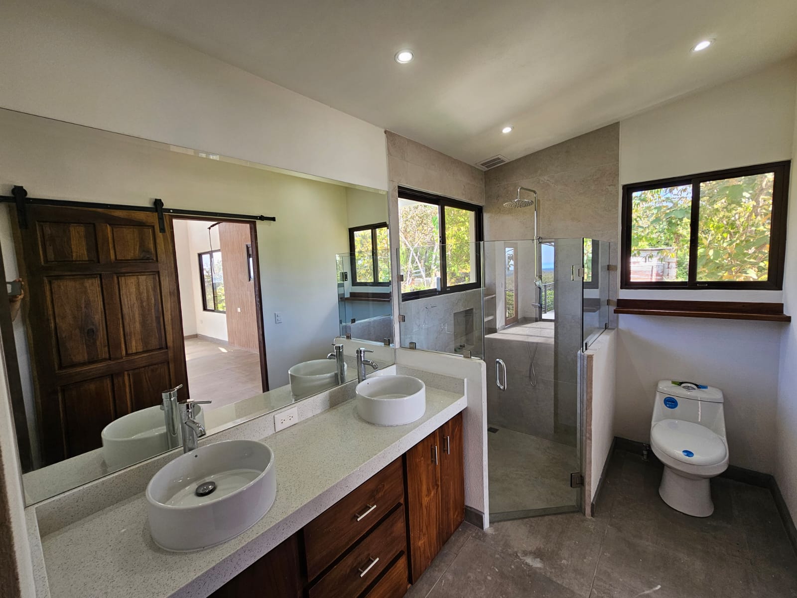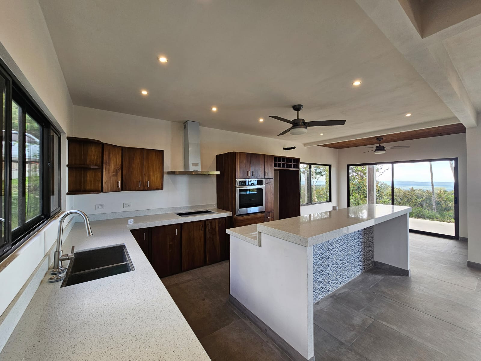 High-quality finishes are showcased throughout the home, including Spanish porcelain tile flooring, teak-accented ceilings, custom teak cabinetry, and quartz countertops. The bathrooms offer spa-like details with rainfall showers, while energy-efficient on-demand hot water heaters, LED lighting, and ceiling fans with remote controls in every room add everyday comfort and efficiency. A stunning custom Guanacaste hardwood floating staircase serves as a striking architectural focal point.