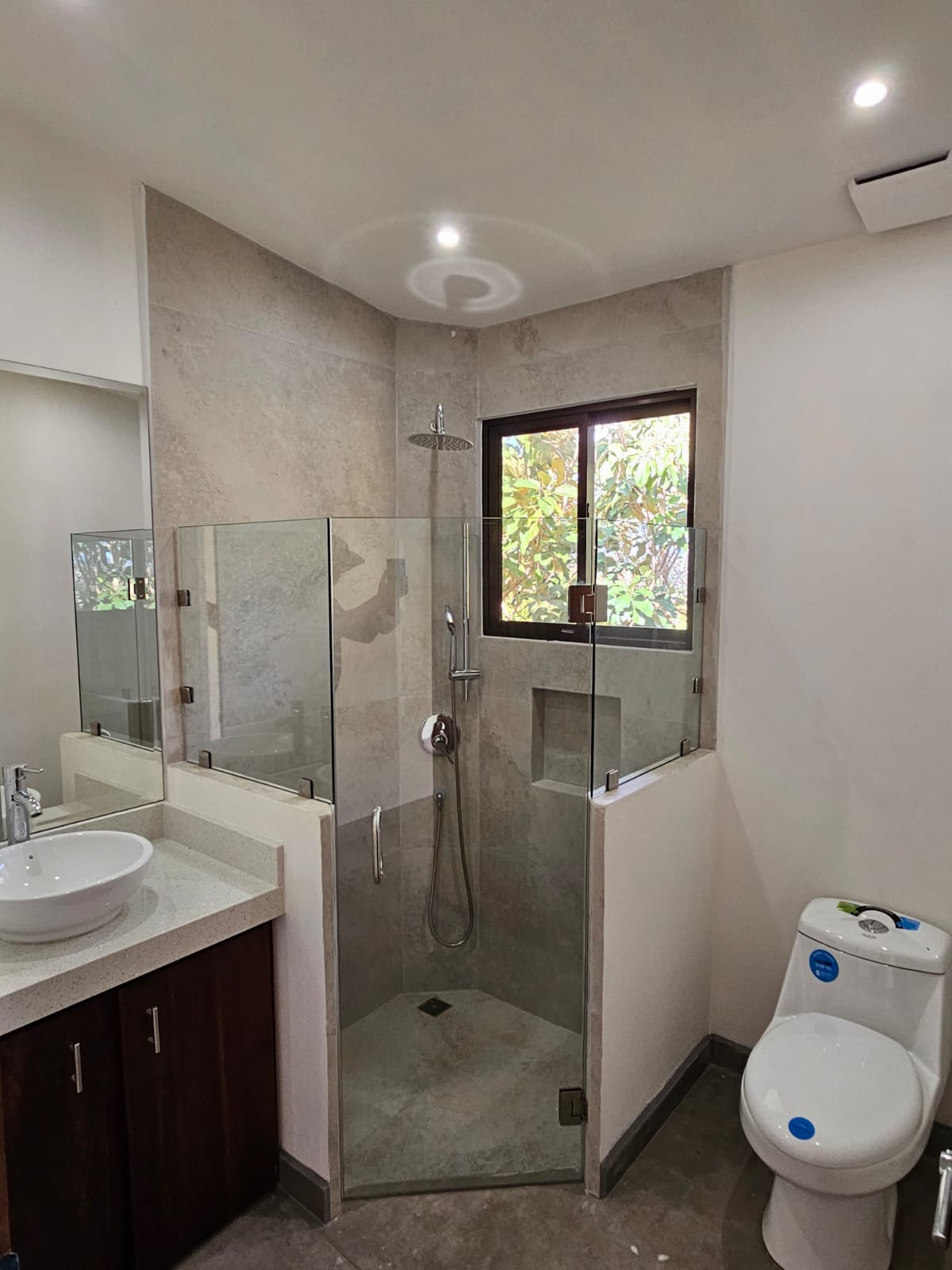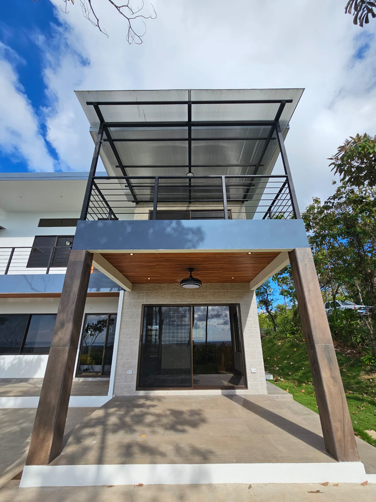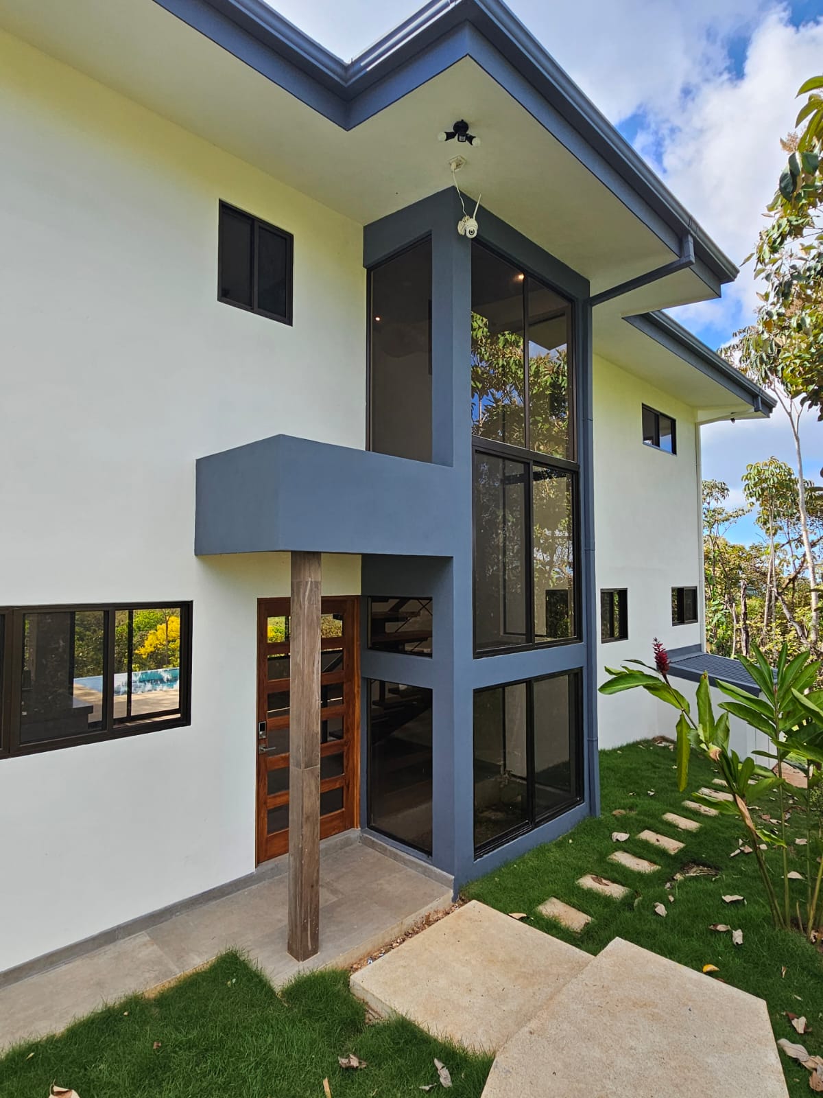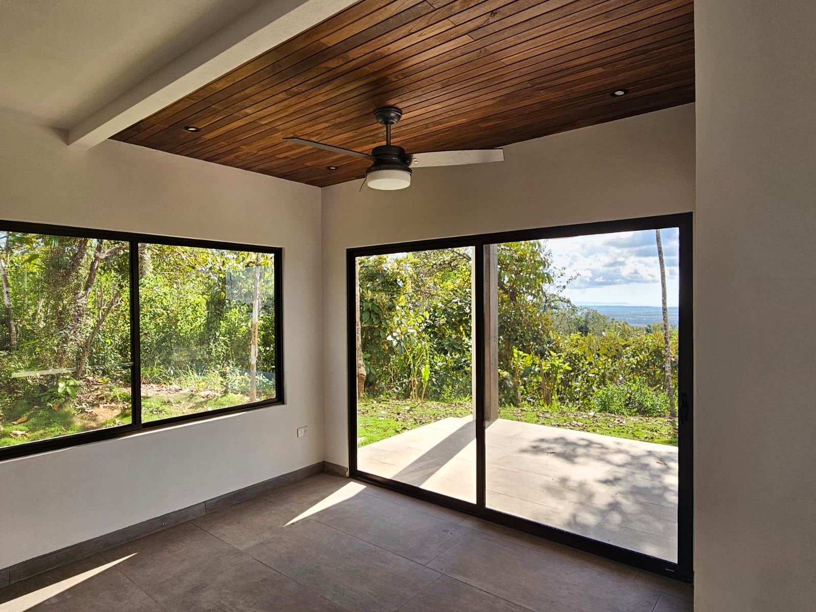 High-quality finishes are showcased throughout the home, including Spanish porcelain tile flooring, teak-accented ceilings, custom teak cabinetry, and quartz countertops. The bathrooms offer spa-like details with rainfall showers, while energy-efficient on-demand hot water heaters, LED lighting, and ceiling fans with remote controls in every room add everyday comfort and efficiency. A stunning custom Guanacaste hardwood floating staircase serves as a striking architectural focal point.