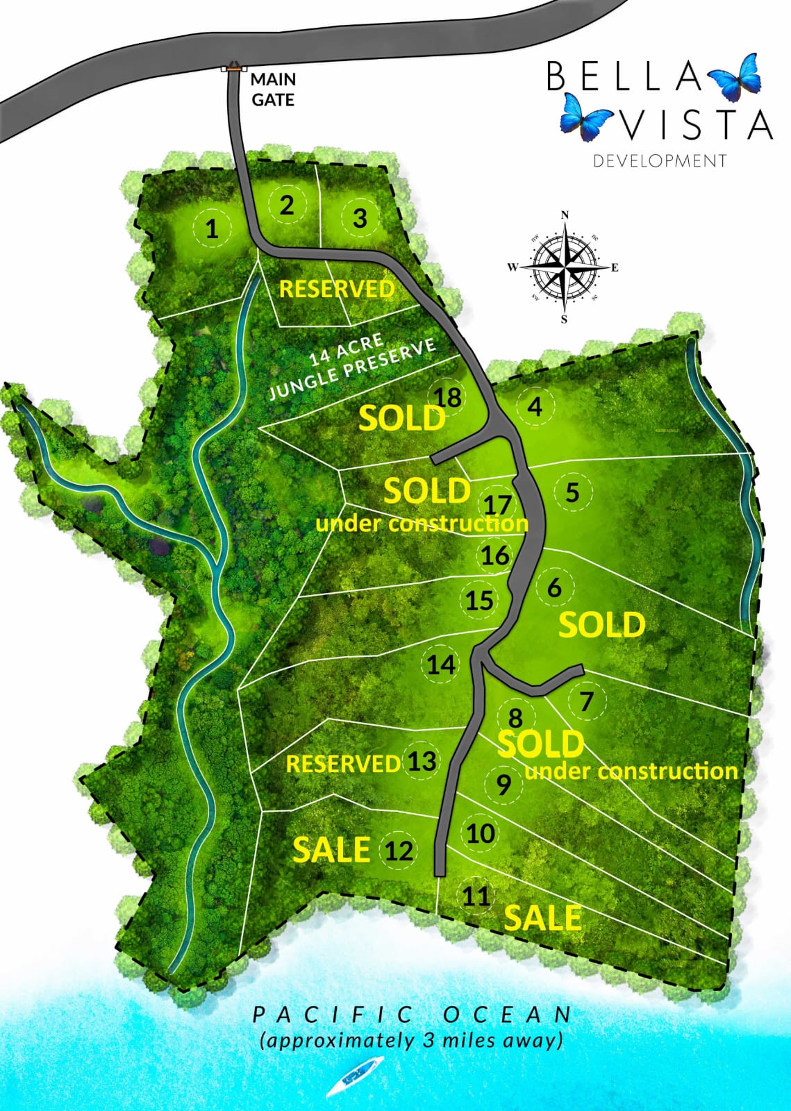 The property is located within the Bella Vista Gated Development, offering privacy and security with a gated entrance and access to a private 14-acre nature preserve complete with walking trails and abundant wildlife.